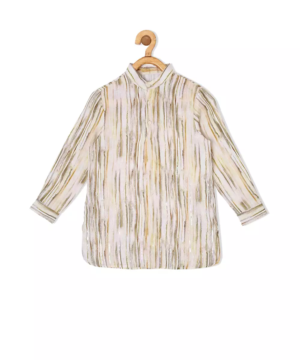 Upgrade Your Baby Boy's Festive Occasion Outfits With This Easy To Wear And Super Comfortable Linen Shirt Kurta. Tailored With A Mandarin Collar And Cuffed Sleeves, The Shirt With Intricate Embellishment Can Take Your Kid From Puja To Dinner With Family In Effortless Style.
