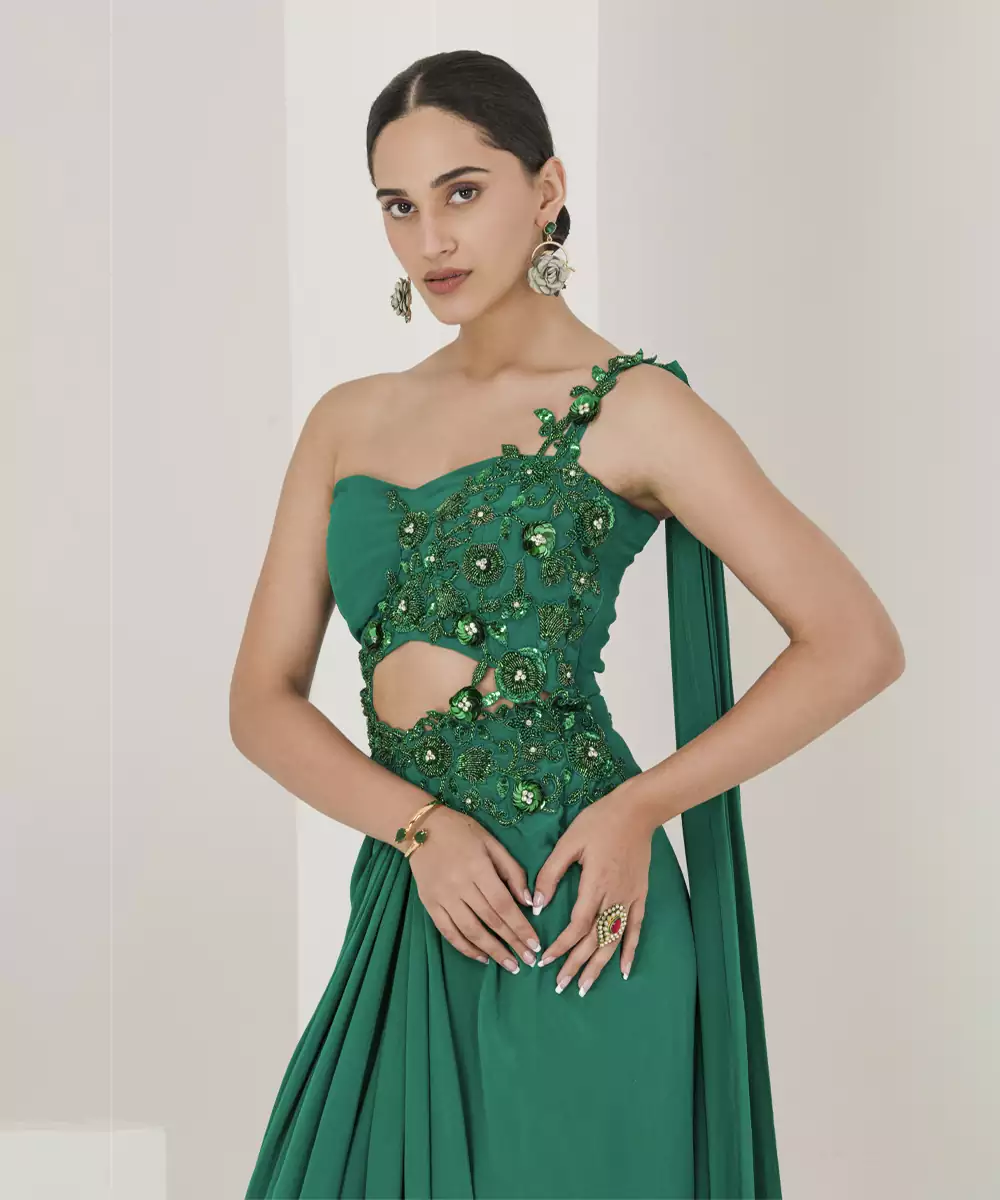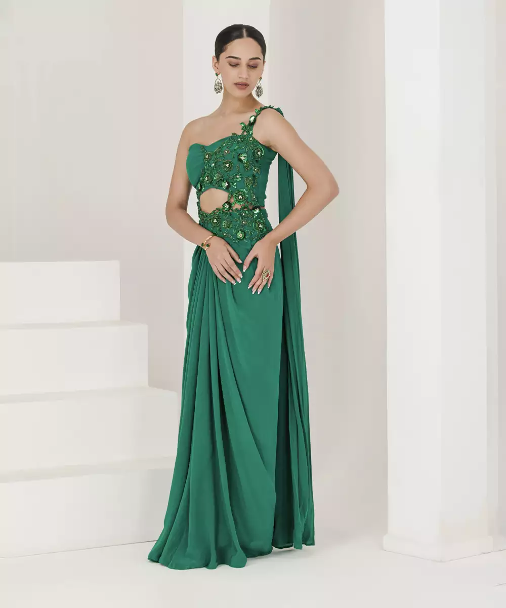 Introducing Our Indo Western Bottle Green Saree Gown, The Perfect Fusion Of A Traditional Saree And A Modern Gown. This Piece Is Made From Crepe, Making It Lightweight To Wear. The One Shoulder Design With Embroidered Floral Pattern Attached From Blouse To Saree Add A Touch Of Glamour To The Outfit.