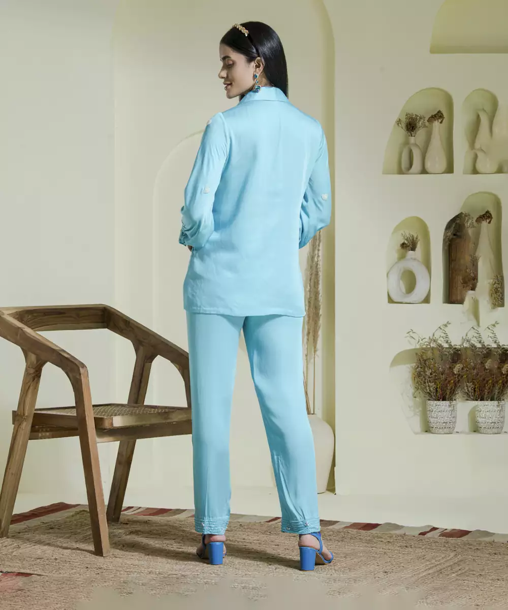 Showcase Your Effortless Chic Style By Stepping Out In This Beautiful Yet Comfortable Pant Set Handcrafted With Pearl Heart Motifs All Over The Shirt. The Usp Of Shirt Is The Cuff Style Embroidered With Delicate Glass Beads And Pearls. This Shirt Is Paired With Same Coloured Straight Pants Which Is Also Embroidered In Style.