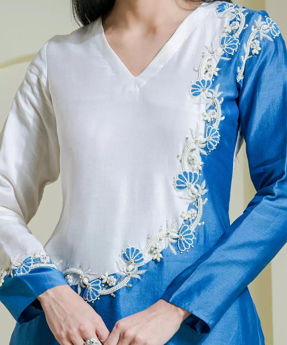 Exude Timeless Grace In Our White And Blue Chanderi Kurta Set Perfect For Any Festivities.The Kurta Set Is Made With Chanderi Silk Fabric,Embellished With Sequins,Beads And Glass Beads Hand Embroidered Floral Pattern.