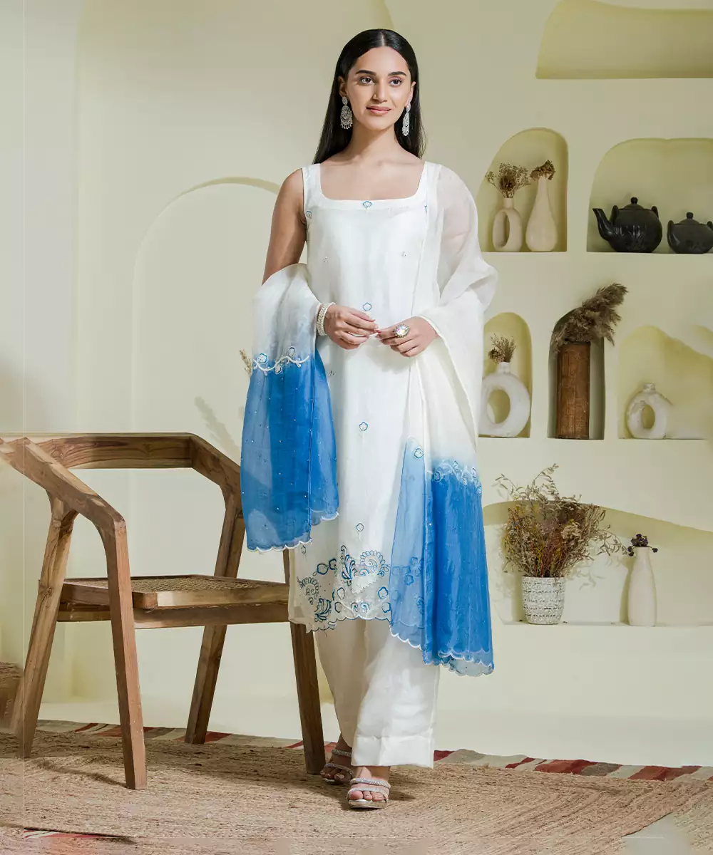 Step Into Elegance With Our Super White Organza Three Piece Kurta Set.It Showcases Intricate Resham Work Detailing In Contrast Blue Colour Mixed With Pearls And Glass Beads.Paired With White And Blue Shaded Dupatta