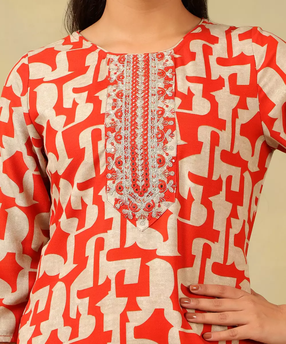 Make A Bold And Contemporary Statement With The Advika Set, Featuring A Striking Crimson Red Geometric Abstract Print Usp. This Sophisticated Suit Set Is Rendered In A Vibrant Red And Ivory Palette, Adorned With An All Over Interlocking Geometric Motif. The Kurta Is Elevated By A Detailed Round Neckline With A White Sequin Embellished Embroidered Central Panel, Offering A Touch Of Refined Shimmer For Festive Wear. Paired With Coordinating Vertical Striped Trousers And A Matching Lightweight Dupatta That Mirrors The Abstract And Striped Patterns, This Ensemble Provides A Cohesive, Modern Ethnic Silhouette.