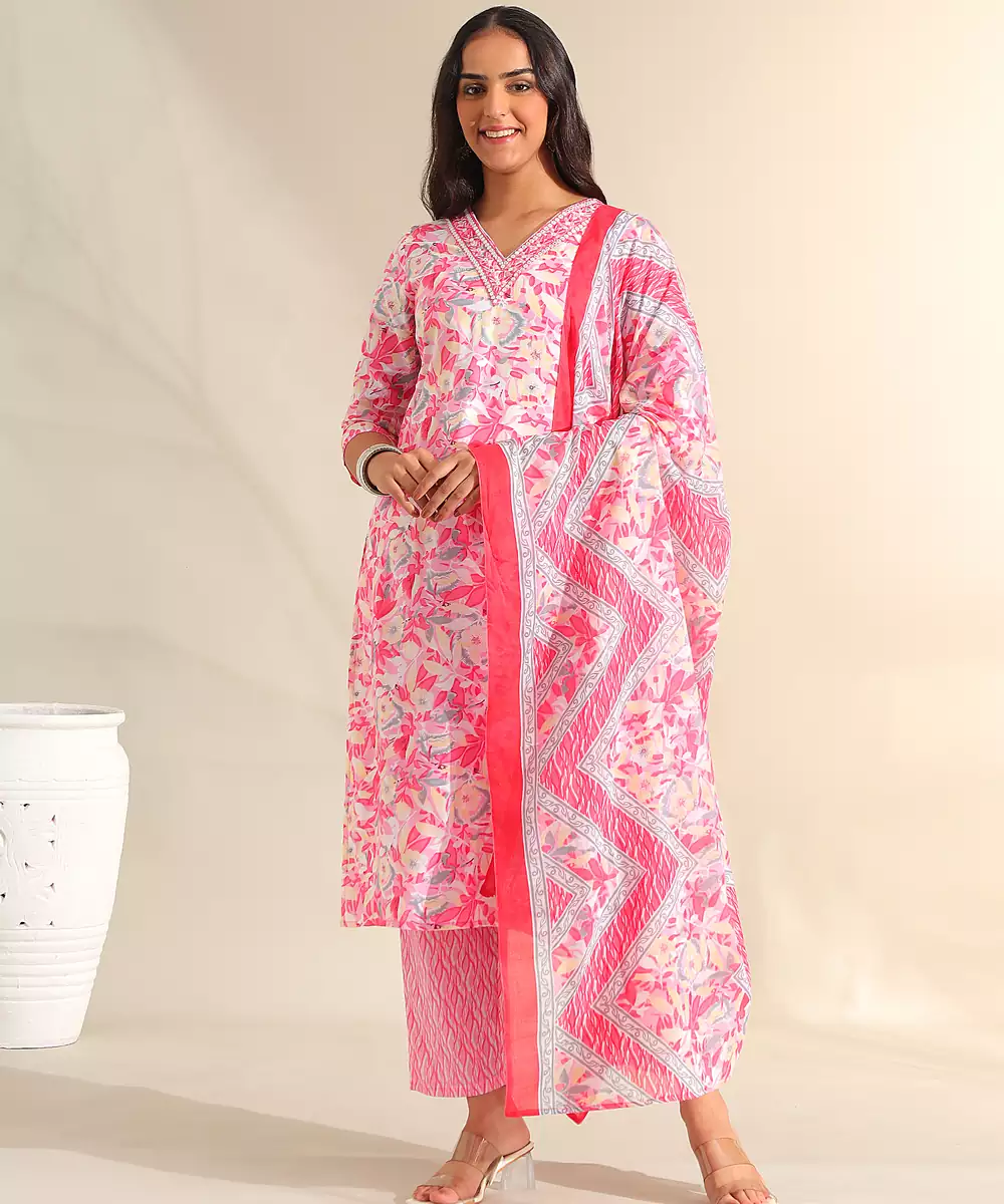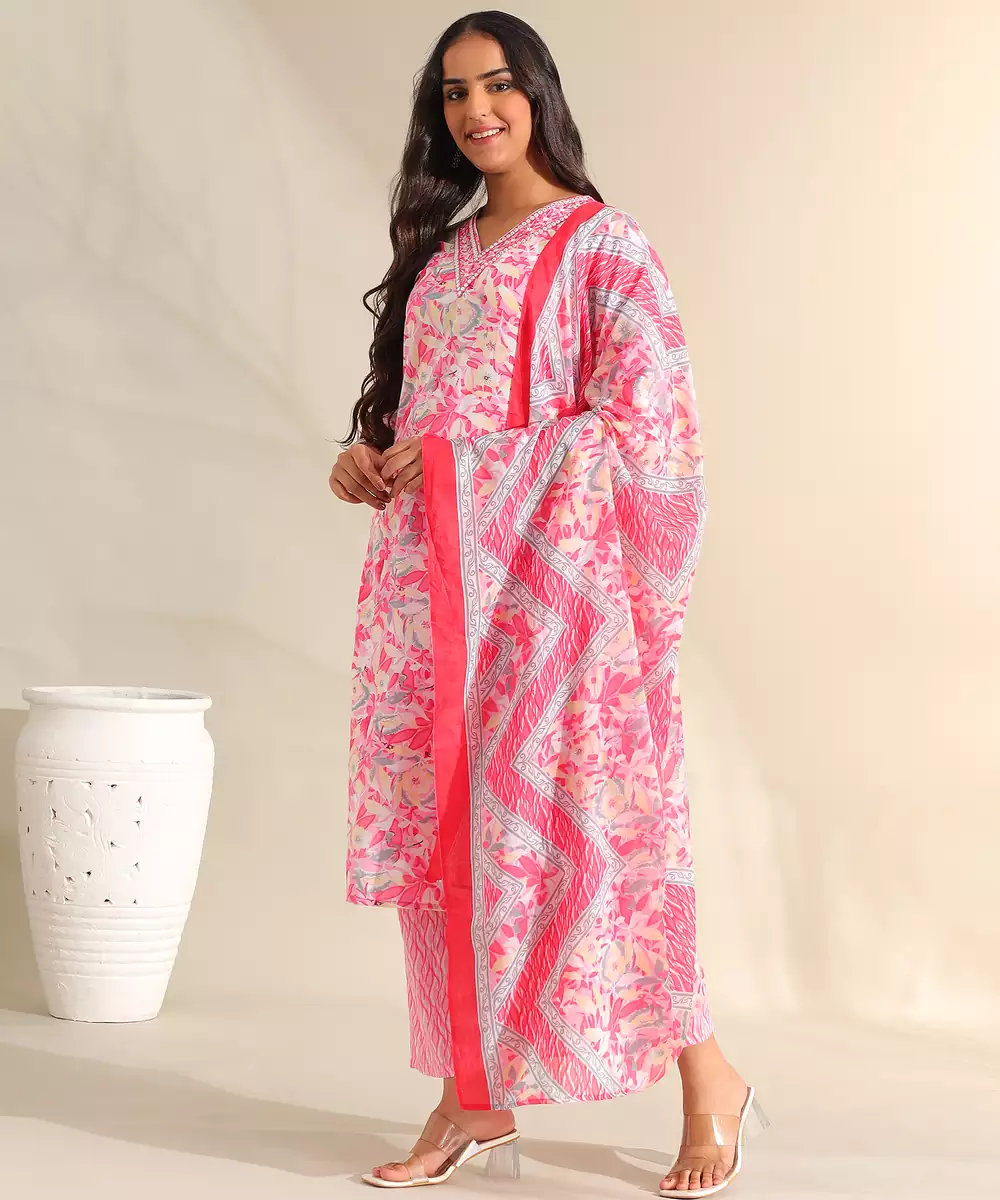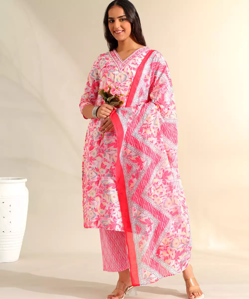 Step Into A Floral Fantasy With The Ahana Set, Featuring A Romantic Pink And Yellow Watercolor Floral Print Usp. This Dreamy Suit Set Is Rendered In A Soft Rosewater Pink And Lemon Yellow Palette, Adorned With An All Over Layered Botanical Floral Motif. The Kurta Is Beautifully Elevated By A V Neckline Featuring A Detailed Embroidered Border And A Shimmering Sequin Embellished Yoke, Providing A Delicate Festive Glow. The Ensemble Is Completed With Coordinating Light Pink Chevron Patterned Trousers And A Matching Lightweight Dupatta With A Bold Floral And Geometric Border, Offering A Graceful, Artistic Silhouette.
