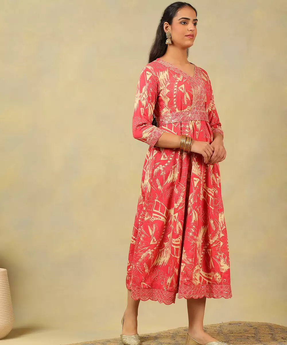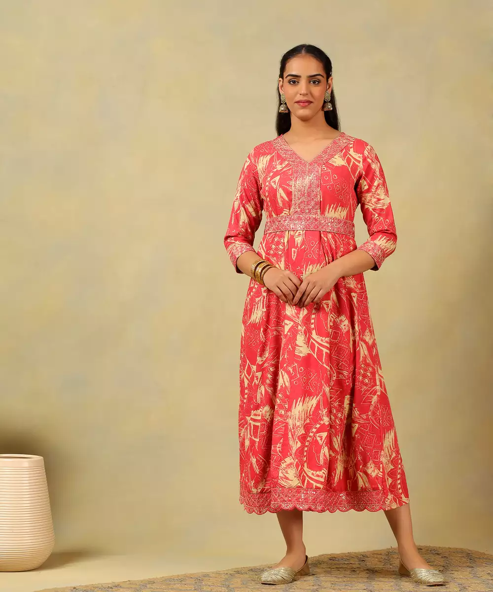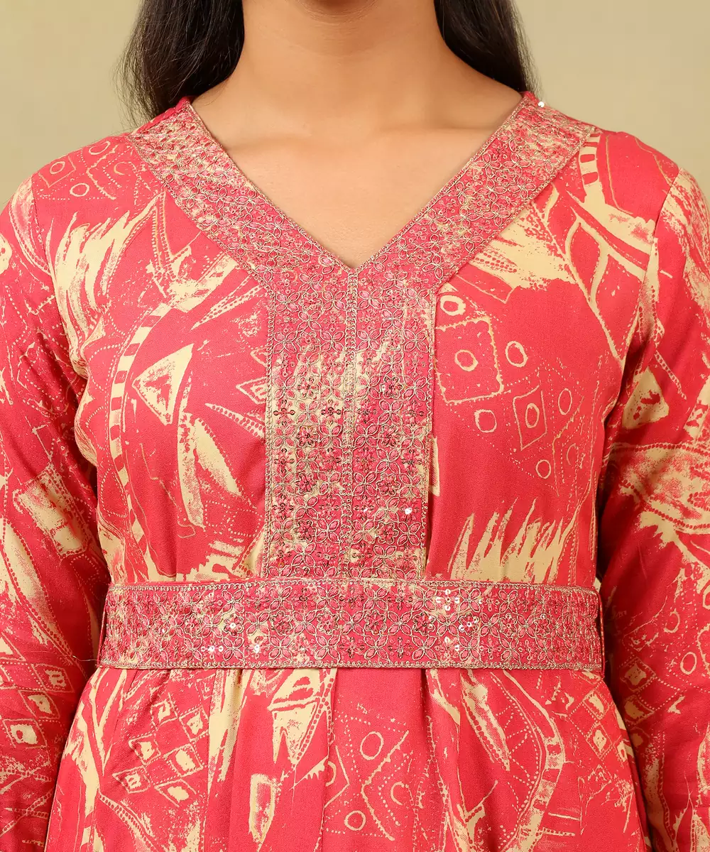 Step Into The Spotlight With The Anvi Gown, Featuring A Captivating Crimson Abstract Bloom Print Usp. This Flowy Floor Length Silhouette Is Adorned With Large, Artistic Cream Colored Botanical Strokes Against A Rich Berry Red Base. The Dress Is Elegantly Defined By Its Sequined Empire Waist Belt And A Matching V Neckline Border, Further Enhanced By A Delicate Scalloped Embroidered Hem For A High Fashion Festive Indian Look.