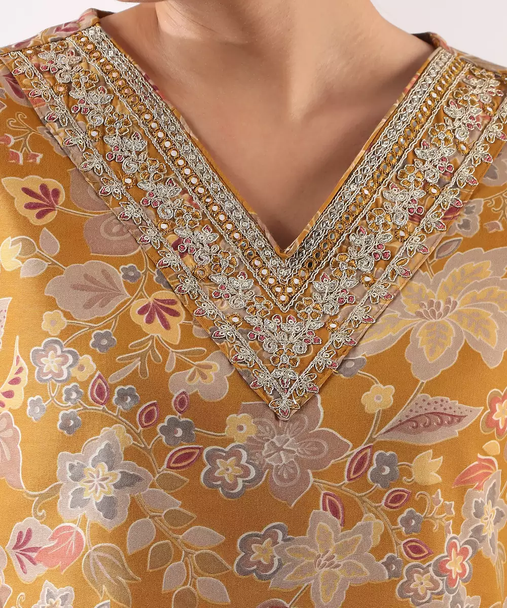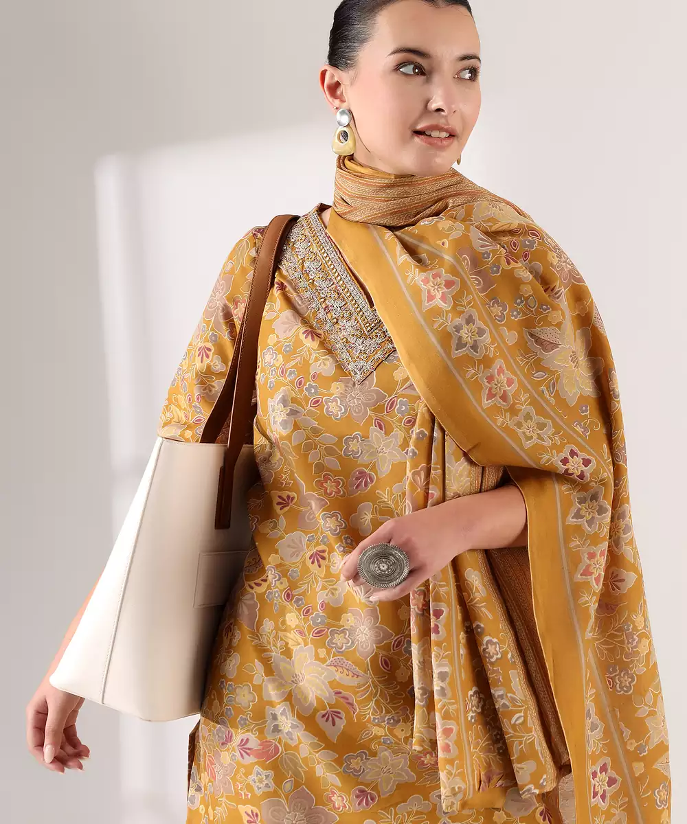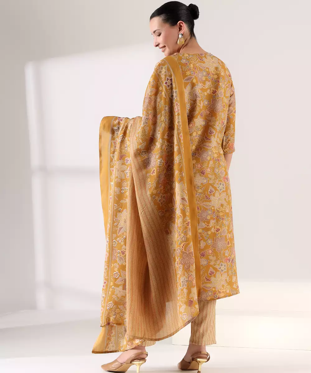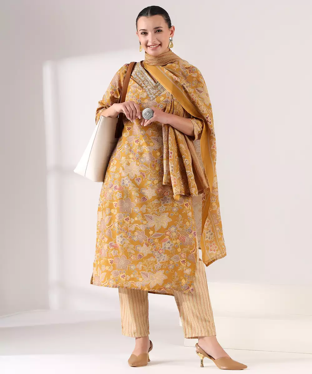 Radiate Elegance In The Basanti Bahaar Suit Set, A Stunning 3 Piece Ensemble In A Rich Mustard Gold Hue. This Set Features A Straight Cut Kurta Drenched In An Antique Botanical Tapestry Print With Muted Earthy Tones. The Highlight Is The Deep V Neckline, Meticulously Detailed With A Thick Embroidered Border Of Geometric Zari And Thread Work. Paired With Modern Vertical Pinstripe Trousers And A Matching Floral Dupatta, It Offers A Perfectly Tailored Look For Festive Gatherings Or Sophisticated Daywear.