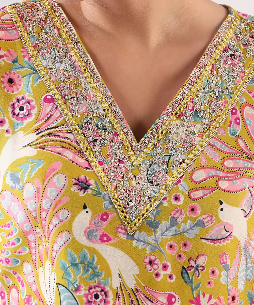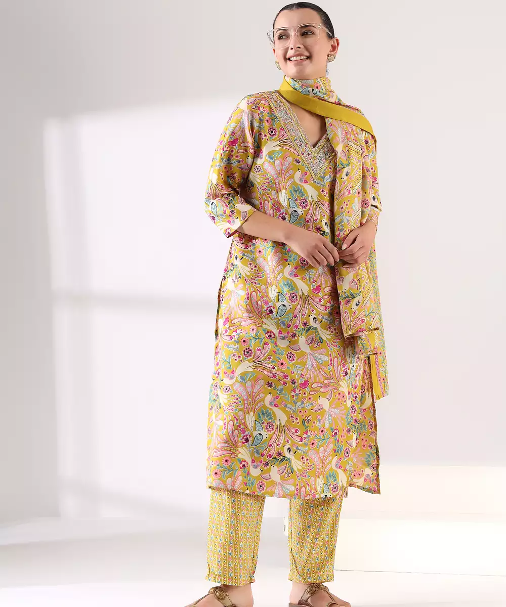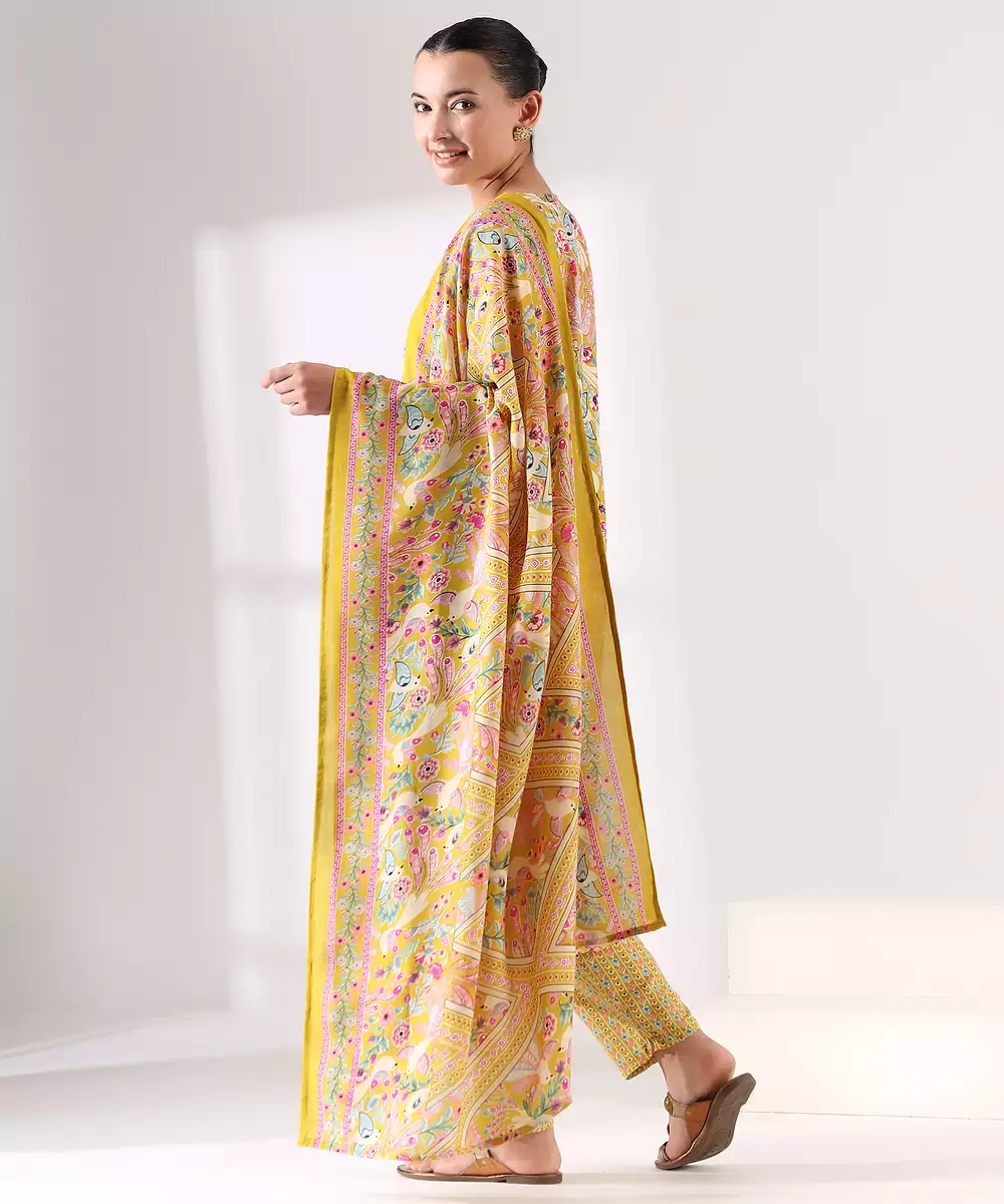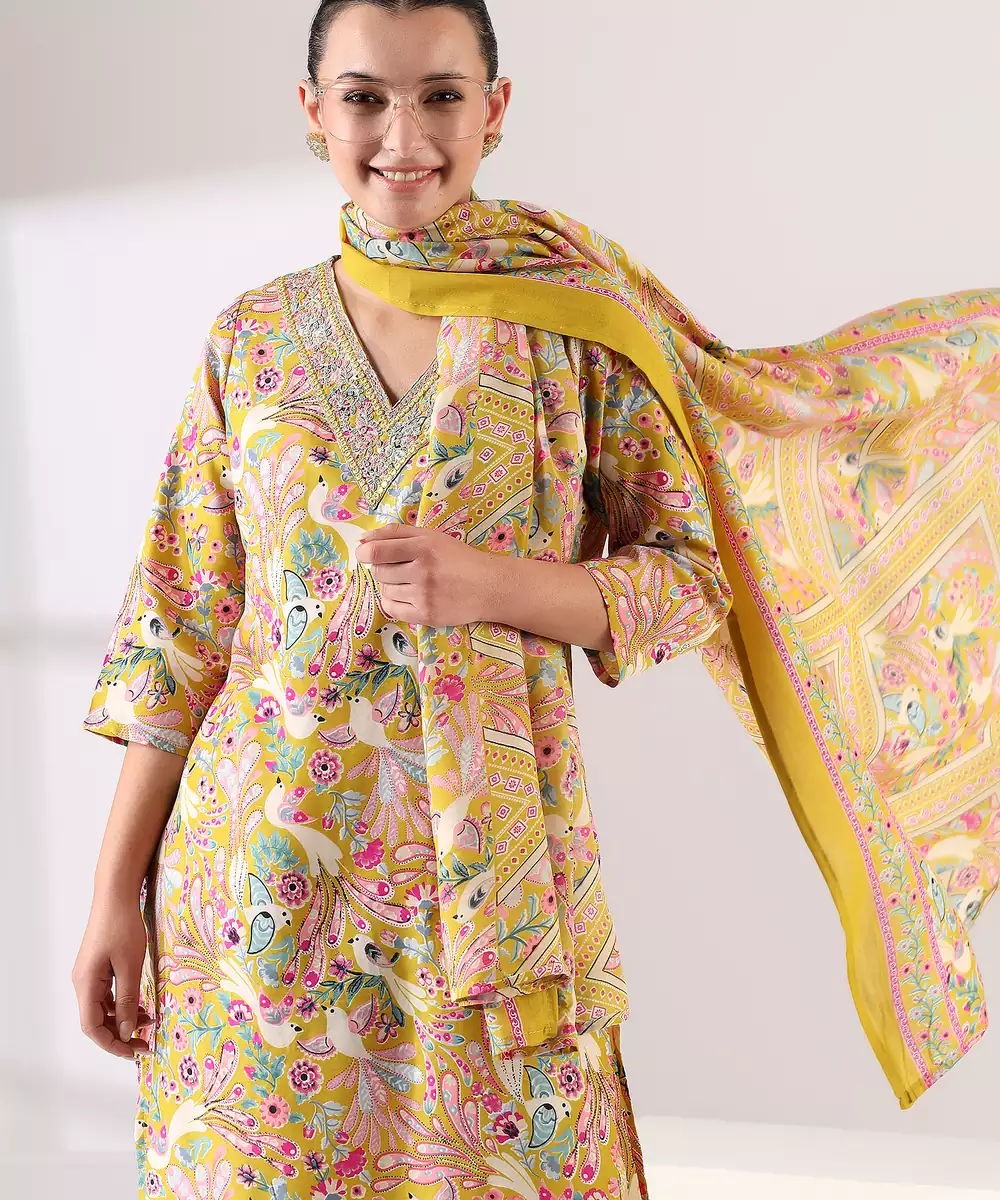 Radiate Sunshine And Traditional Charm With Our Basanti Peacock Suit Set. This Vibrant 3 Piece Ensemble Features A Rich Mustard Yellow Base Adorned With A Spectacular Large Scale Floral And Peacock Motif Print In Shades Of Turquoise, Candy Pink, And White. The Straight Cut Kurta Is Crowned With A V Neckline, Meticulously Detailed With A Shimmering Geometric Zari And Thread Work Border. Designed For Festive Daytime Celebrations, This Set Is Finished With Coordinating Butti Print Trousers And A Matching Dupatta, Ensuring You Stand Out With Grace.