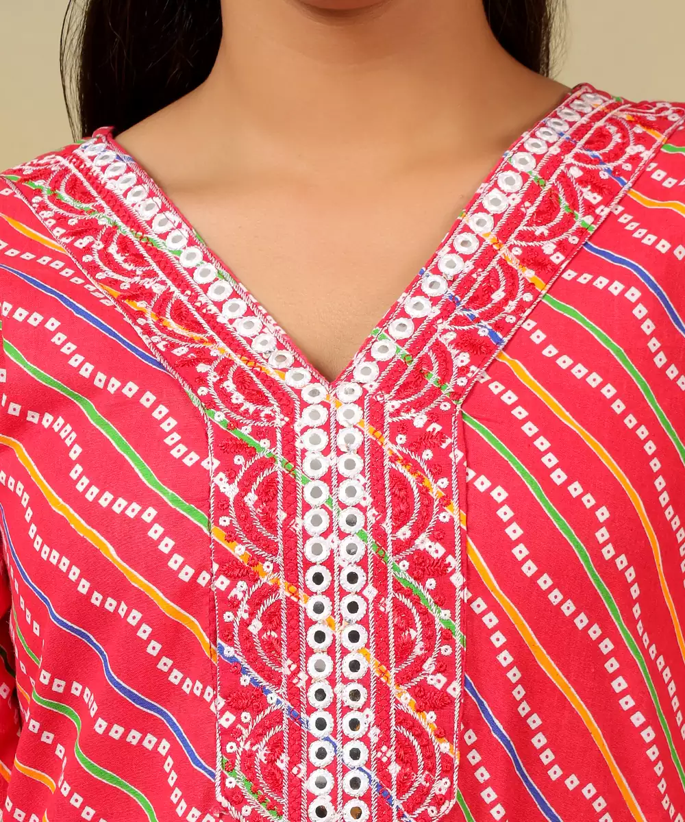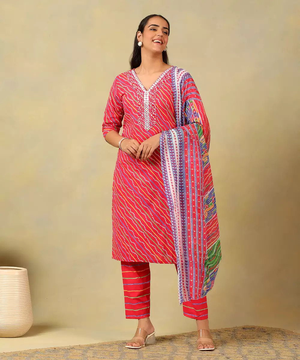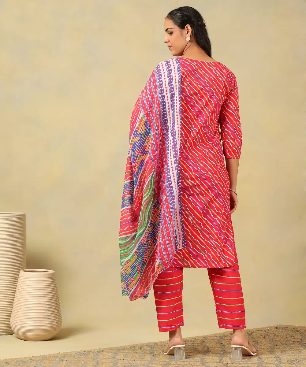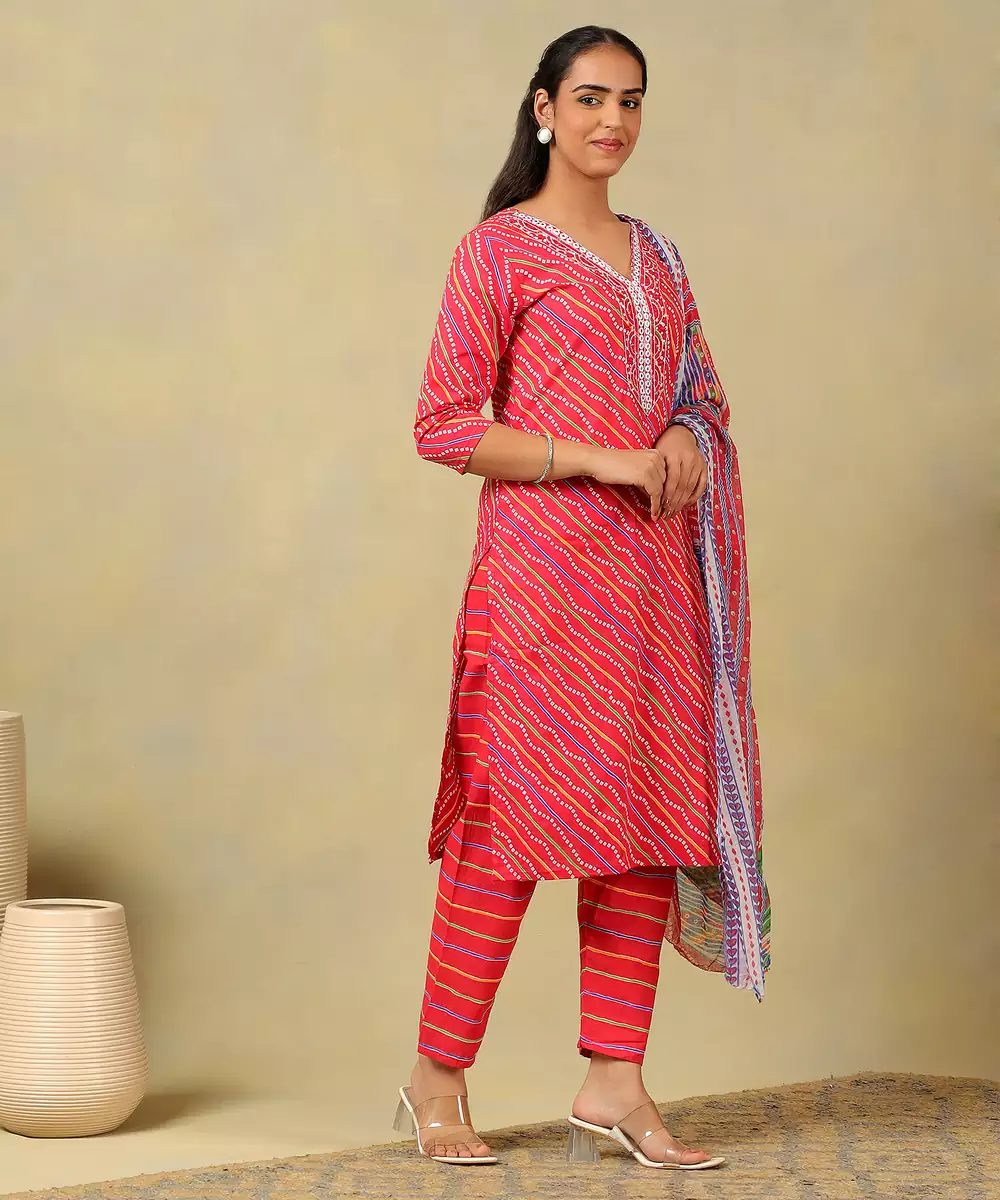Embrace Vibrant Tradition With This Three Piece Leheria Print Kurta Set. Crafted From Breathable Cotton, The Straight Cut Kurta Features A Stunning Rose Red Diagonal Print Highlighted By Intricate White Gota Patti Embroidery At The Neckline. Paired With Coordinating Horizontal Striped Trousers And A Multi Colored Dupatta For A Modern Contrast, This Set Perfectly Balances Ethnic Charm With Contemporary Style.