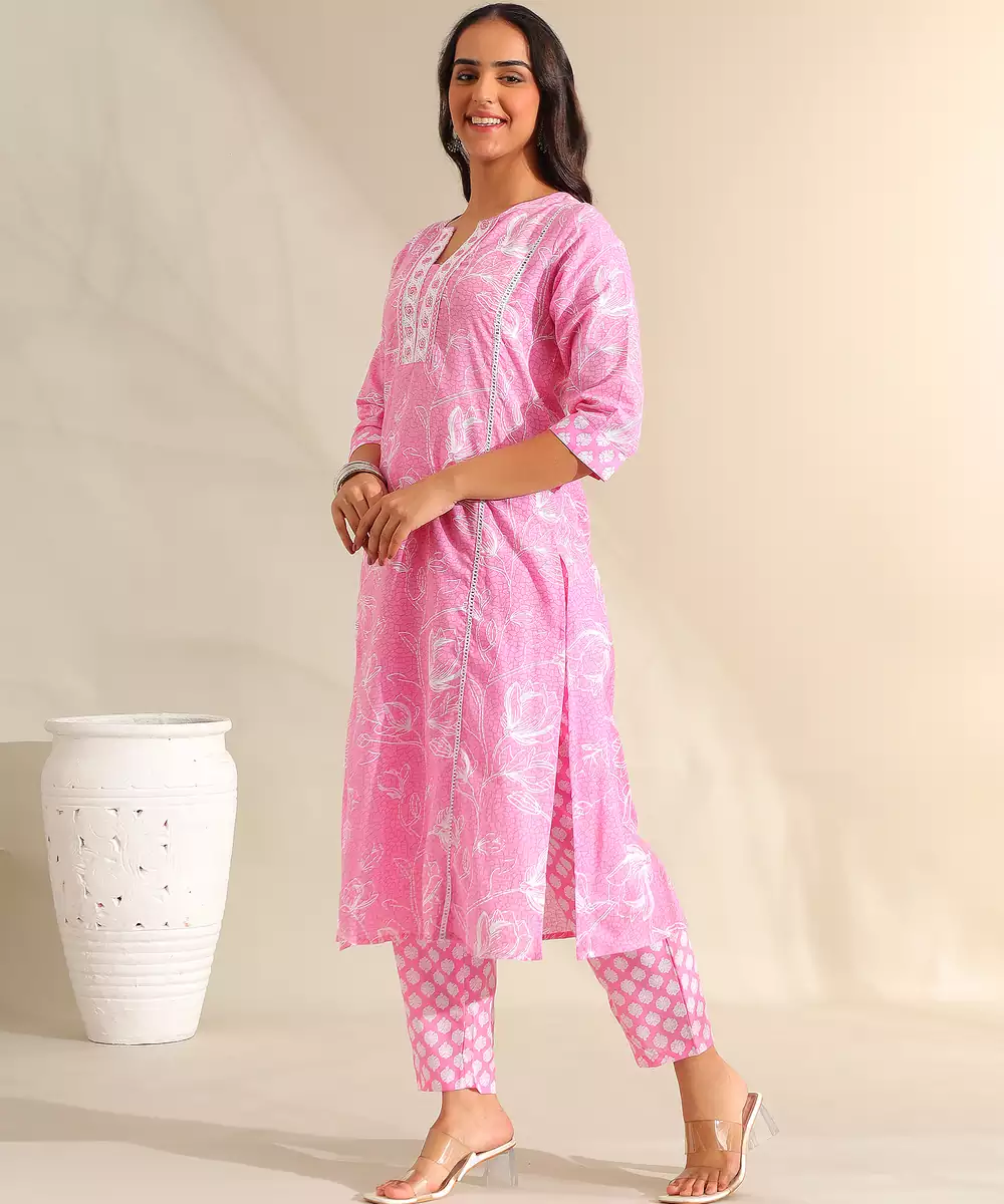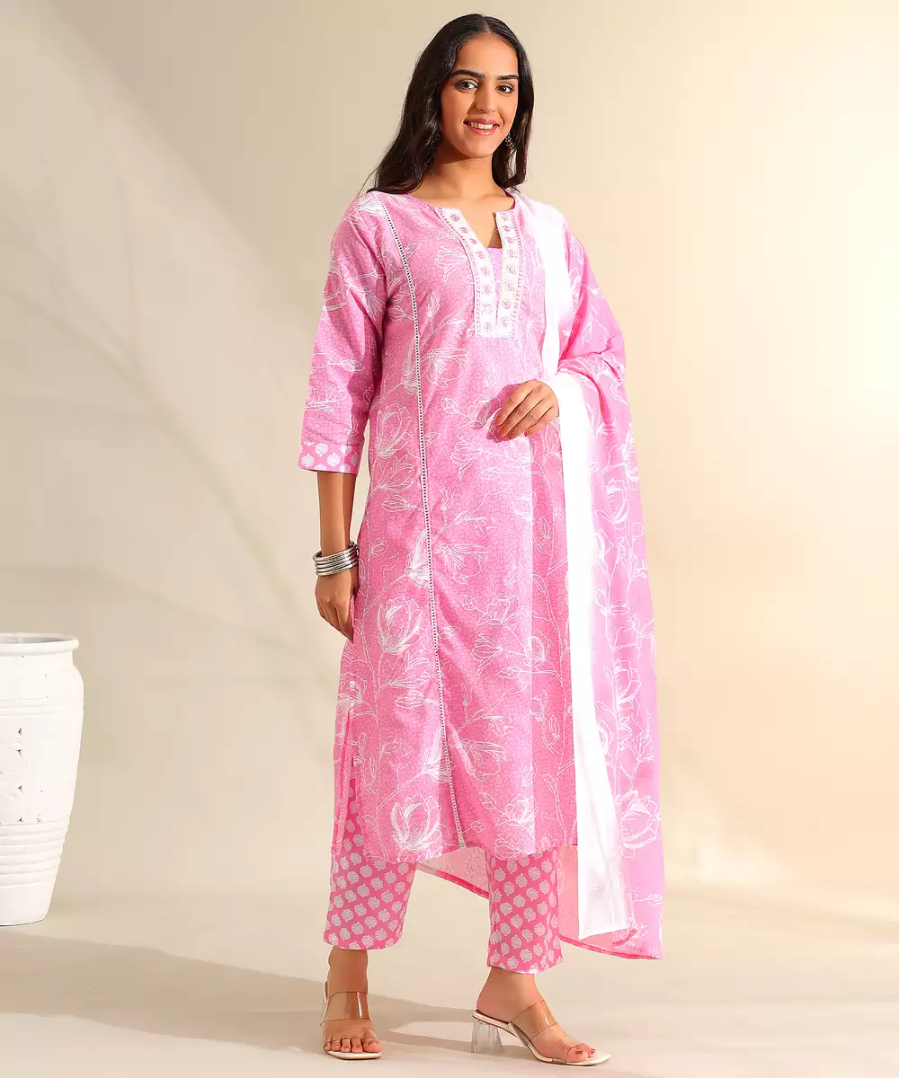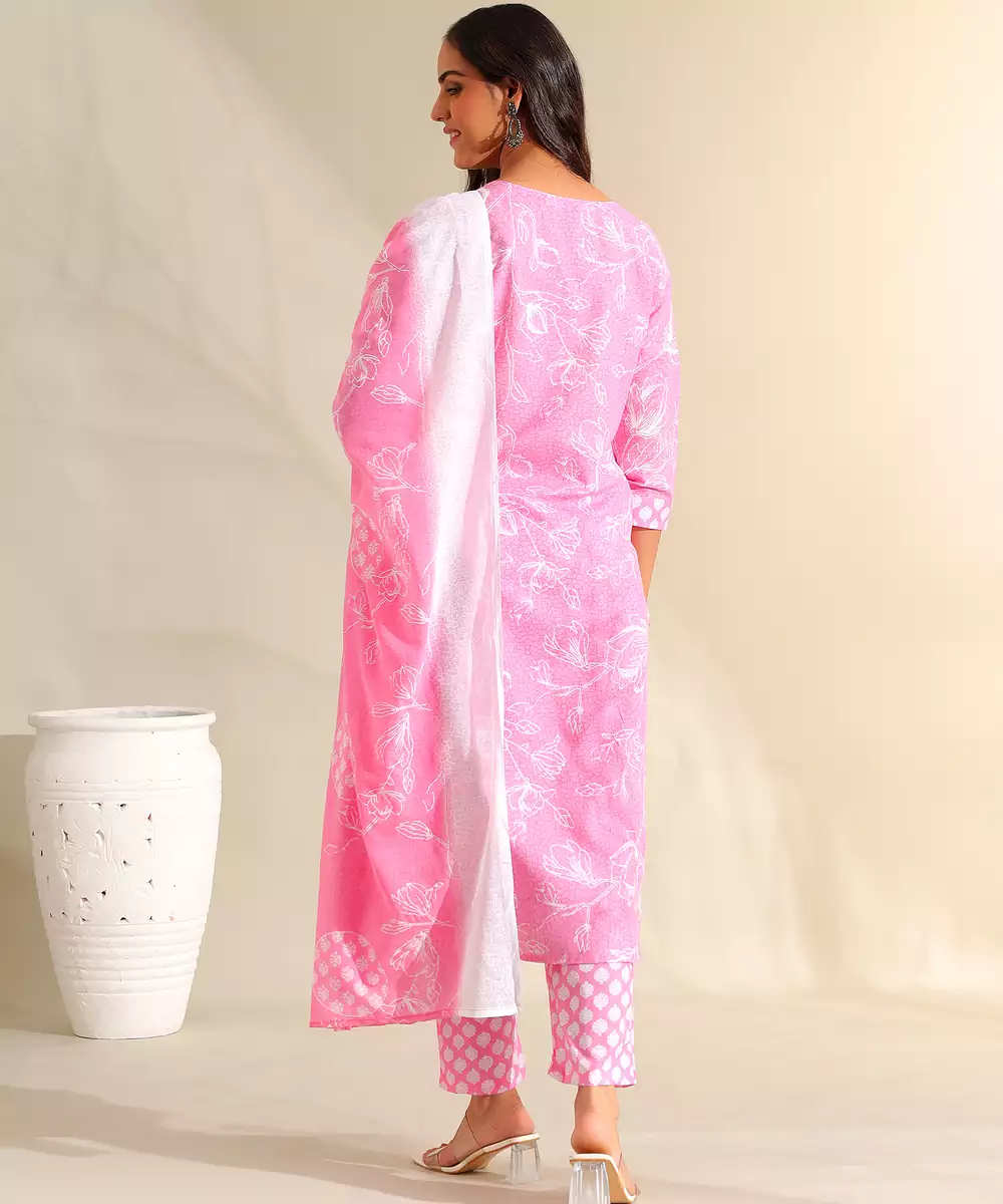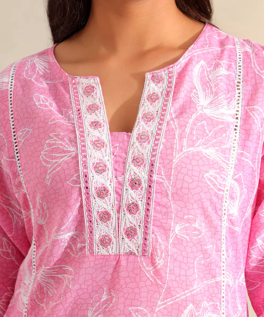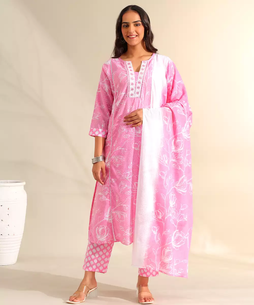 Step Into The Season With The Eshani Set, Featuring A Vibrant Candy Pink Garden Floral And Mirror Work Usp. This Refreshing Suit Set Is Rendered In A Bright Pink Hue And Is Adorned With A Delicate All Over White Lily Botanical Print. The Kurta Is Beautifully Detailed With Intricate White Lace Panels At The V Neckline Featuring Subtle Mirror Style Embroidery And Vertical Lace Inserts That Create A Refined, Elongated Silhouette. The Ensemble Is Completed With Coordinating Trousers In A Playful White Polka Dot And Geometric Block Print, Along With A Matching Lightweight Floral Dupatta For A Cohesive And Feminine Look.