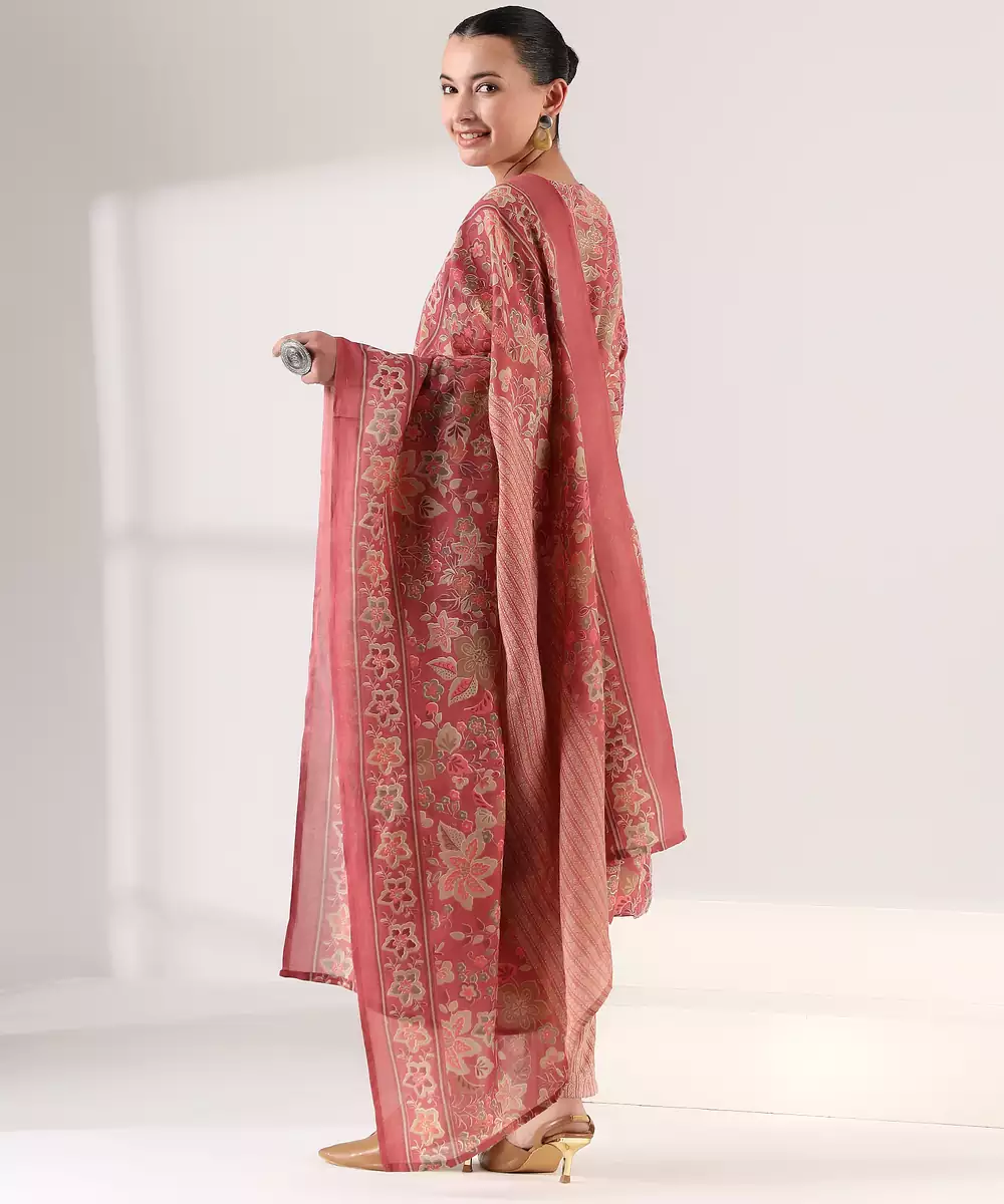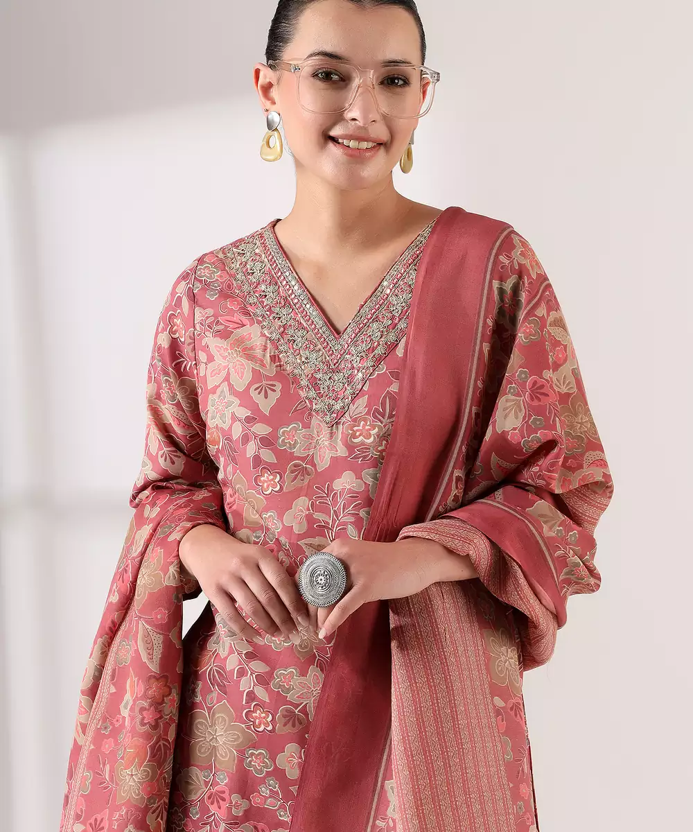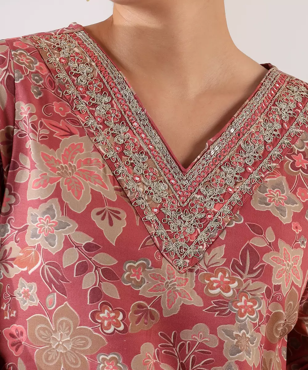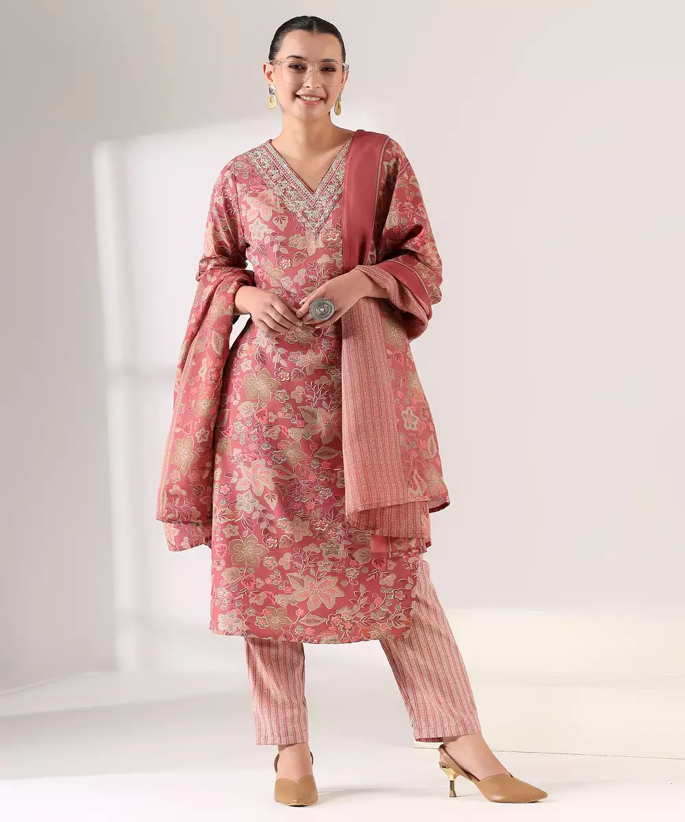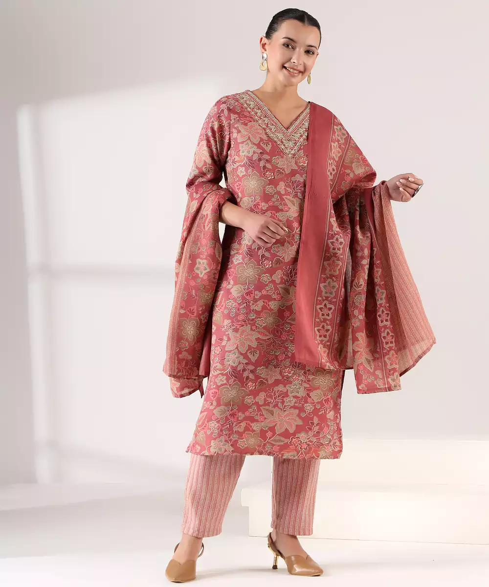 Channel Effortless Grace With This Mauve Rose 3 Piece Set, Featuring A Captivating Vintage Floral Pattern. The Kurta’s V Neckline Is Meticulously Crafted With Shimmering Thread Work Embroidery, Adding A Focal Point Of Elegance. Finished With Tailored Pinstripe Trousers And A Matching Floral Dupatta, This Set Is A Perfect Blend Of Traditional Roots And Modern Style.