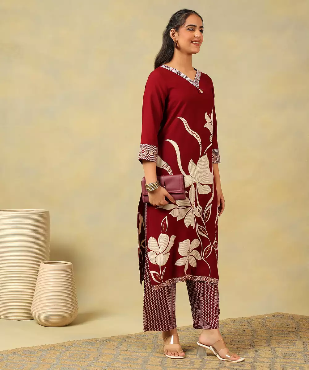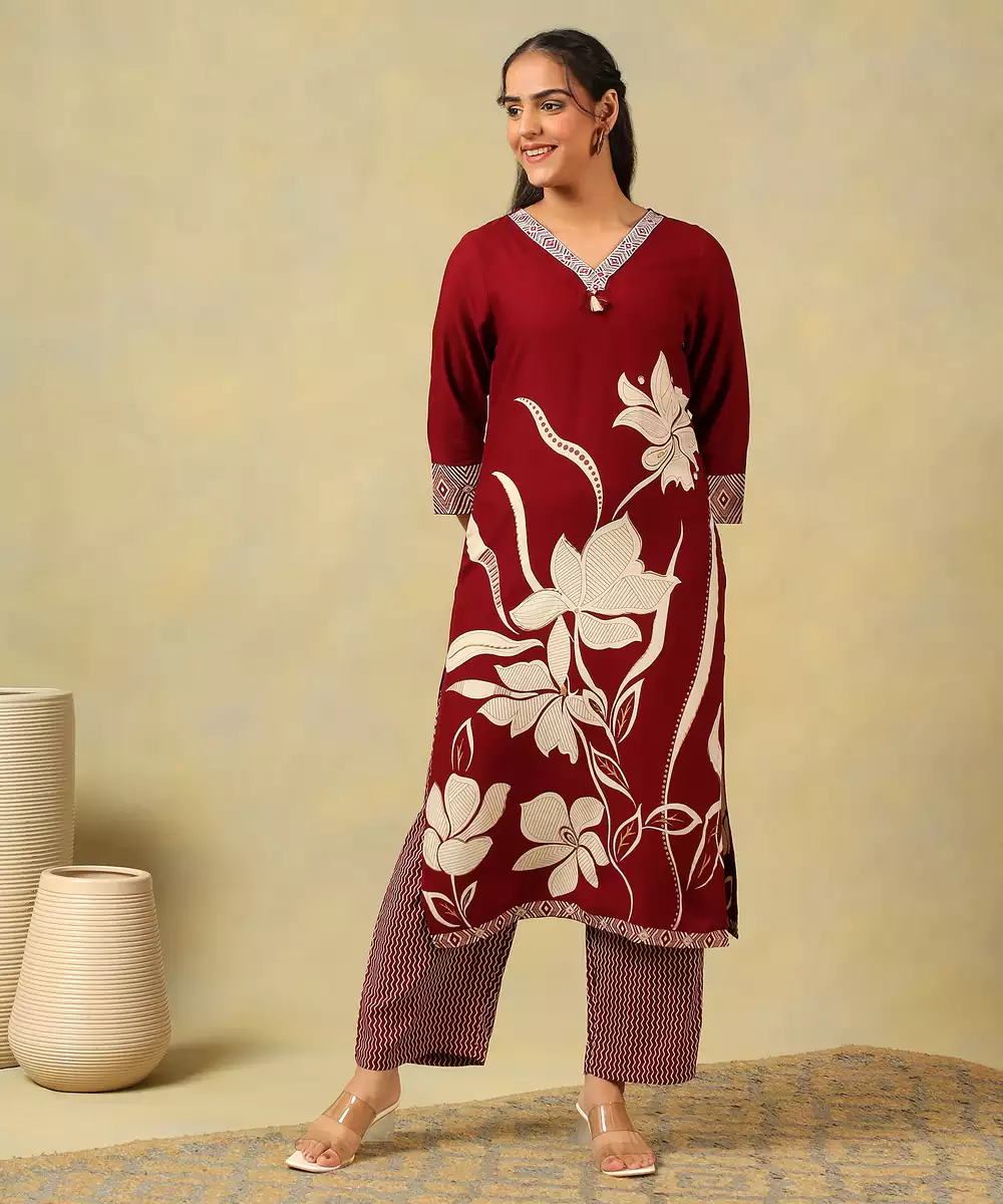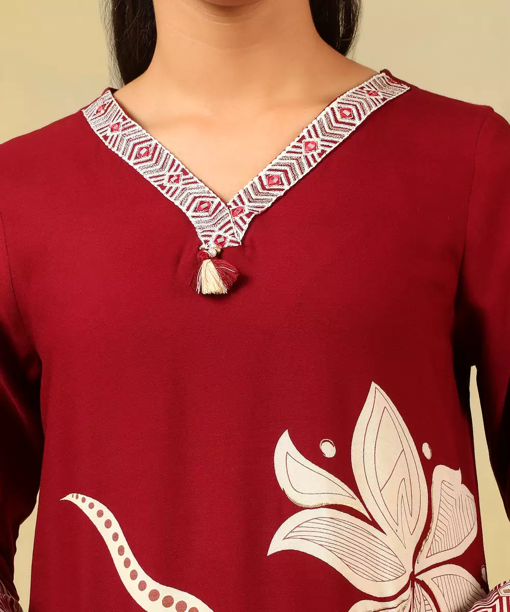 Exude Effortless Poise With The Ishani Set, Featuring An Elegant Maroon Lily Botanical Placement Print Usp. This Sophisticated Ensemble Is Rendered In A Deep, Rich Maroon Hue, Decorated With Large Scale Ivory Floral Motifs That Sweep Artistically Across The Front Of The Straight Cut Kurta. The Look Is Framed By A Geometric Patterned V Neckline Border With A Delicate Tassel, Complemented By Matching Borders On The Cuffs And Hemline. It Is Paired With Coordinating Wide Leg Trousers Featuring A Vertical Zig Zag Pattern For A Modern, Textured Finish.