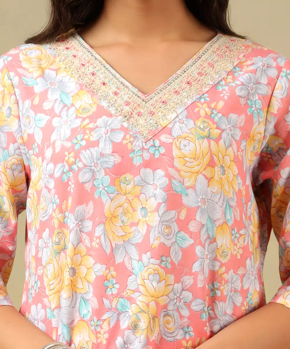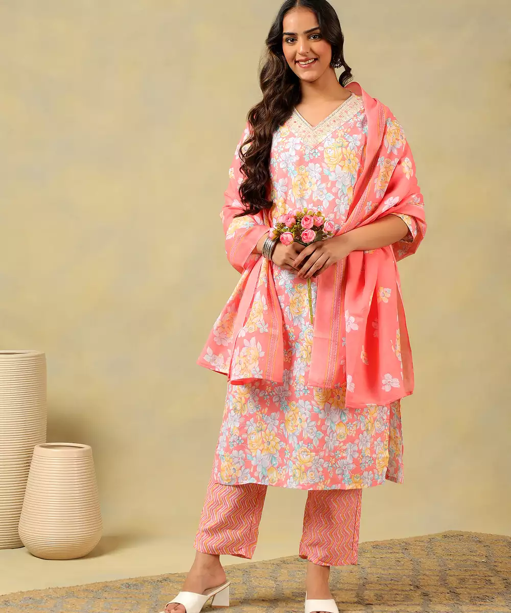 Brighten Your Daytime Wardrobe With The Ishika Suit Set, Featuring A Charming Rose Garden Floral Print Usp. This Elegant Pink Ensemble Is Saturated With Lush Botanical Blooms In Shades Of Apricot, Soft Orange, And Sky Blue Against A Vibrant Rose Pink Base. The Design Is Beautifully Highlighted By A Shimmering V Neckline Border With Intricate Embroidery, Paired With Coordinating Zigzag Patterned Trousers And A Flowing Floral Dupatta For A Fresh, Feminine Ethnic Look.