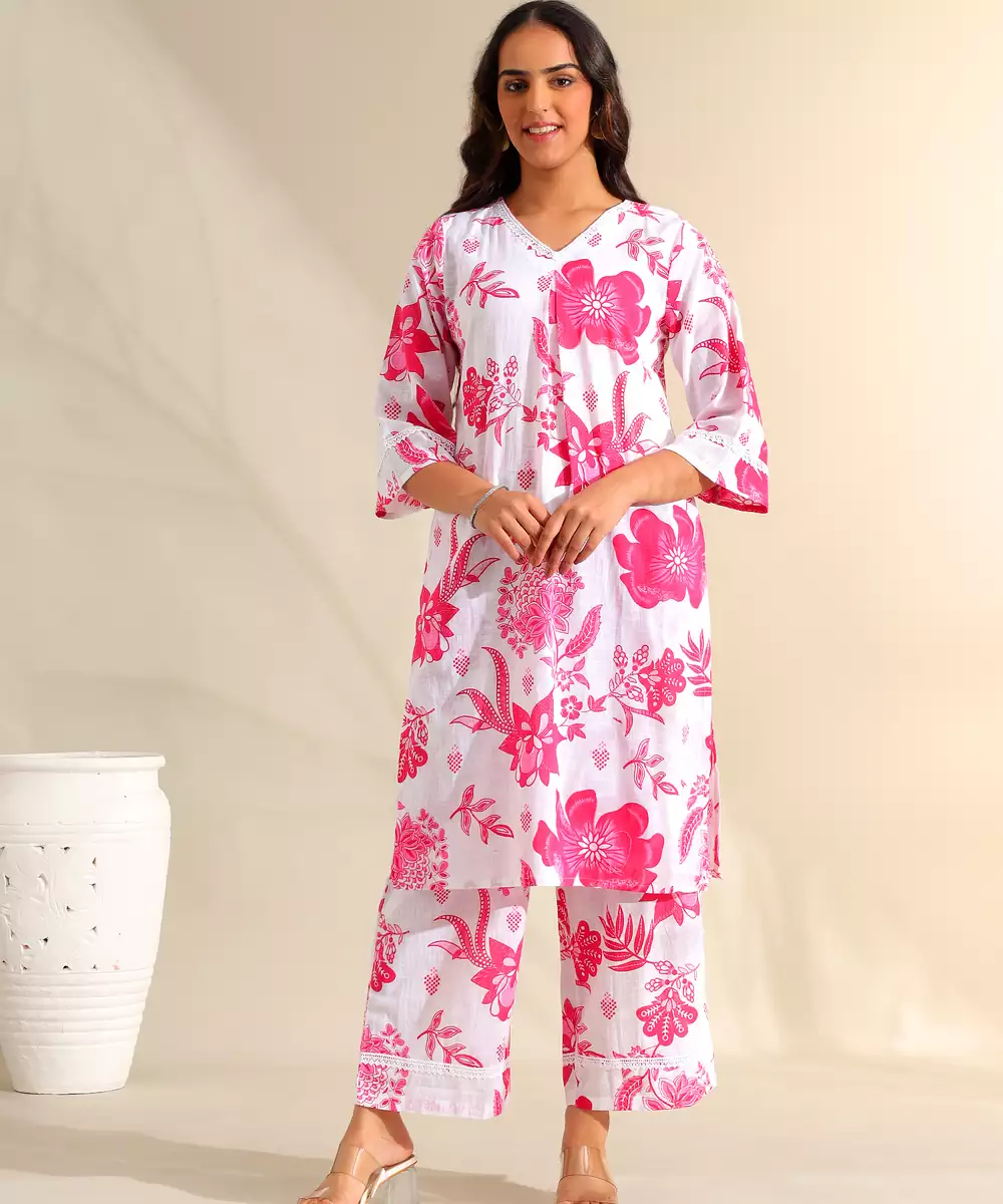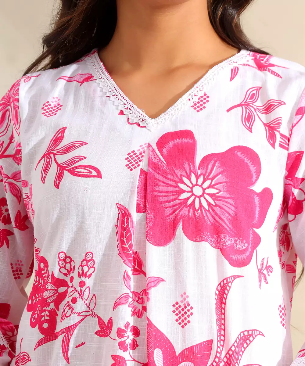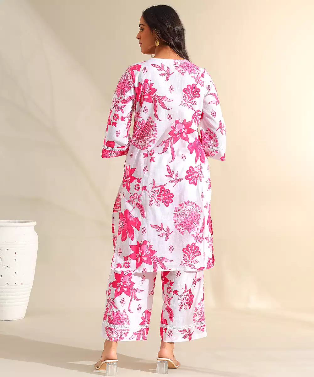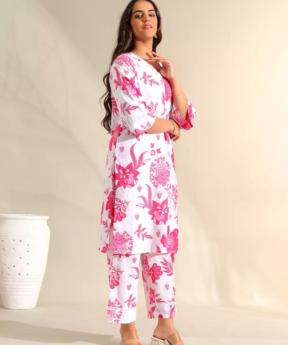 Add A Pop Of Radiant Color To Your Everyday Style With The Jiya Set, Featuring A High Contrast Magenta Bloom Botanical Print Usp. This Striking White Ensemble Is Adorned With Oversized, Artistic Floral Motifs In A Deep Magenta Hue, Creating A Bold And Energetic Look. The Kurta Is Designed With A Delicate Lace Edged V Neckline And Subtle Front Pleats For A Relaxed Yet Flattering Fit. Paired With Matching Floral Print Wide Leg Trousers, This Set Offers A Breezy And Feminine Silhouette Perfect For Daytime Outings.