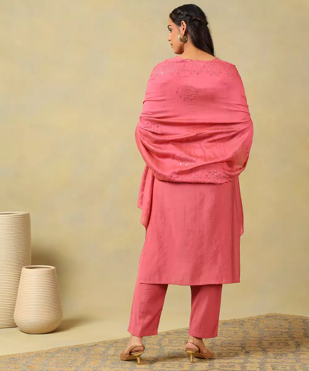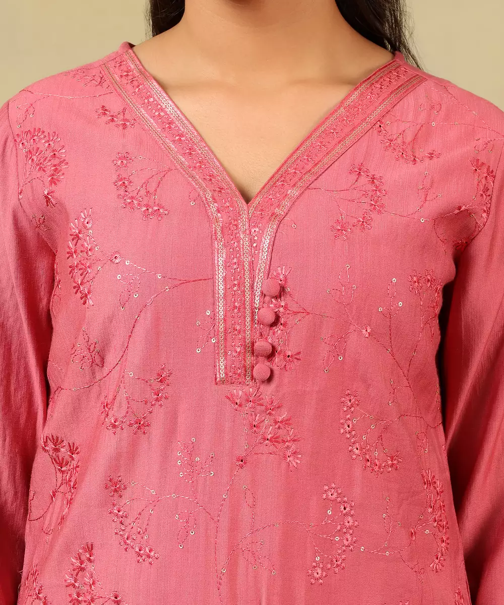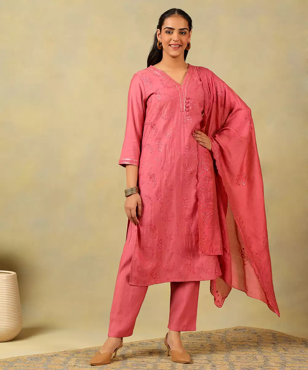 Illuminate Your Festive Ensemble With The Keya Set, Featuring An Elegant Rose Pink Floral Embroidery And Sequin Usp. This Stunning Suit Set Is Rendered In A Rich Deep Pink Hue And Is Adorned With Delicate All Over Tone On Tone Floral Embroidery Interspersed With Shimmering Sequins. The Kurta Is Designed With A Sophisticated V Neckline Featuring A Central Placket With Fabric Covered Buttons And A Subtle Embroidered Border. Paired With Solid Deep Pink Trousers And A Matching Lightweight Dupatta With A Shimmering Embroidered Border, This Ensemble Offers A Luminous And Refined Silhouette Perfect For Special Occasions.