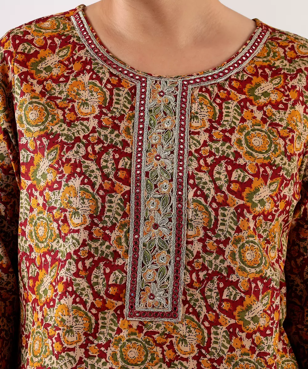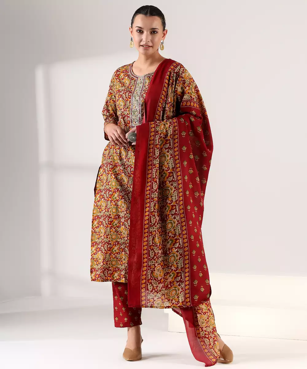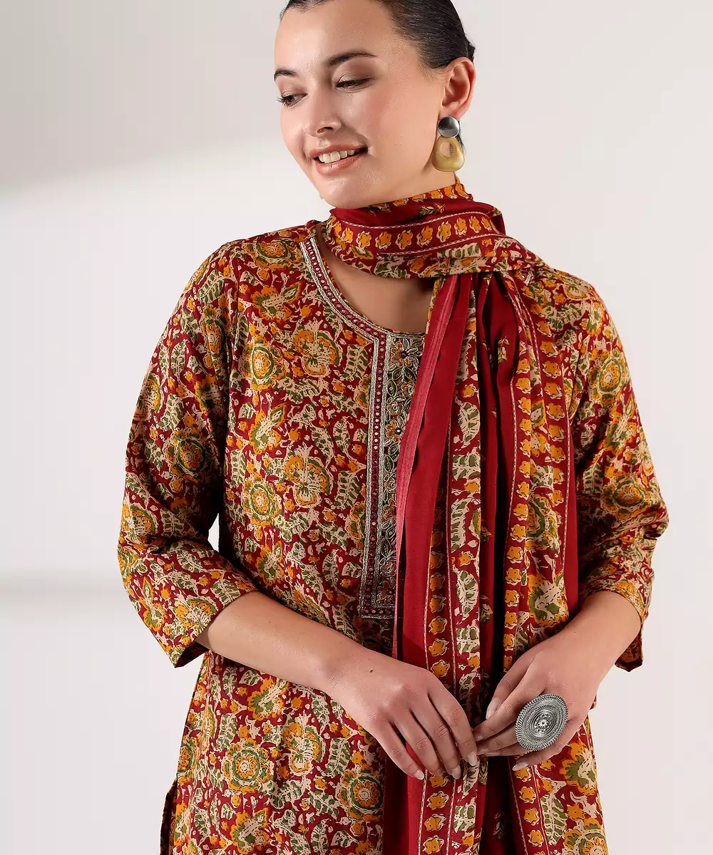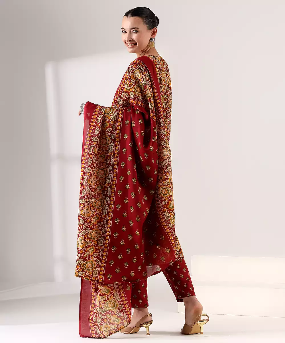 Embrace The Deep, Soulful Tones Of Our Manjari Suit Set, A 3 Piece Ensemble That Celebrates Traditional Indian Artistry. The Kurta Is Drenched In A Rich Maroon Wine Base, Featuring An All Over Ajrakh Inspired Intricate Floral And Paisley Print In Earthy Mustard And Sage Hues. The Design Is Highlighted By A Structured Rectangular Neck Placket Adorned With Delicate Chikankari Style Embroidery And Silver Gota Patti Accents. Paired With Coordinating Small Butti Print Trousers And A Matching Maroon Dupatta, This Set Is A Masterpiece Of Ethnic Elegance.