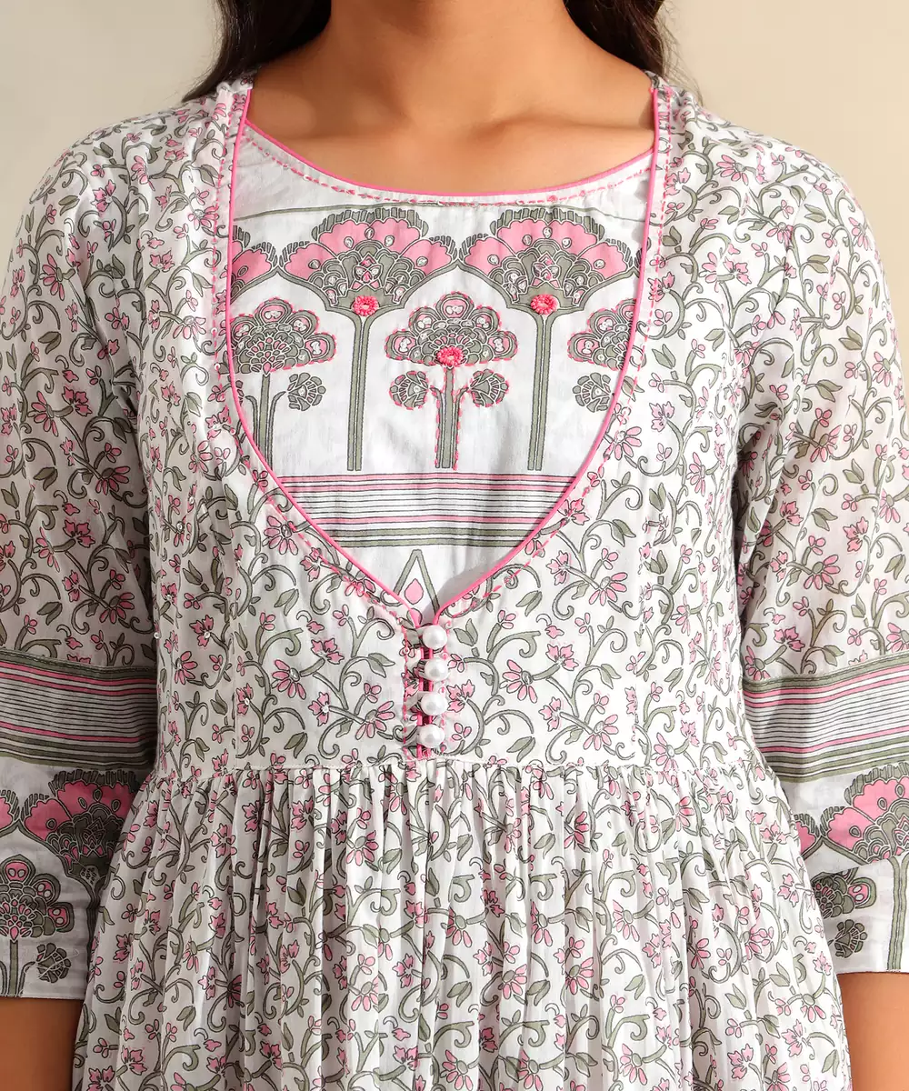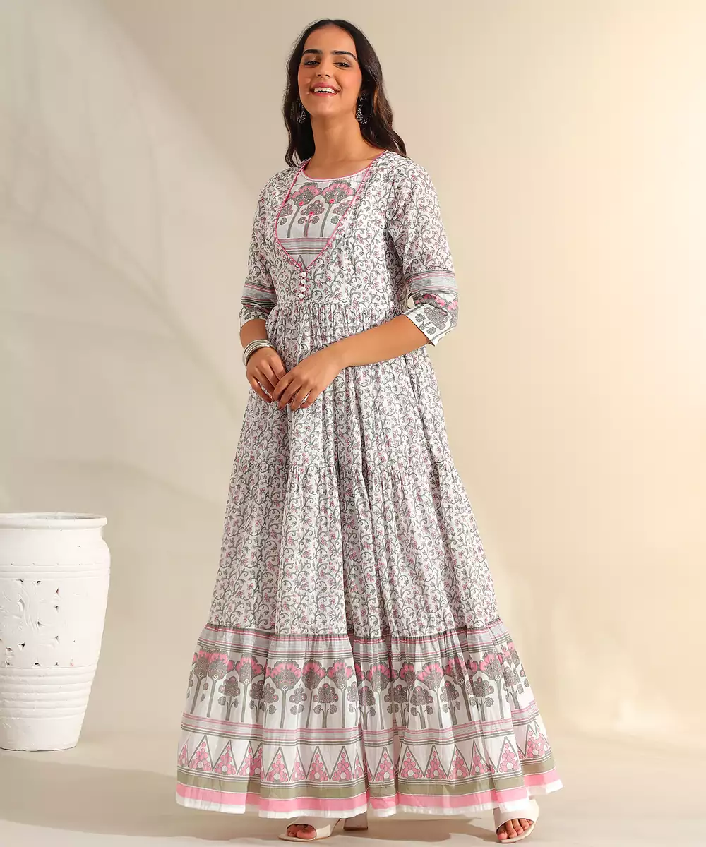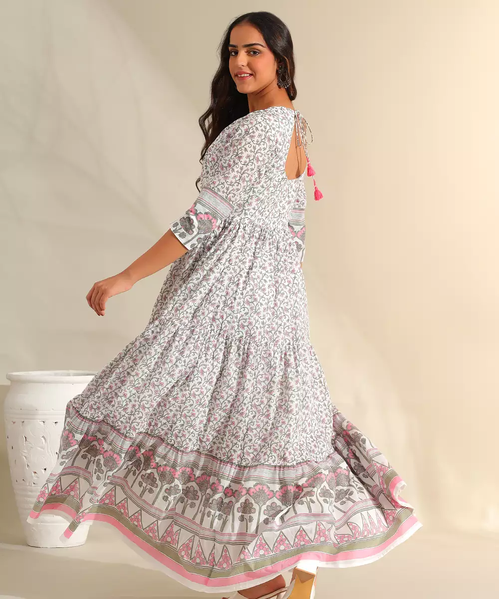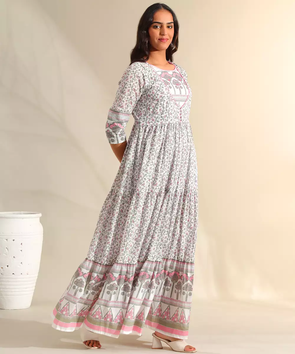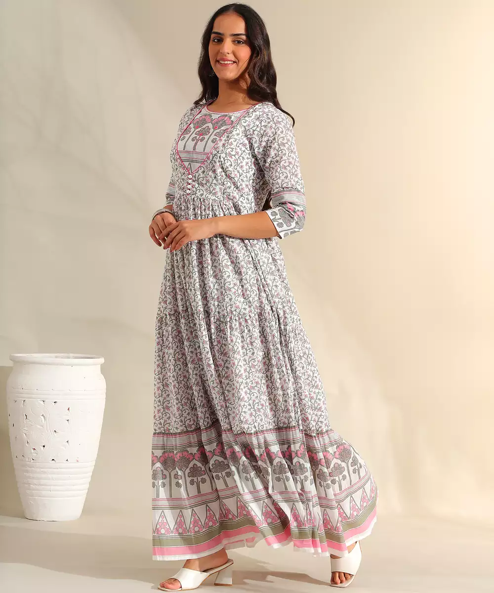 Step Into Effortless Elegance With The Mihika Dress, Featuring A Romantic Garden Inspired Floral Vine Print Usp. This Floor Length Dress Is Crafted In A Breathable Ivory Fabric, Beautifully Adorned With Intricate Pink And Sage Green Botanical Motifs Throughout. The Highlight Of This Piece Is Its Voluminous Tiered Silhouette, Which Provides A Graceful Flare And Movement. The Bodice Is Structured With A Contrast Piped Yoke And Decorative Button Detailing, While The Hemline Is Finished With A Bold, Multi Patterned Border For A Sophisticated, High End Look.