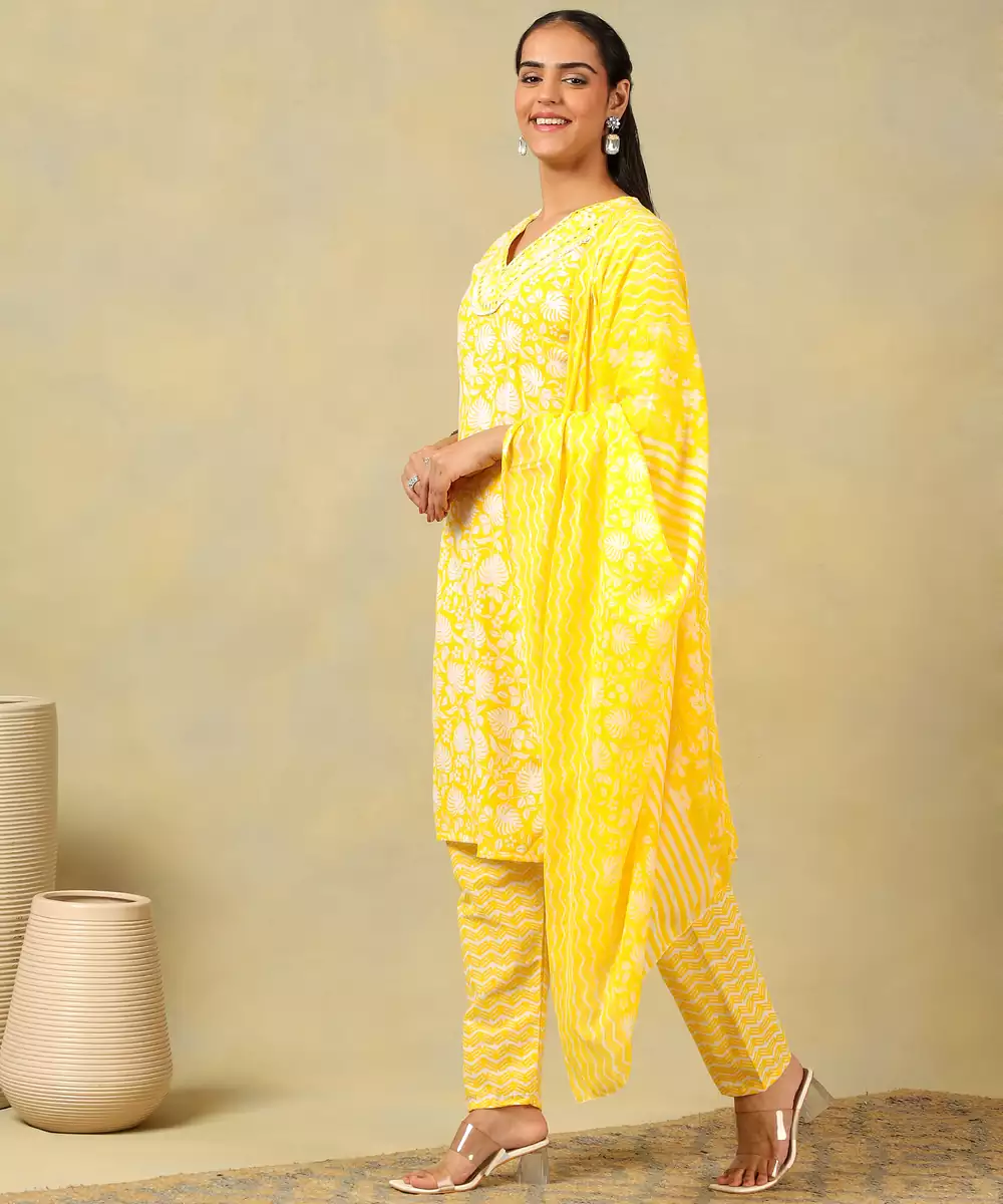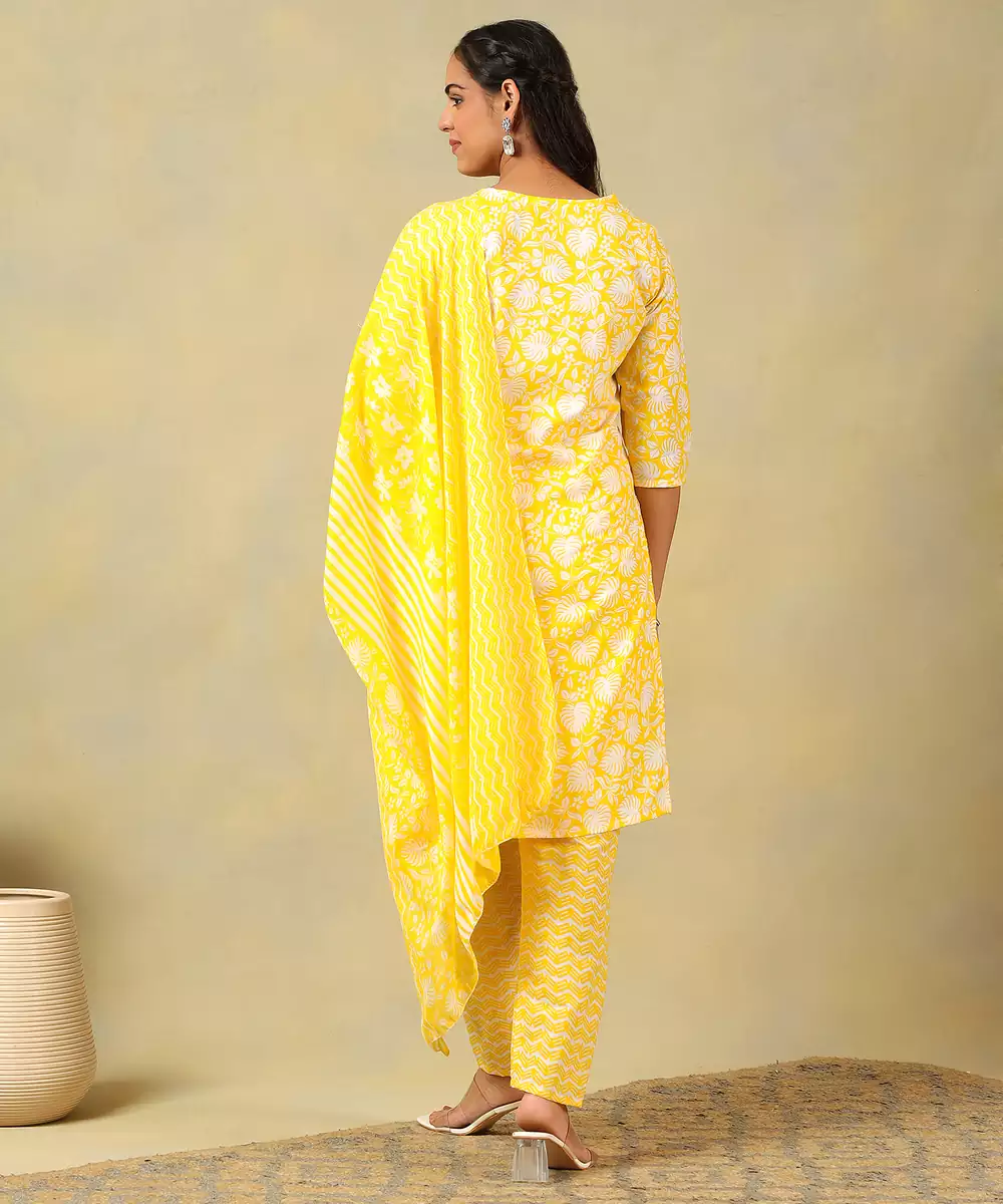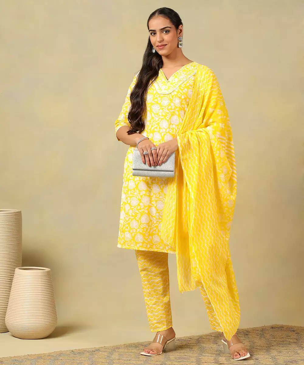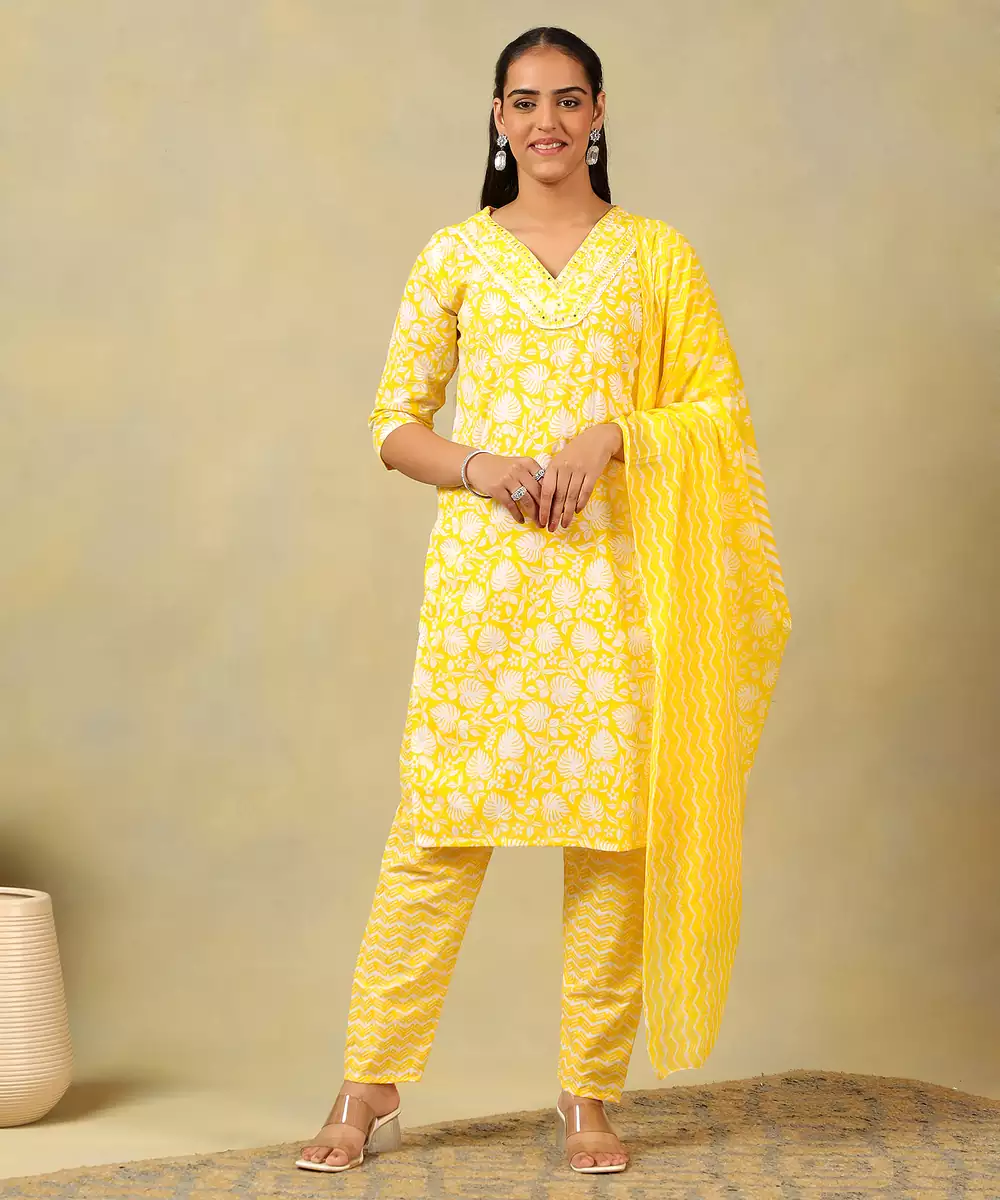 Radiate Positivity In Our Myra Kurta Set, Featuring A Vibrant Sunny Leafy Bloom Print Usp. The Cheerful White Botanical Patterns Against A Bright Yellow Backdrop Make This A Perfect Ensemble For Summer Outings. The V Neckline Is Accentuated With A Refined White Border, Paired With Zigzag Trousers To Create A Fresh And Energetic Indian Silhouette.