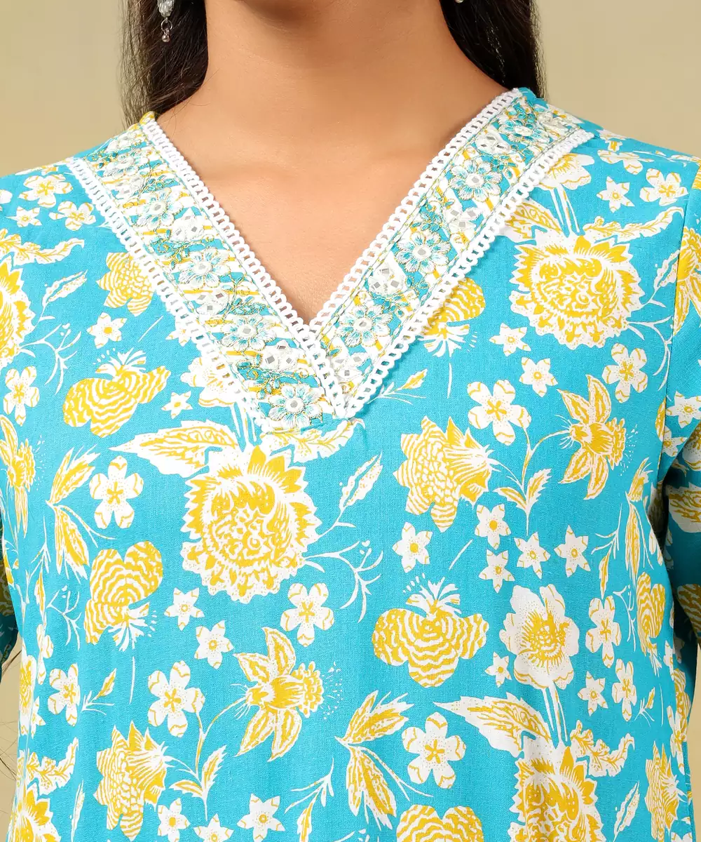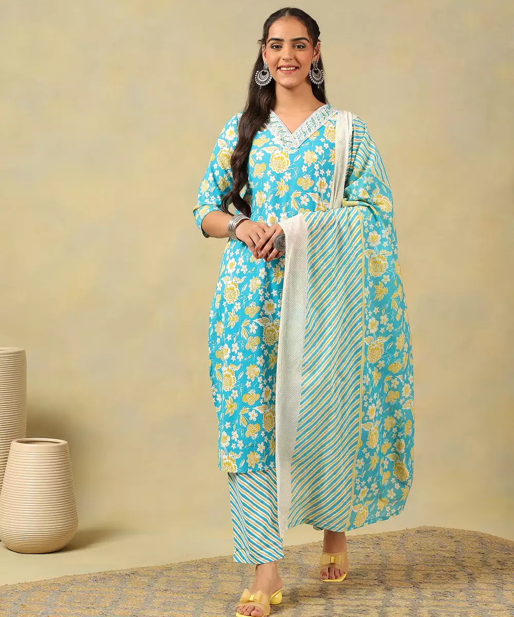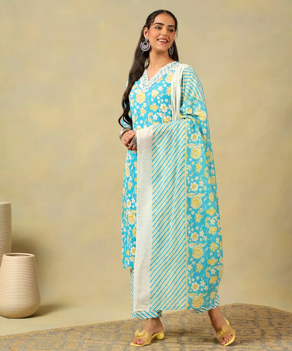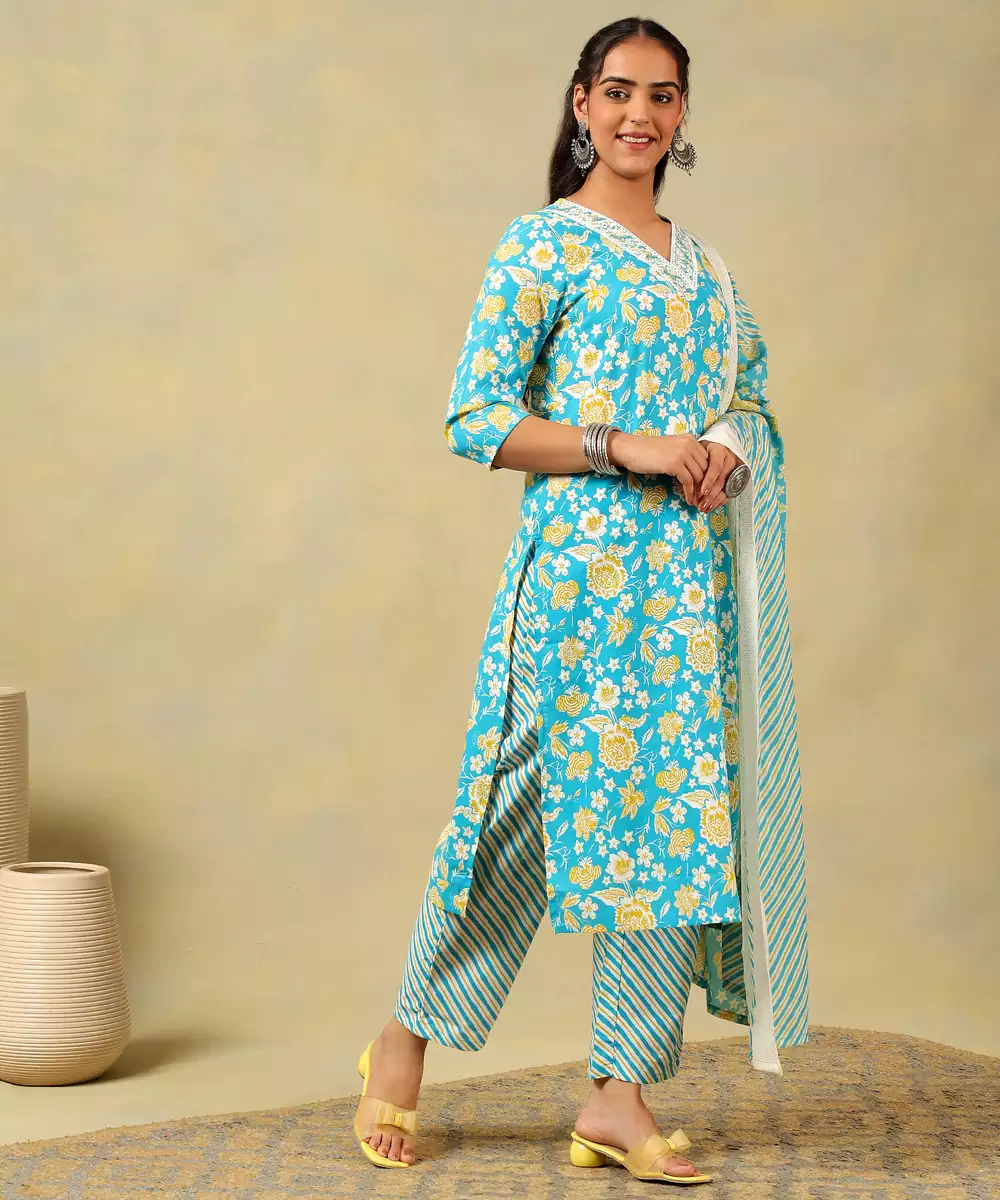 Brighten Your Festive Wardrobe With The Myra Set, Featuring A Radiant Turquoise And Yellow Floral Vine Usp. This Vibrant Ensemble Showcases A Turquoise Kurta Blooming With Sunny Yellow And Crisp White Floral Motifs. The Design Is Beautifully Detailed With A White Embroidered V Neckline Border That Adds A Touch Of Classic Refinement To The Straight Cut Silhouette. It Is Paired With Coordinating Trousers And A Lightweight Dupatta, Both Featuring A Modern Diagonal Stripe Pattern That Perfectly Balances The Botanical Print.