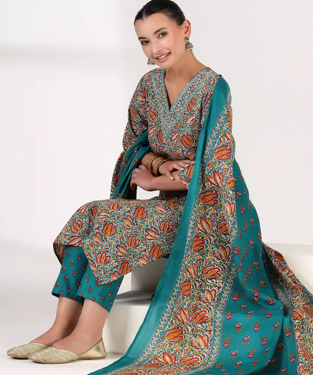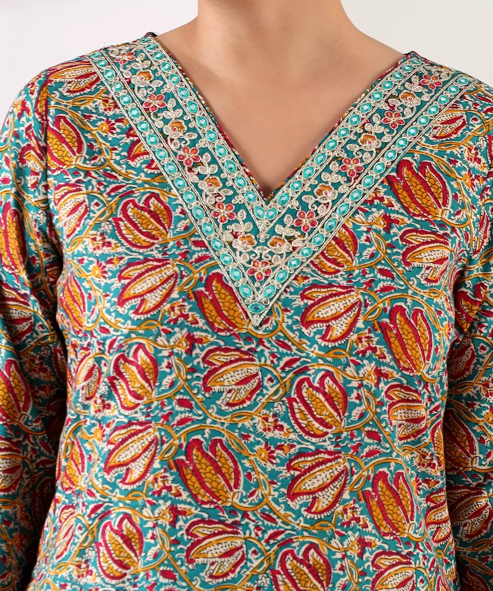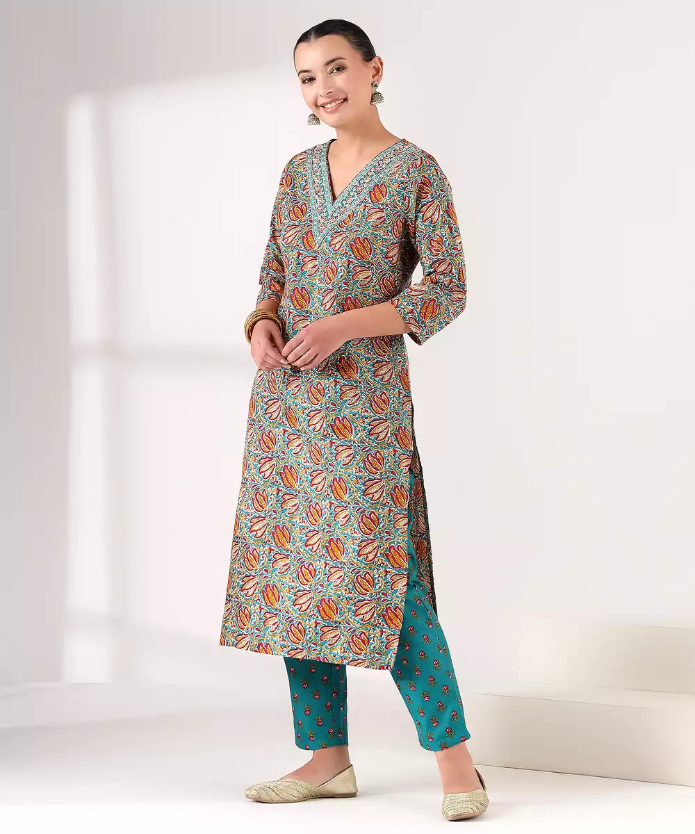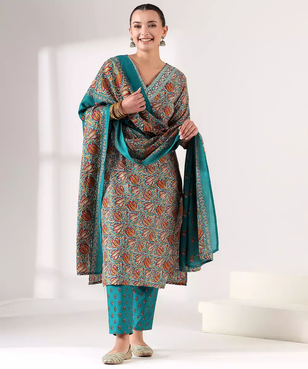 Step Into Vibrant Sophistication With The Nilaya Suit Set, A Stunning 3 Piece Ensemble In A Rich Teal Base. The Kurta Is Beautifully Covered In A Rhythmic Tulip Floral Print Featuring Bold Ochre And Soft Cream Tones. A Sharp V Neckline Is The Focal Point, Accented By An Intricate Embroidered Border That Adds A Touch Of Ethnic Grandeur. Paired With Deep Teal Butti Print Trousers And A Matching Floral Dupatta, This Set Is Designed For The Modern Woman Who Loves Timeless Heritage Prints.