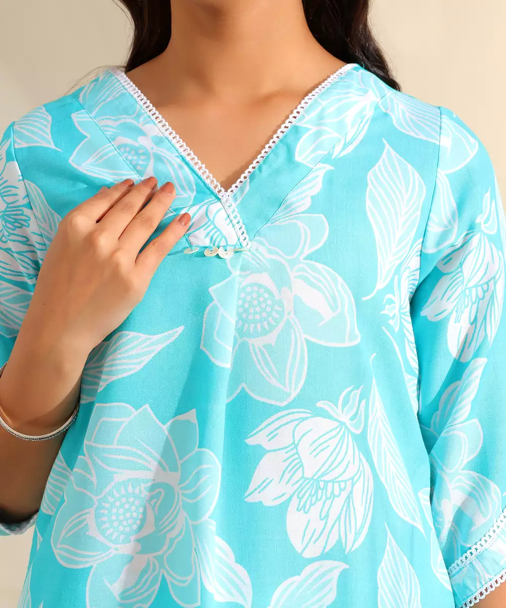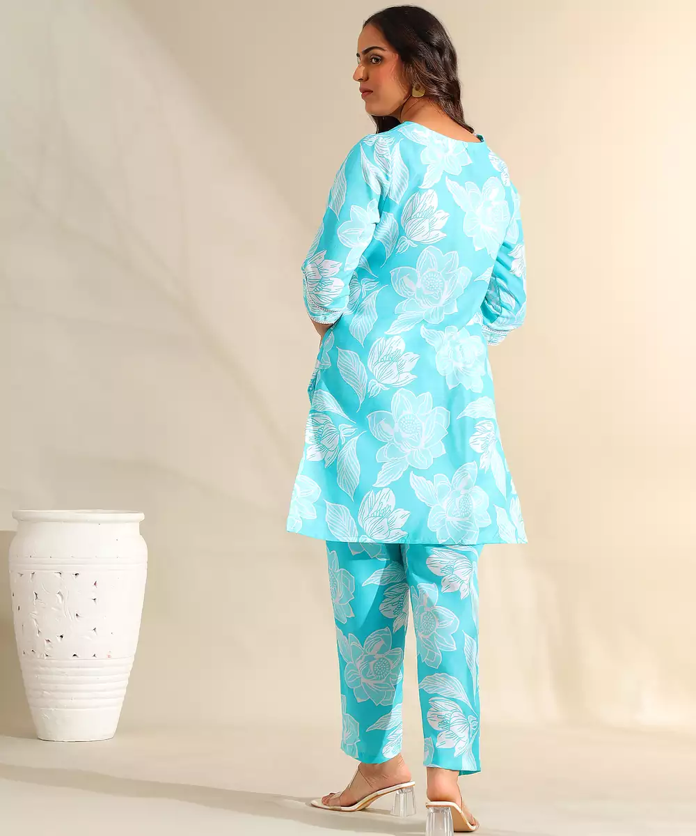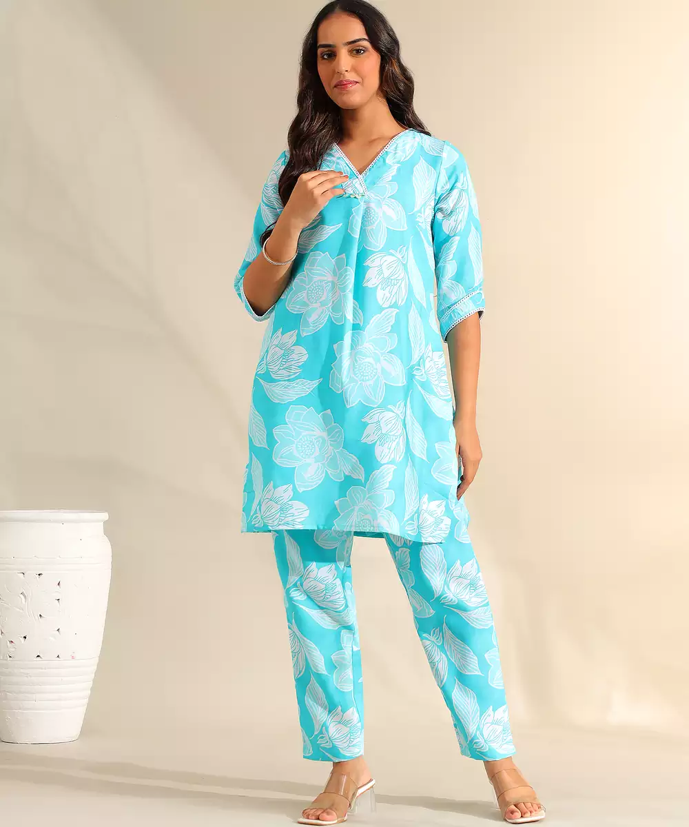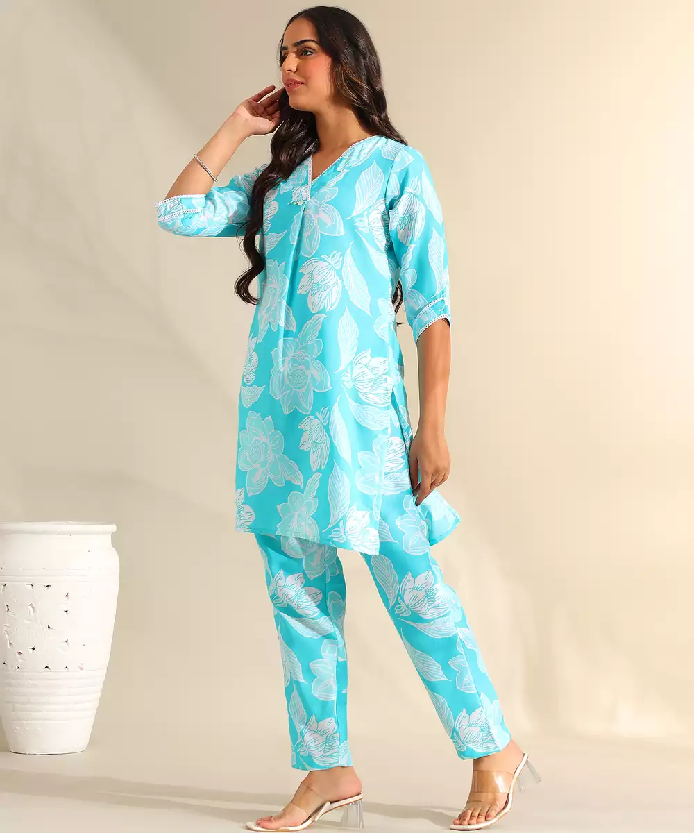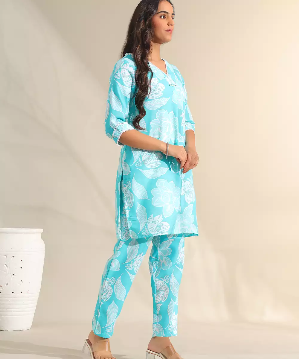 Brighten Your Seasonal Wardrobe With The Ojasvi Set, Featuring A Refreshing Aqua And White Botanical Silhouette Usp. This Contemporary Kurta Set Is Rendered In A Vibrant Turquoise Hue, Decorated With Large Scale White Floral Blooms And Leaf Outlines That Create A High Contrast, Energetic Look. The Kurta Is Designed With A Refined White Lace Trimmed V Neckline Featuring Pearl Style Button Accents And A Central Pleat, Offering A Feminine And Polished Silhouette. Paired With Matching Printed Trousers, This Coordinated Ensemble Provides A Cohesive, Fashion Forward Look That Is Perfect For Daytime Celebrations.