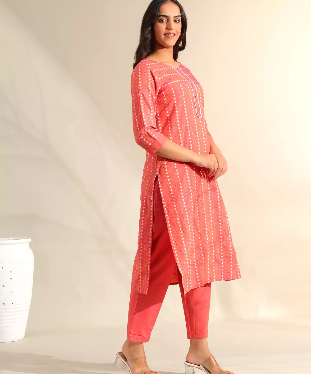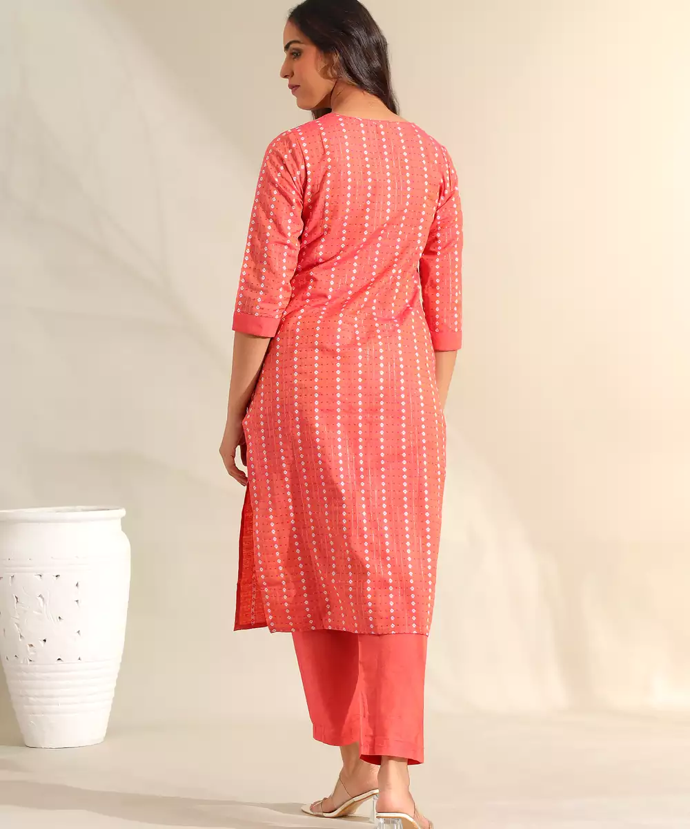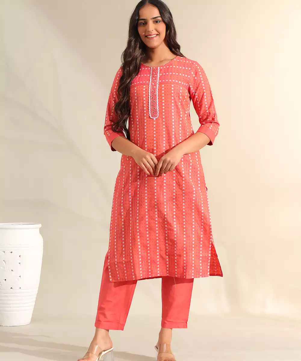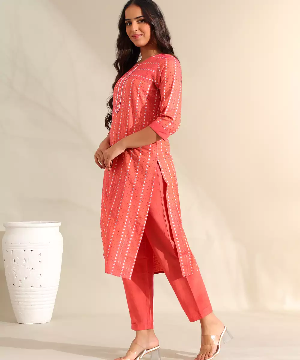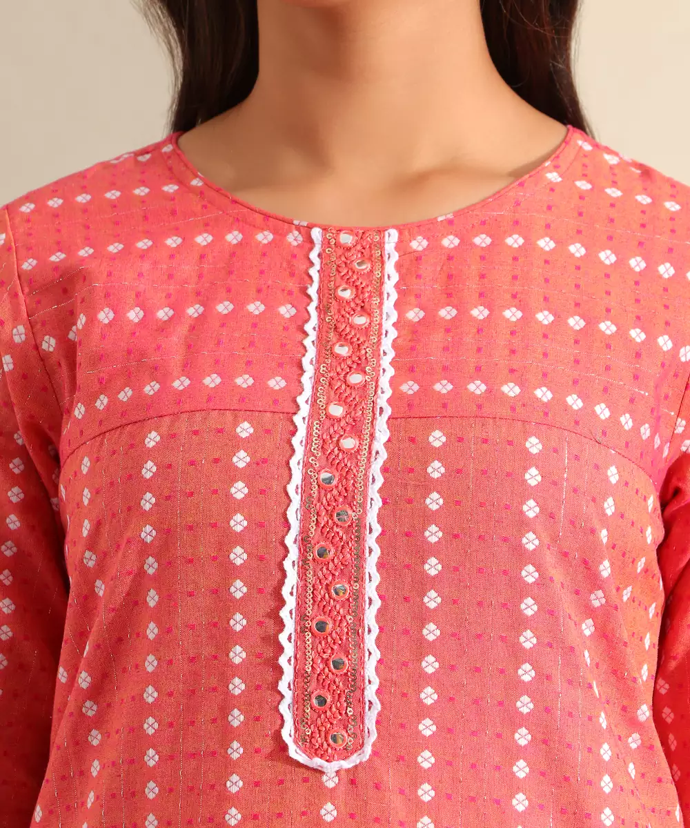 Infuse Your Wardrobe With Warmth With The Prisha Set, Featuring A Sophisticated Coral Peach Bandhani Inspired Print And Mirror Work Usp. This Elegant Suit Set Is Rendered In A Vibrant Coral Peach Hue And Is Adorned With A Delicate All Over Pattern Of White Geometric Micro Dots Arranged In Vertical Stripes. The Kurta Is Beautifully Detailed With A Central Lace Bordered Placket Featuring Intricate Embroidery And Shimmering Mirror Work Accents, Creating A Refined And Structured Aesthetic. The Look Is Completed With Coordinating Solid Coral Trousers, Offering A Clean And Breezy Silhouette Perfect For Both Professional Settings And Festive Daytime Outings.