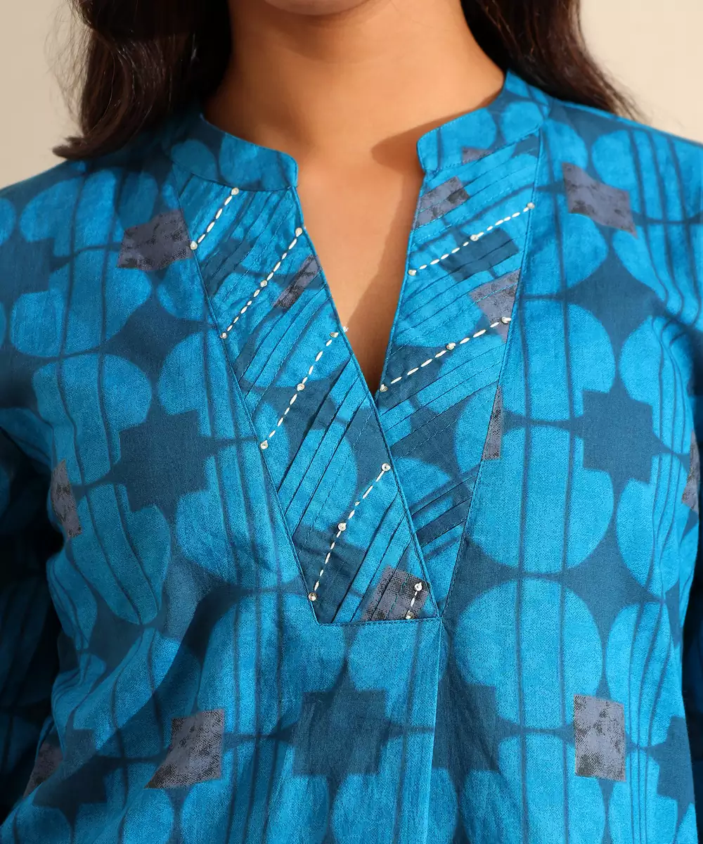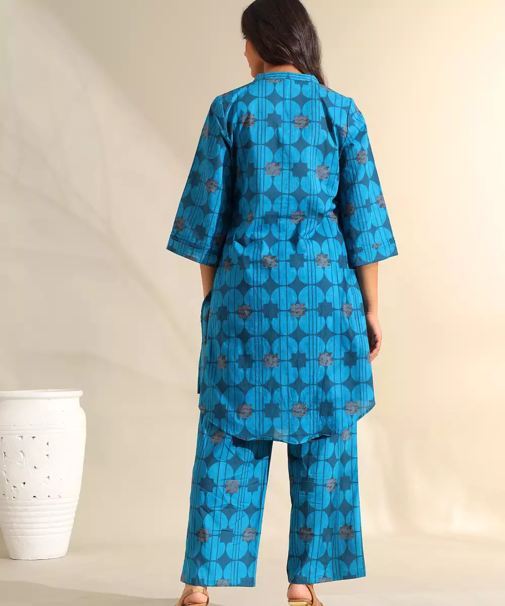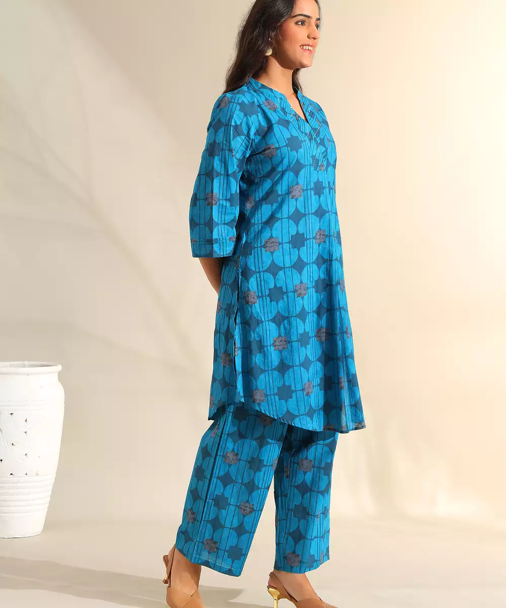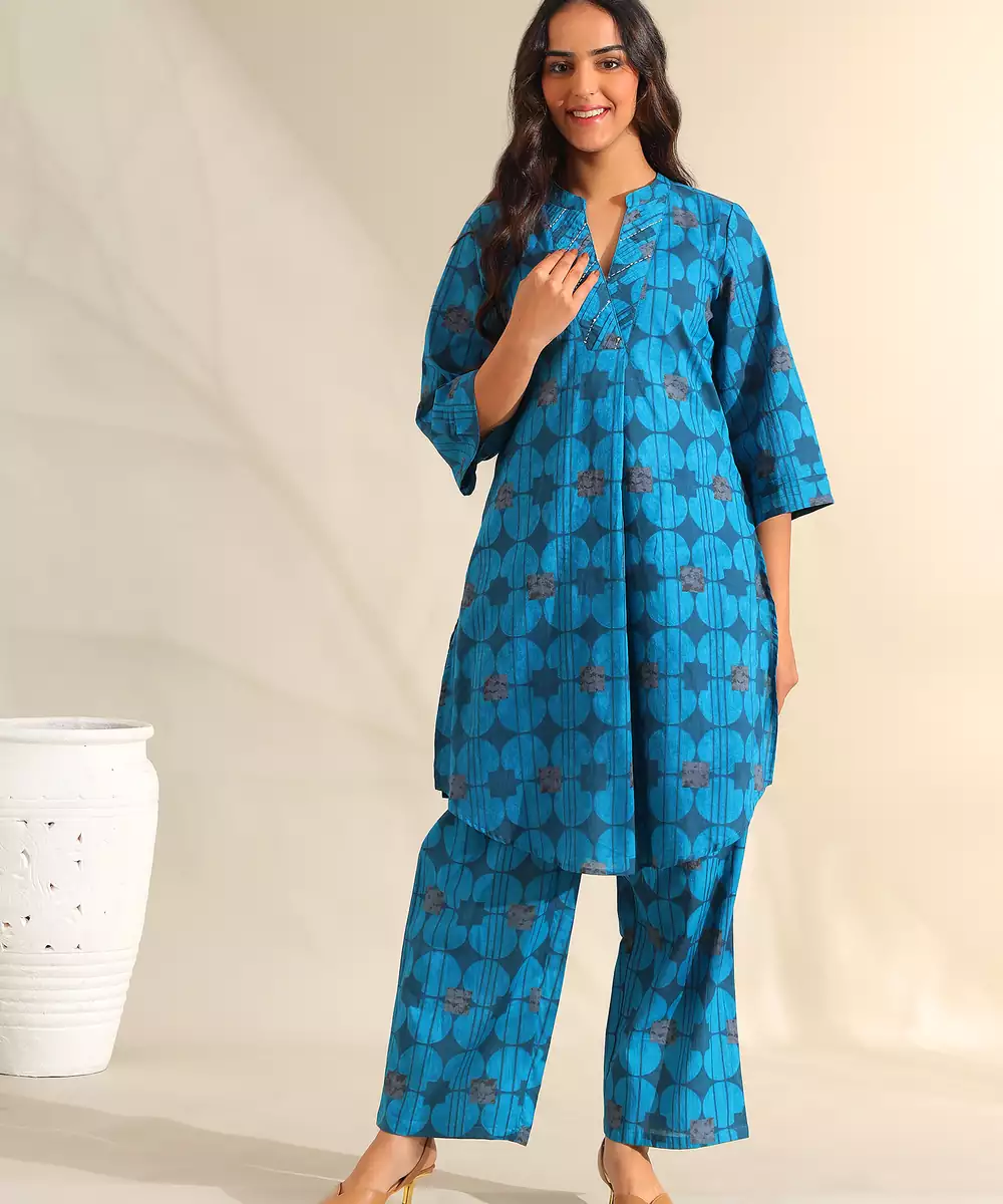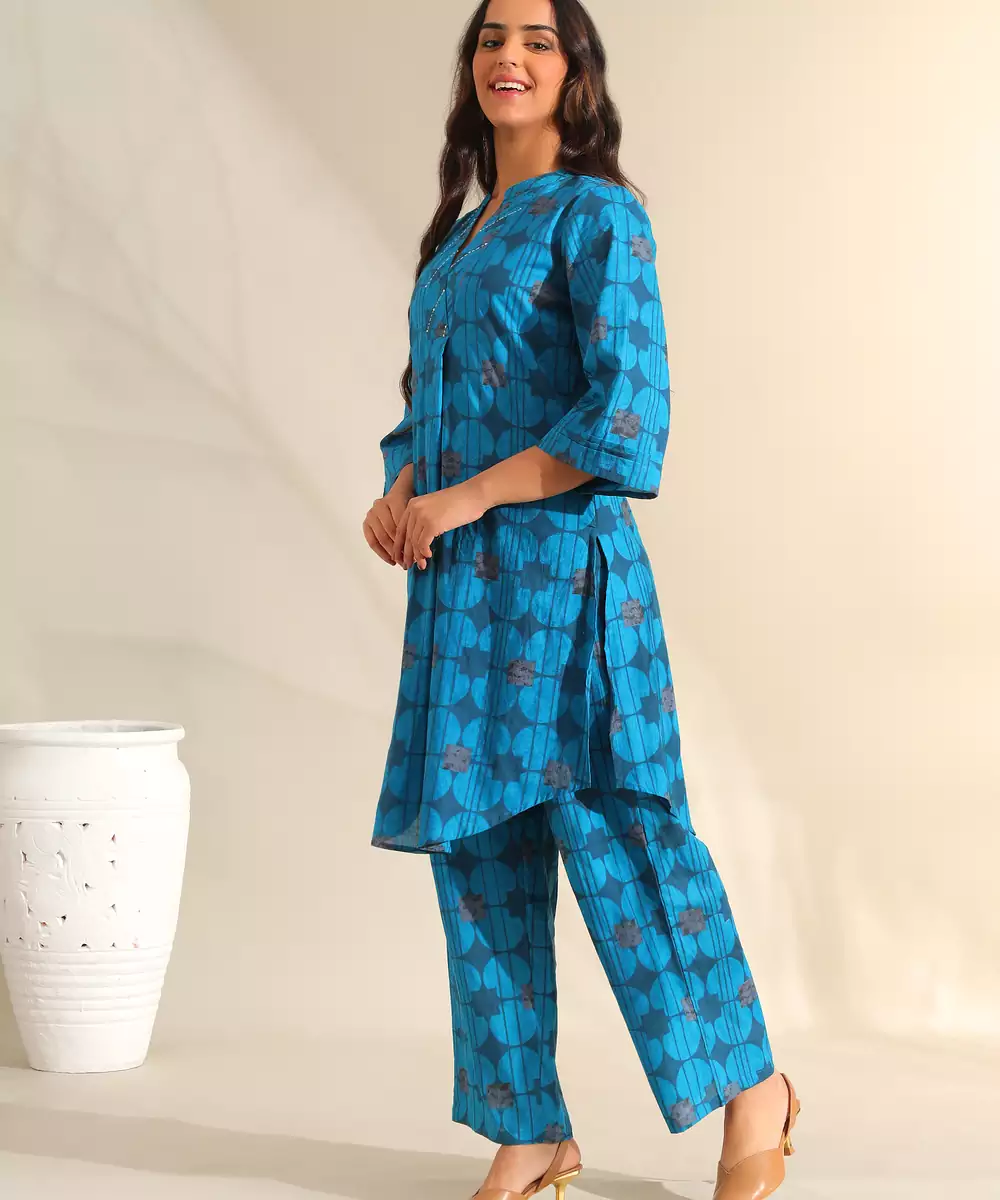 Infuse Your Modern Ethnic Wardrobe With The Reet Set, Featuring A Contemporary Peacock Geometric Circle Print Usp. This Striking Teal Blue Ensemble Is Patterned With Deep Navy Circular Motifs And Abstract Floral Accents That Create A Structured, Rhythmic Design. The Kurta Is Designed With A Notched V Neckline Featuring Metallic Beadwork, Paired With A Curved High Low Hem For A Fluid, Sophisticated Silhouette. It Is Completed With Matching Wide Leg Printed Trousers, Offering A Bold And Cohesive Look For Professional Or Social Gatherings.