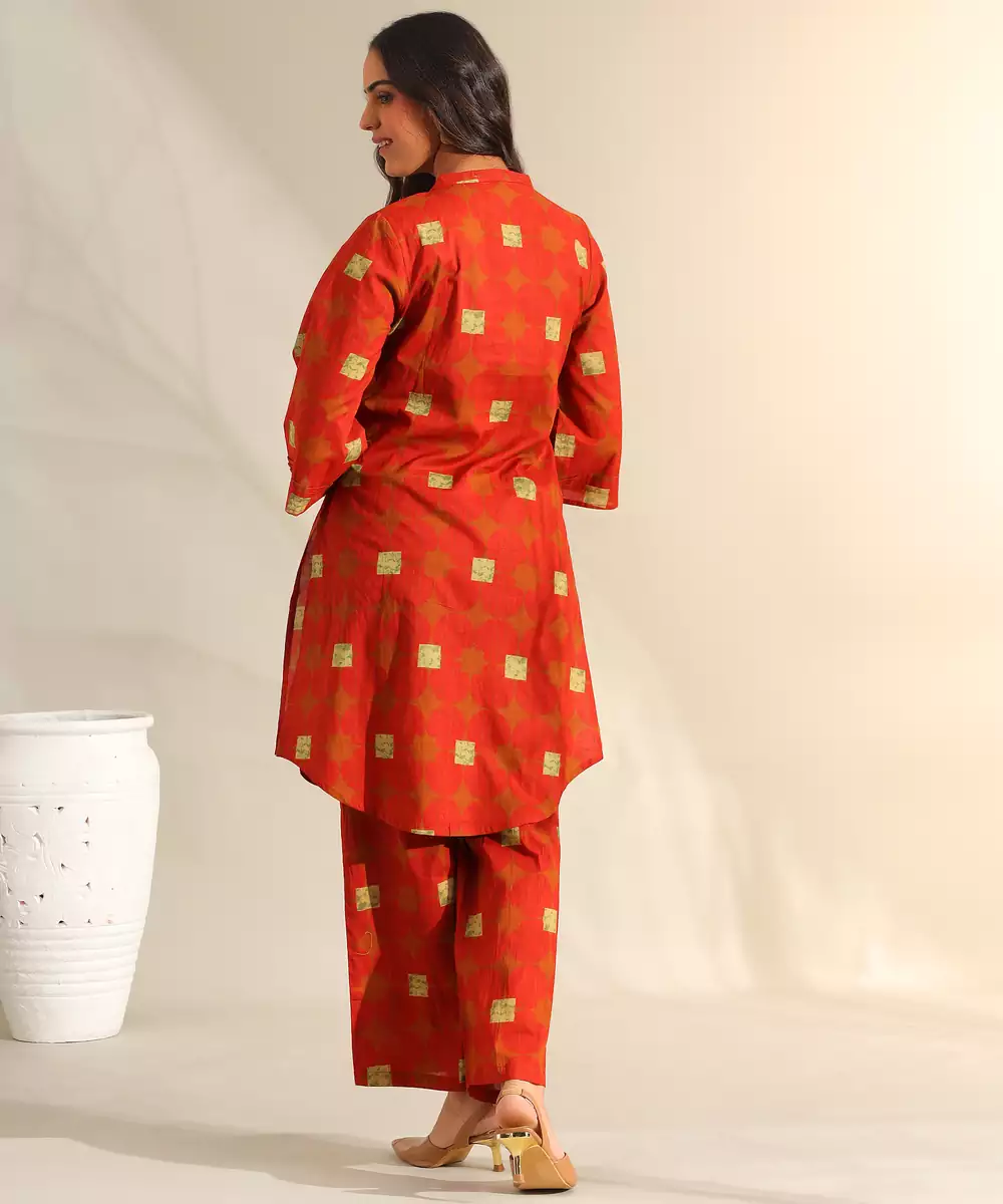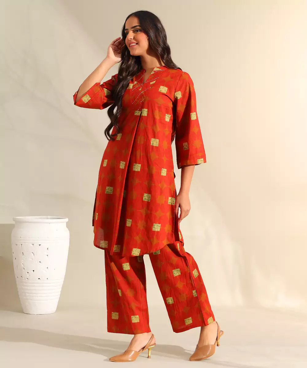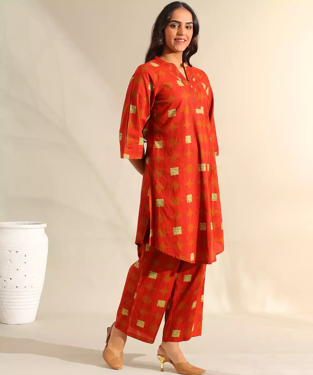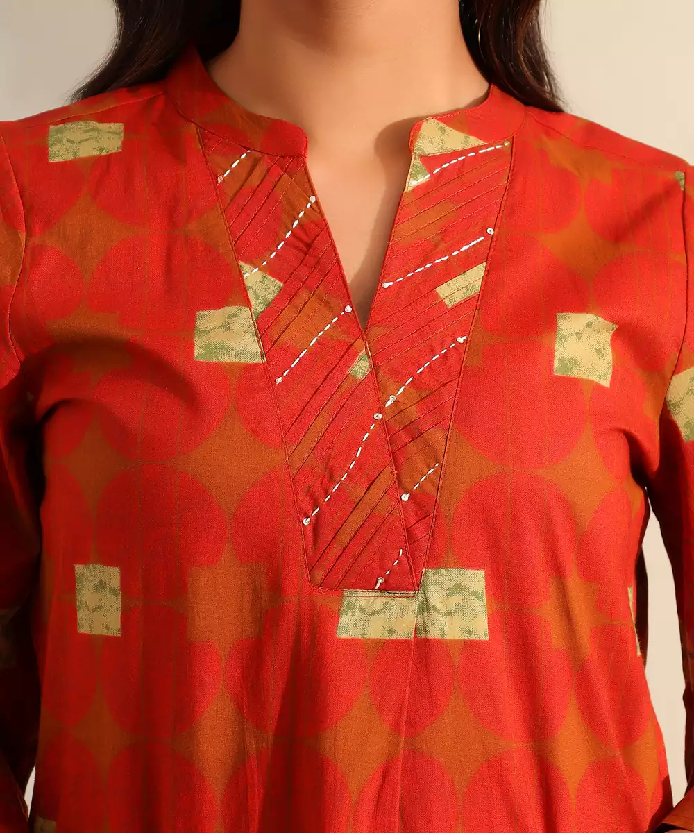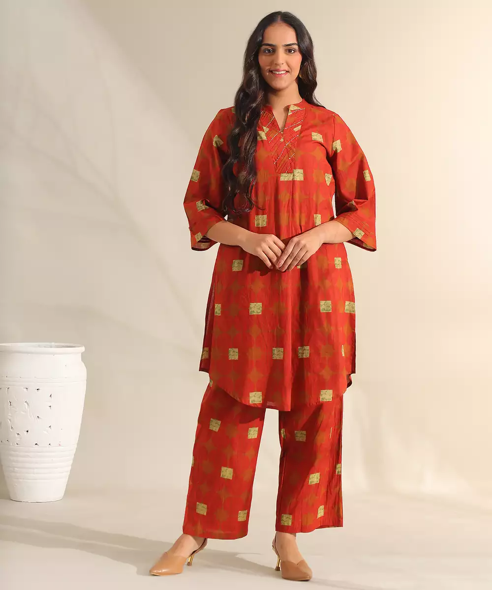 Infuse Your Ethnic Collection With An Earthy, Contemporary Vibe With The Reva Set, Featuring A Unique Geometric Tile Print Usp. This Ensemble Is Rendered In A Deep Rust Red Hue And Accented With Olive Green Square Motifs And Subtle Diamond Patterns. The Kurta Features A Structured V Neckline With A Striped Border Panel, Offering A Clean And Modern Frame To The Straight Cut Silhouette. It Is Paired With Coordinating Wide Leg Trousers In The Same Geometric Print For A Bold, Cohesive, And Fashion Forward Look.
