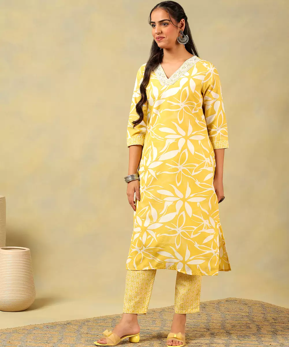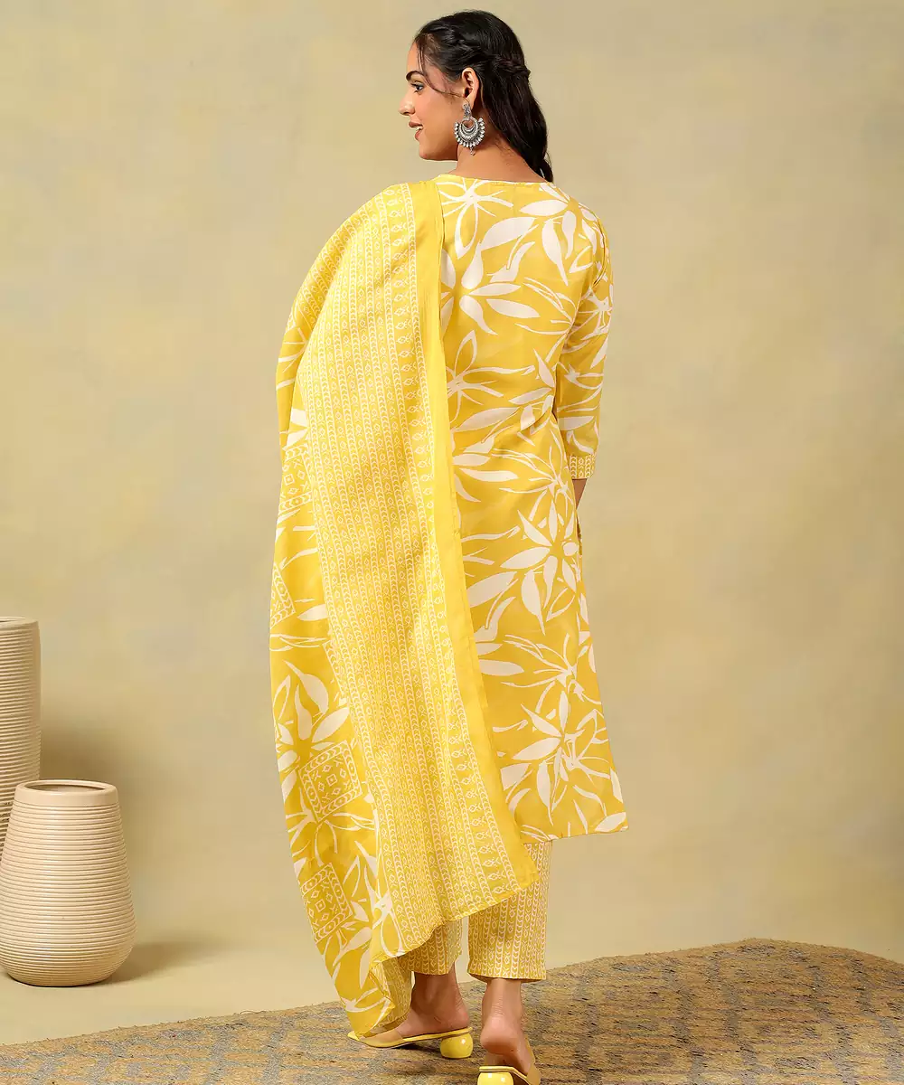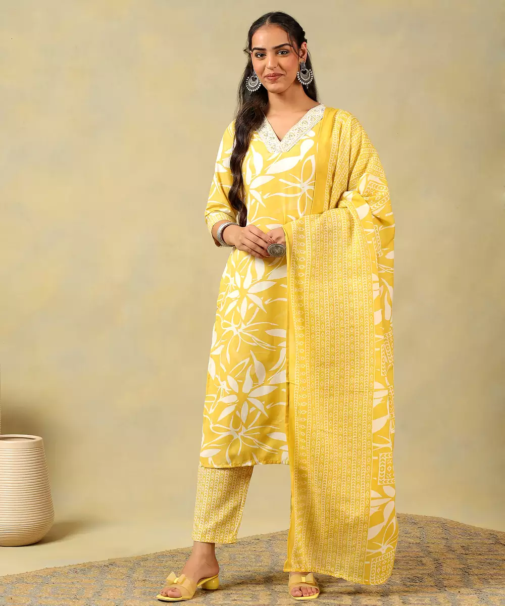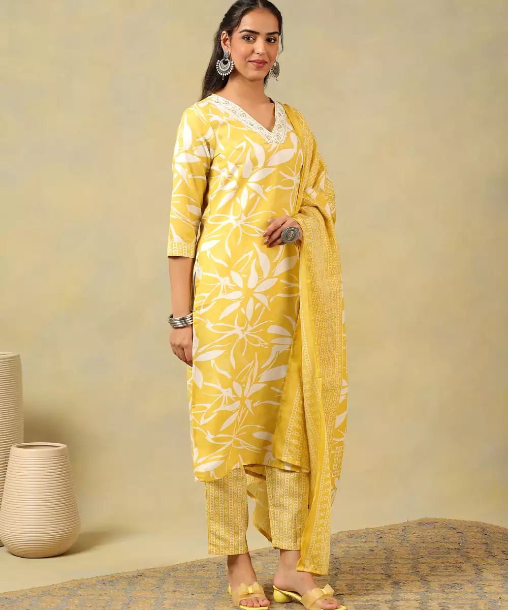 Brighten Your Ethnic Collection With The Rhea Set, Featuring A High Impact Yellow Leaf Silhouette Print Usp. This Vibrant Ensemble Is Rendered In A Sunny Yellow Hue And Decorated With Large, Artistic White Leaf Motifs That Flow Across The Straight Cut Kurta. The Look Is Framed By A Crisp White Embroidered V Neckline Border With Intricate Floral Lace Detailing. It Is Paired With Coordinating Micro Patterned Yellow Trousers And A Matching Leaf Print Dupatta With Structured Geometric Borders For A Cohesive And Radiant Daytime Look.