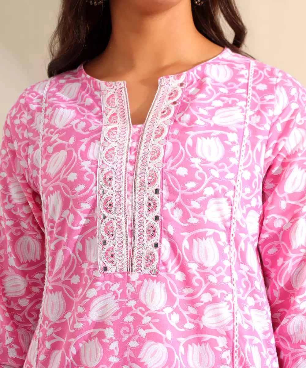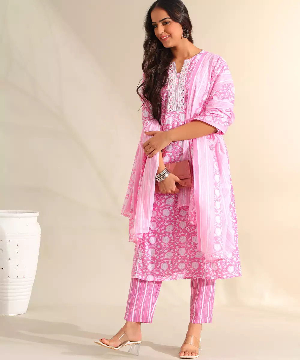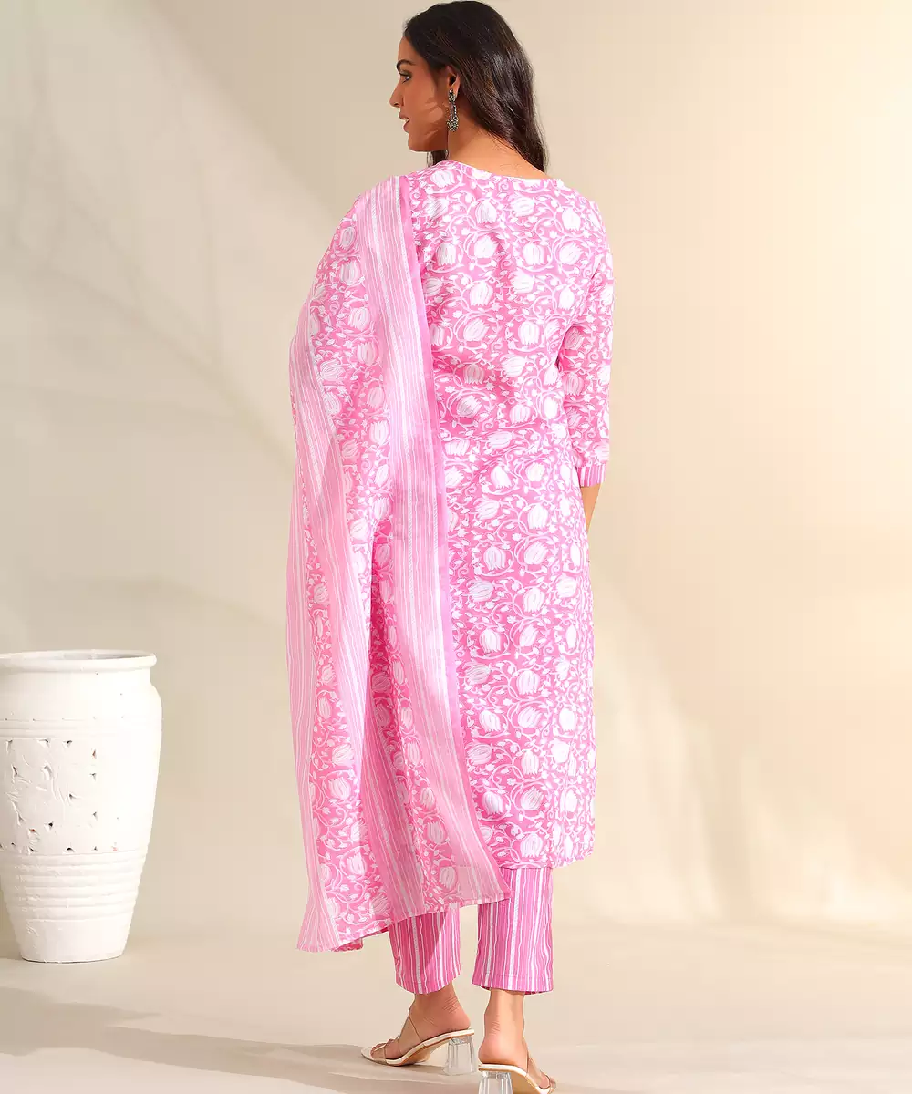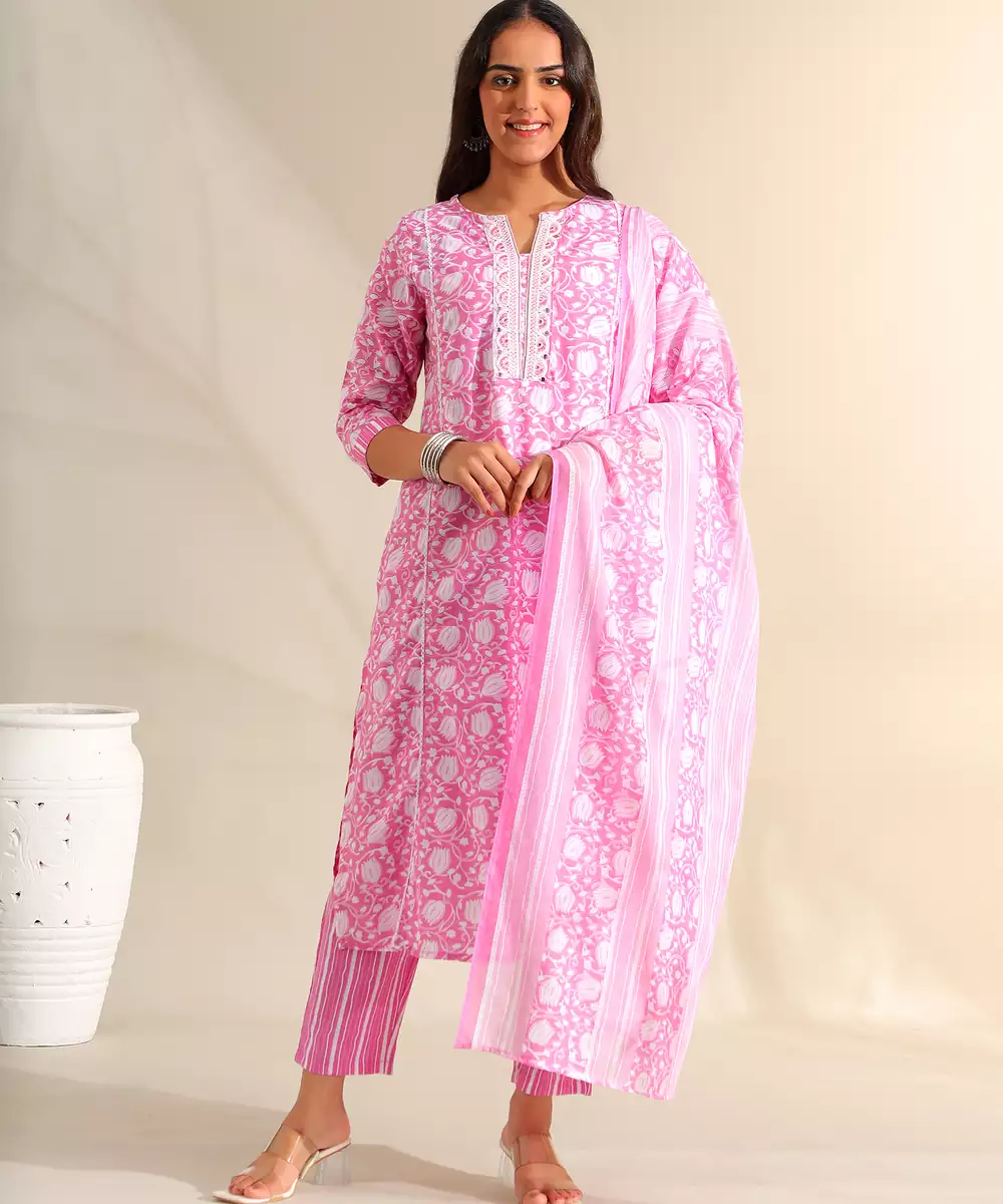 Brighten Your Ethnic Wardrobe With The Ruhi Set, Featuring A Romantic Rose Pink Tulip Floral And Lace Usp. This Charming Suit Set Is Rendered In A Soft Candy Pink Hue And Is Adorned With A Delicate All Over White Tulip Vine Print. The Kurta Is Beautifully Detailed With Intricate White Lace Panels Along The V Neckline And Vertical Bodice Inserts, Creating A Structured And Feminine Aesthetic. The Look Is Completed With Coordinating Vertical Striped Trousers And A Matching Printed Dupatta, Offering A Cohesive And Breezy Silhouette Perfect For Daytime Festivities.