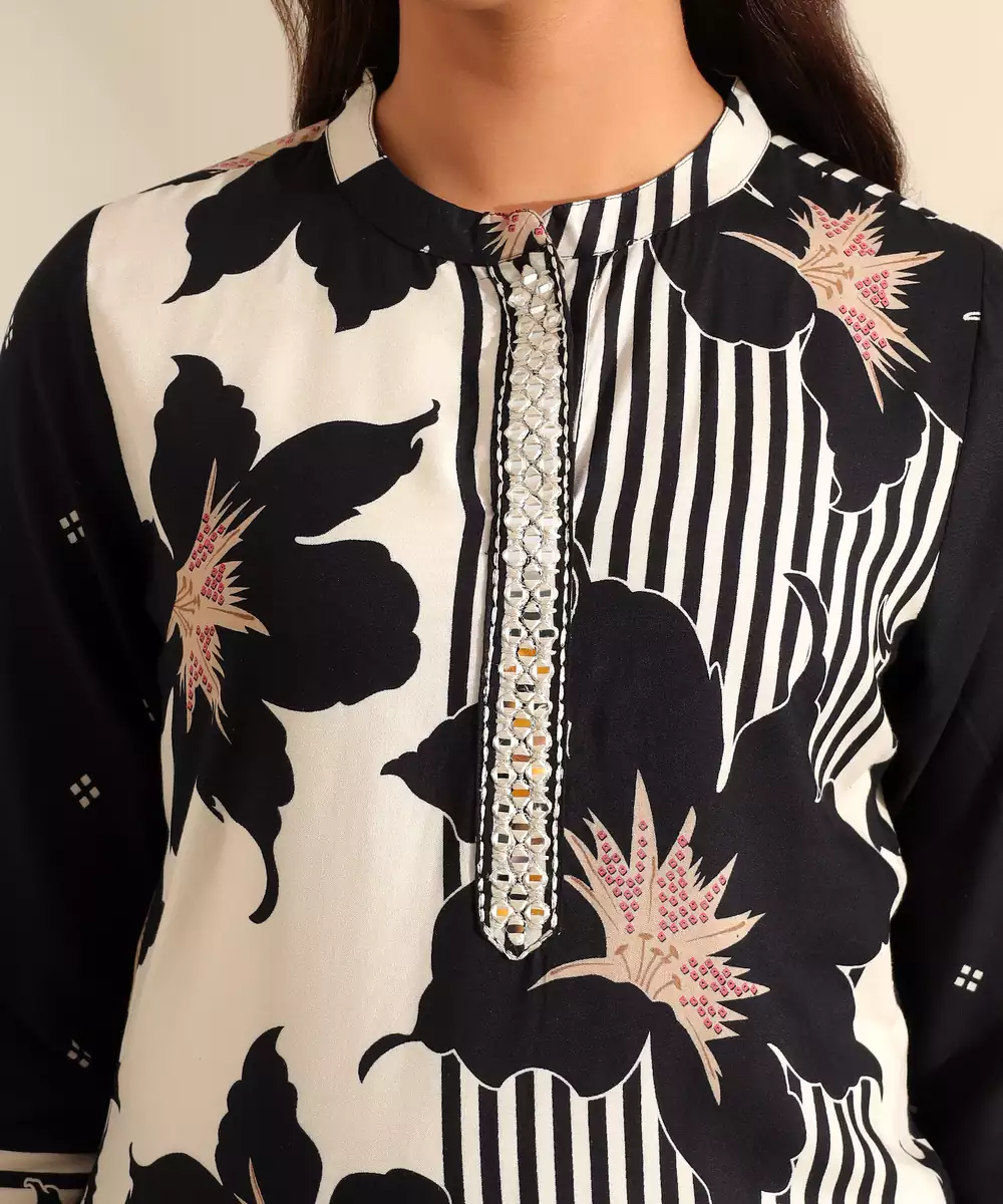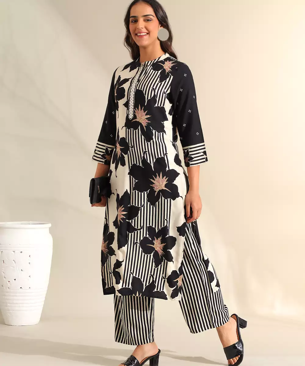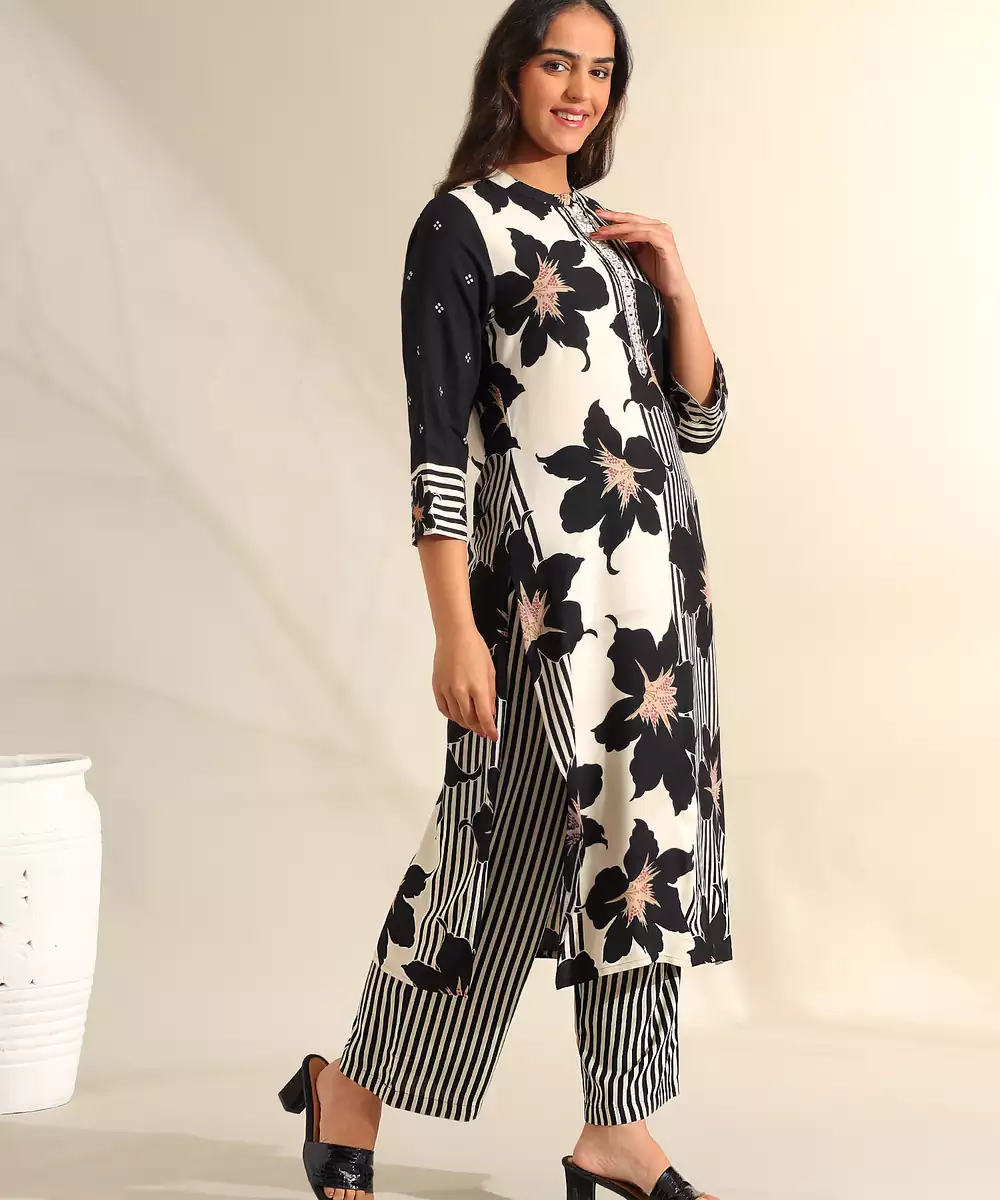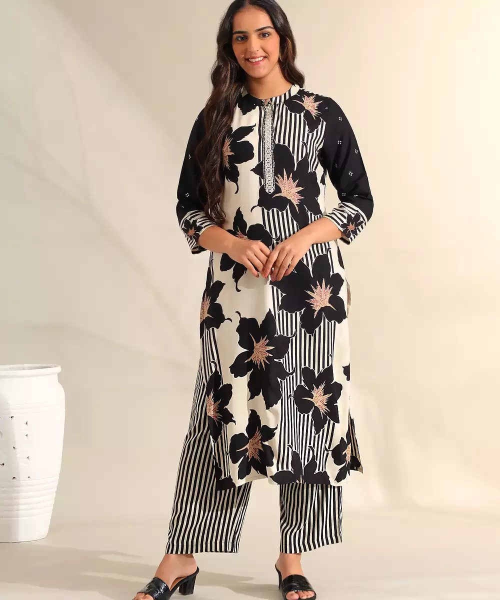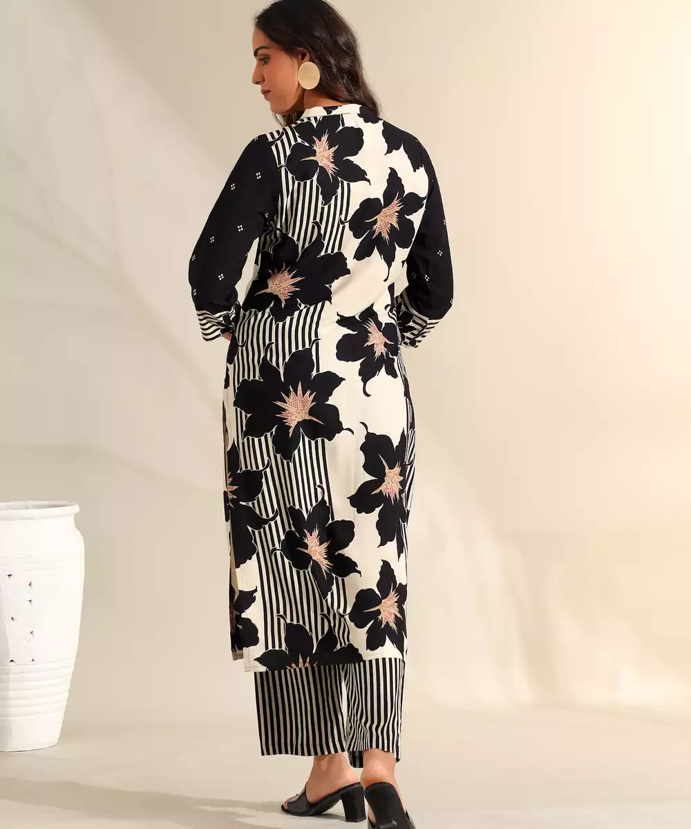Make A Bold, Sophisticated Statement With The Tara Set, Featuring A High Contrast Midnight Bloom Botanical Print Usp. This Contemporary Ensemble Is Rendered In A Classic Ivory And Black Palette, Decorated With Large, Artistic Floral Silhouettes That Are Accented With Subtle Peach And Gold Centers. The Design Is Uniquely Defined By Its Mandarin Collar With A Metallic Embroidered Placket, Adding A Structured And Formal Touch To The Straight Cut Silhouette. It Is Paired With Bold, Vertically Striped Black And White Trousers For A Modern, Fashion Forward Look.