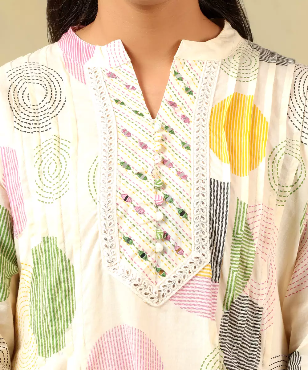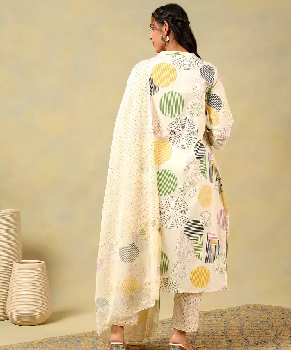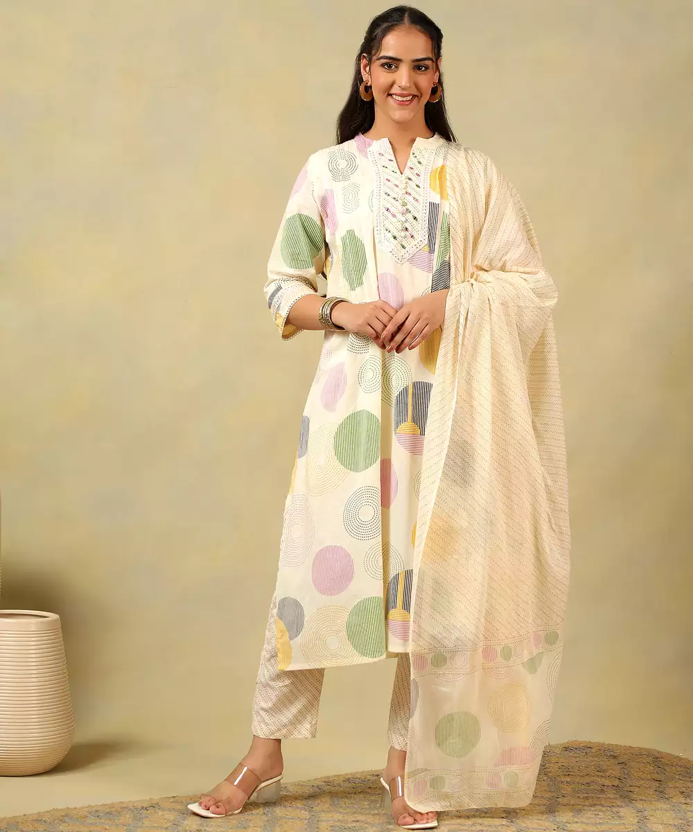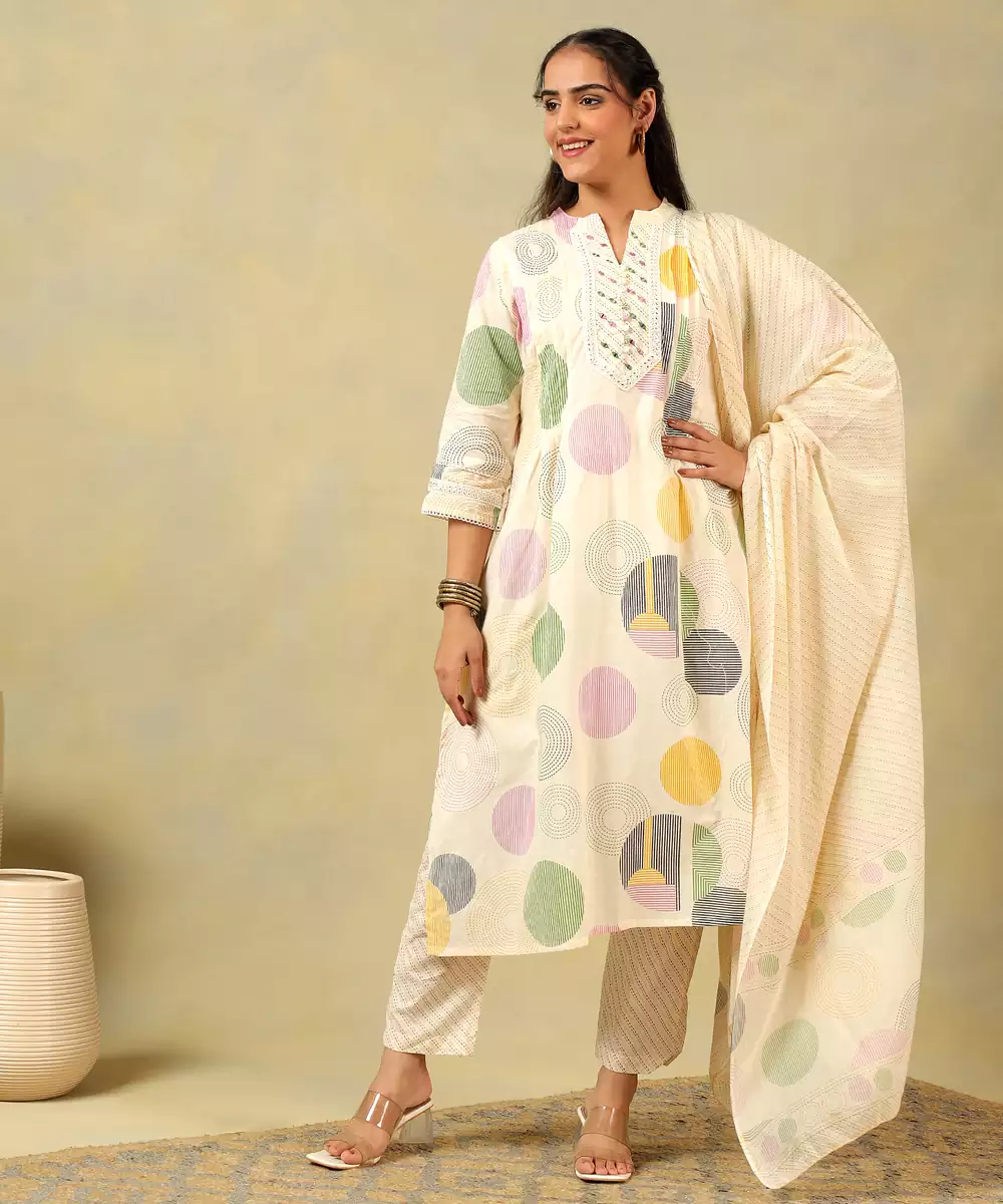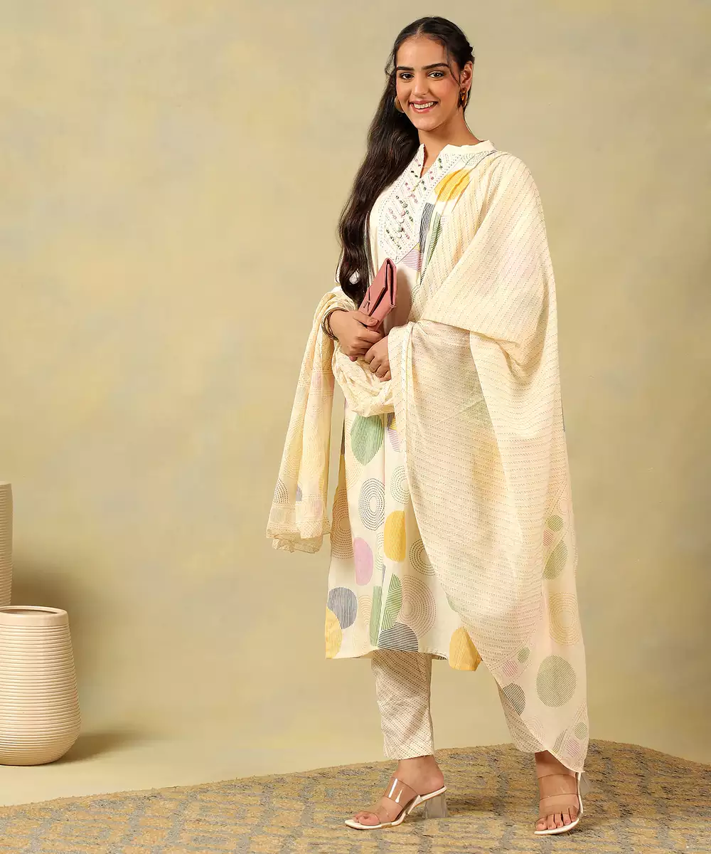 Exude A Soft, Contemporary Charm With Our Tara Set, Showcasing A Unique Pastel Orb Print Usp. This Elegant Ivory Ensemble Is Adorned With Artistic Circular Motifs Featuring Delicate Pinstripes And Dots In A Palette Of Sage Green, Dusty Pink, And Lemon Yellow. The Look Is Refined By An Intricately Embroidered V Notch Neckline And Subtle Lace Inserts, Paired With Micro Patterned Trousers And A Flowing, Coordinated Dupatta For A Light And Airy Traditional Silhouette.
