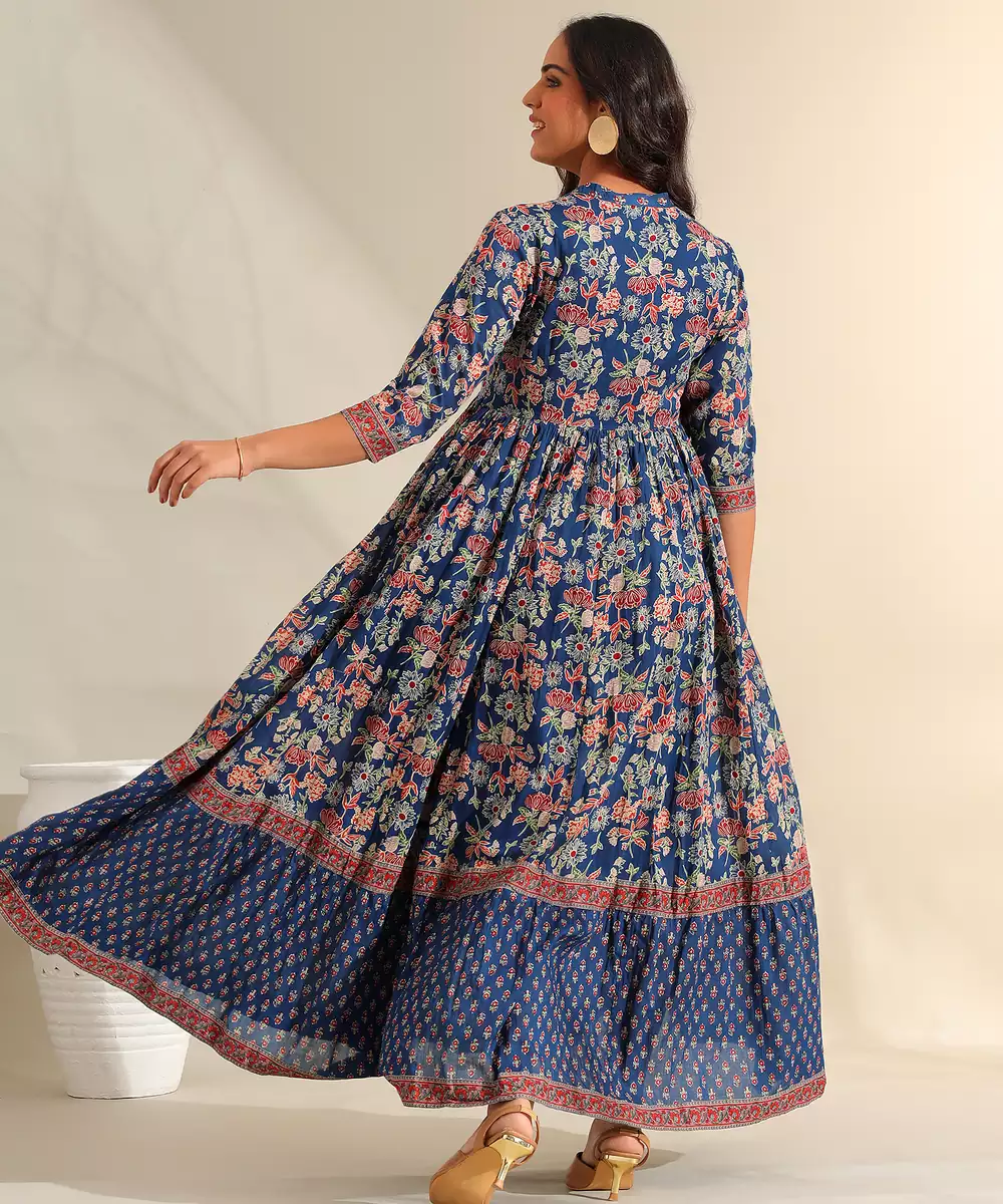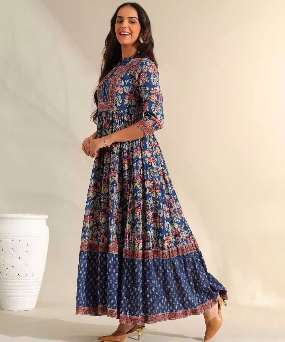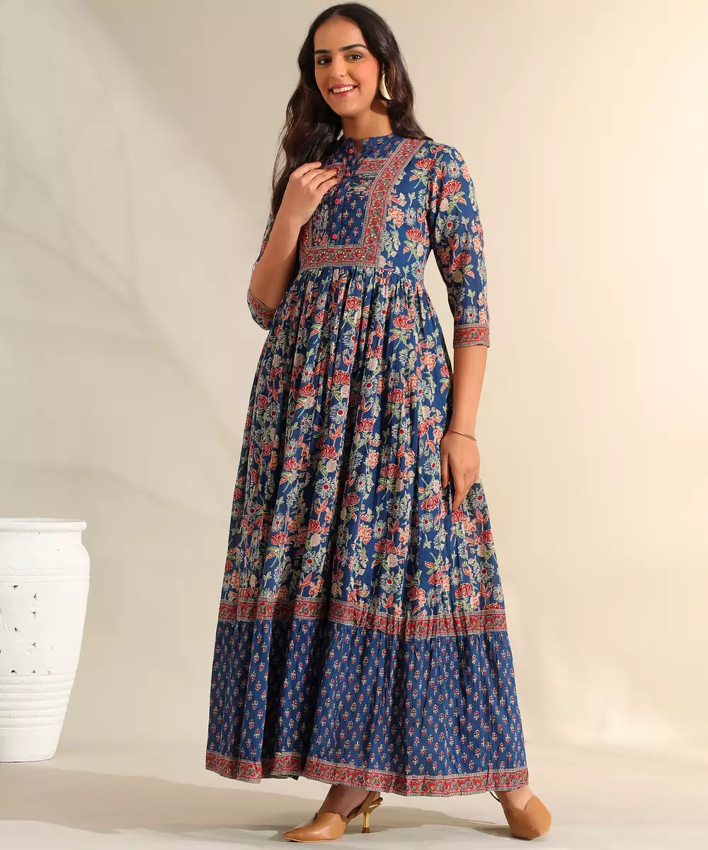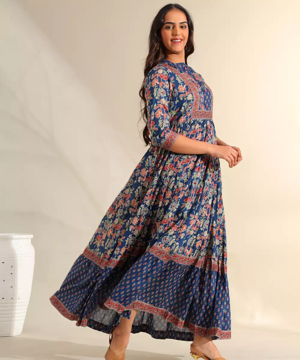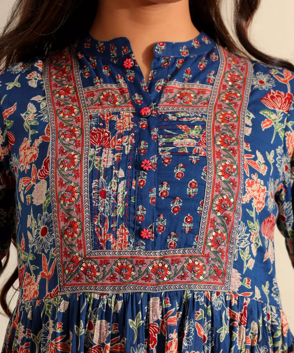 Captivate In The Ziva Dress, Featuring A Sophisticated Indigo Garden Floral And Geometric Mix Usp. This Floor Length Gown Is Rendered In A Deep Indigo Blue, Densely Patterned With Vibrant Pink And Green Floral Blooms That Evoke A Lush Botanical Garden. The Design Is Uniquely Defined By Its Structured Bib Style Bodice With Delicate Red Button Accents And A Mandarin Collar, Leading Into A Voluminous Flared Skirt. The Ensemble Is Finished With A Wide, Contrasting Geometric Print Hemline Border, Adding A Modern, Structured Touch To This Romantic Silhouette.