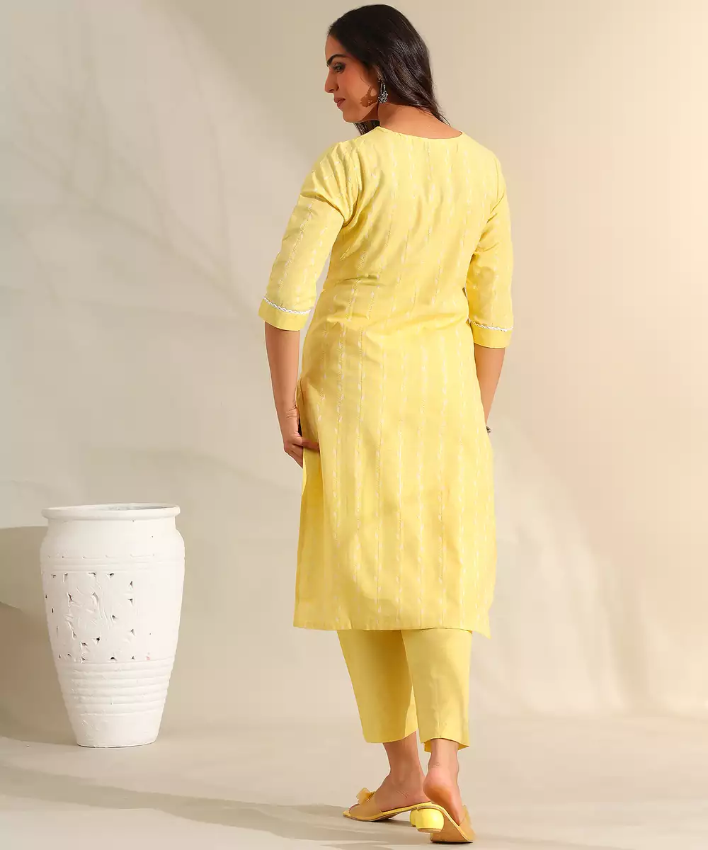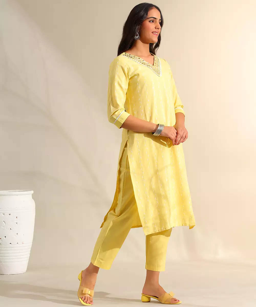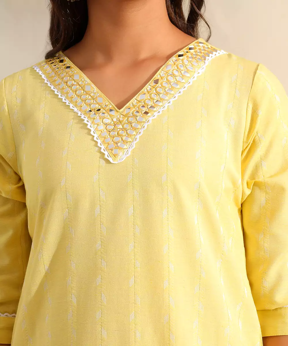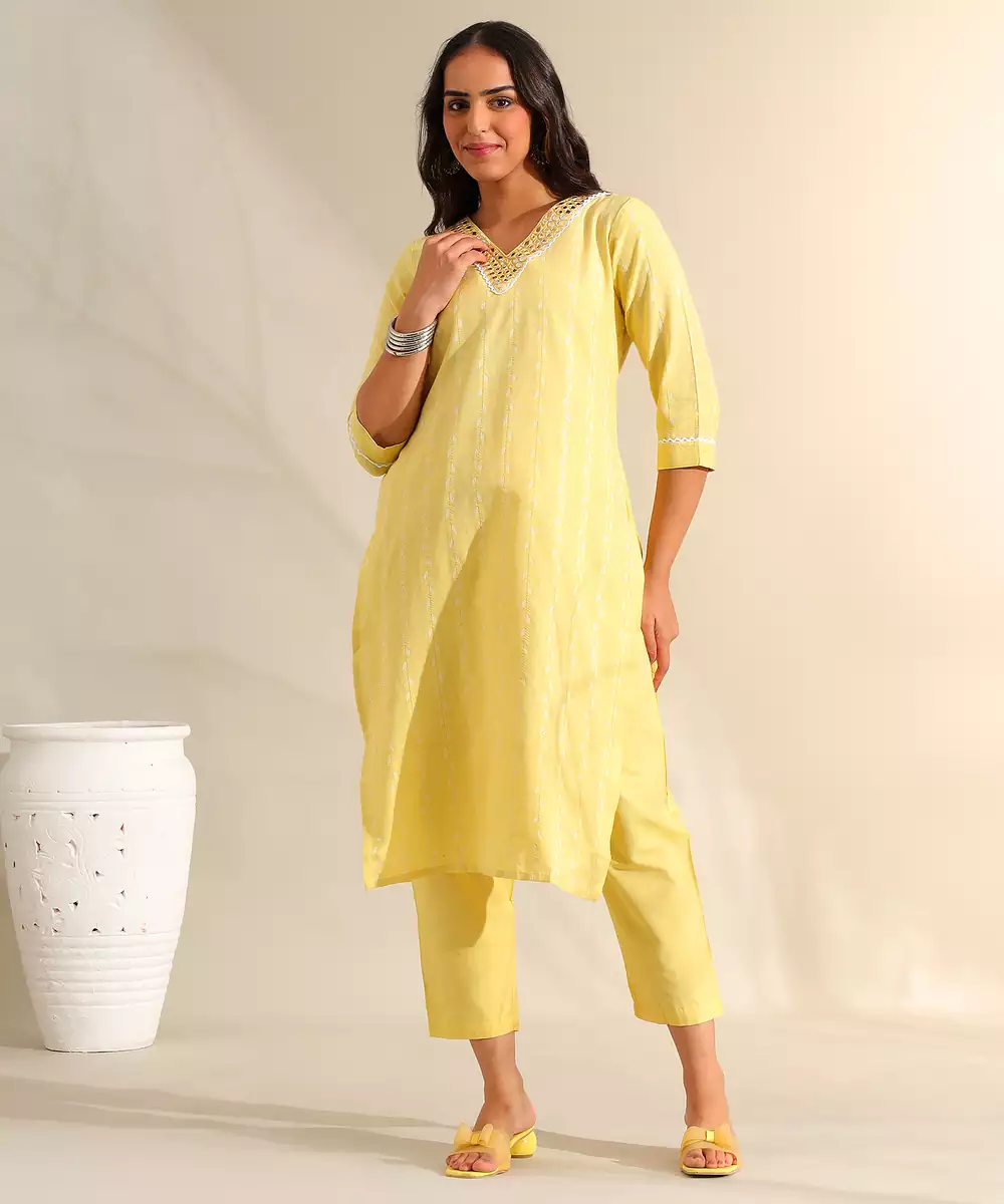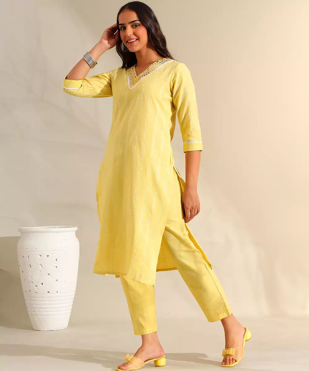 Brighten Your Casual Ethnic Wardrobe With The Zoya Kurta Set, Featuring A Subtle Yet Elegant Lemon Zari Stripe Usp. This Sunny Yellow Kurta Is Crafted With Vertical Self Textured Stripes That Add A Hint Of Shimmer And Height To The Straight Cut Silhouette. The Design Is Beautifully Highlighted By An Intricate Gold Gota Work V Neckline, Offering A Touch Of Festive Sparkle. It Is Paired With Coordinating Solid Yellow Trousers And Features Delicate White Lace Edging On The Sleeves For A Clean, Minimalist Finish.