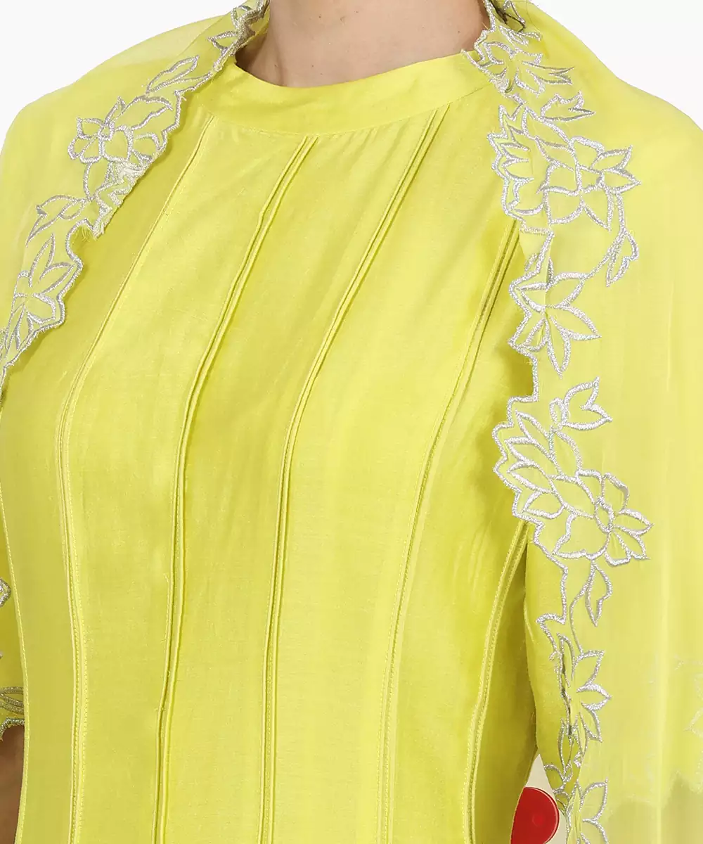 Double Piping Kalidar With Thick Tonal Border And Cut Out Back Paired With Stretch Churidar And Delicate Organza Dupatta With Floral Zari Work In Gold And Scalopped Edges .