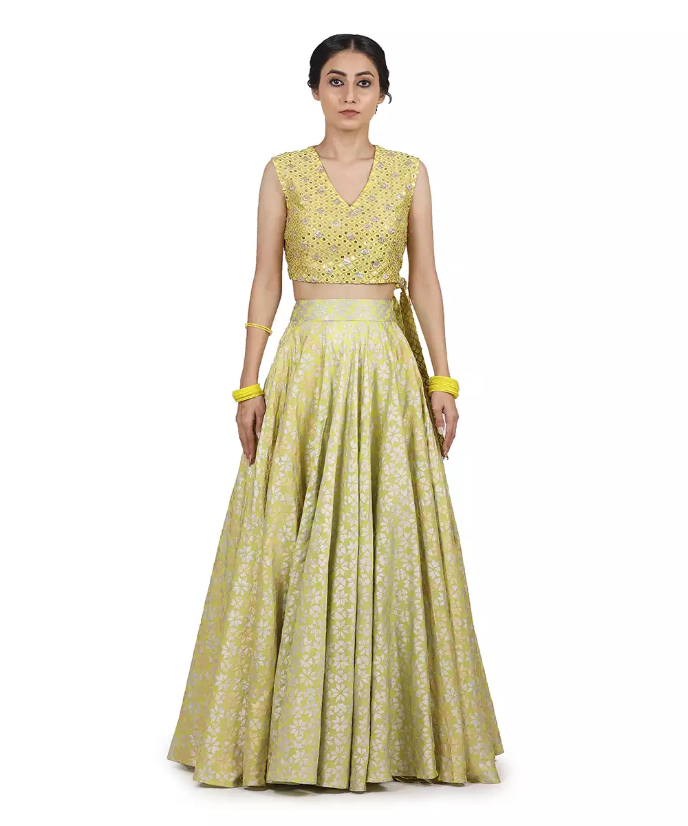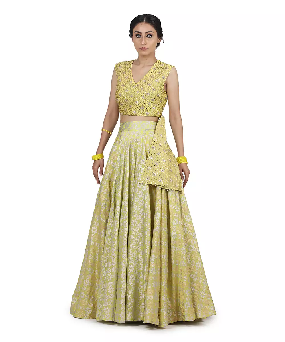 High Waisted Printed Skirt With Cropped Blouse With Belt Detailing Adorned By Intricate Hand Embroidery Paired With Heavy Printed Dupatta With Gota Patti Work .