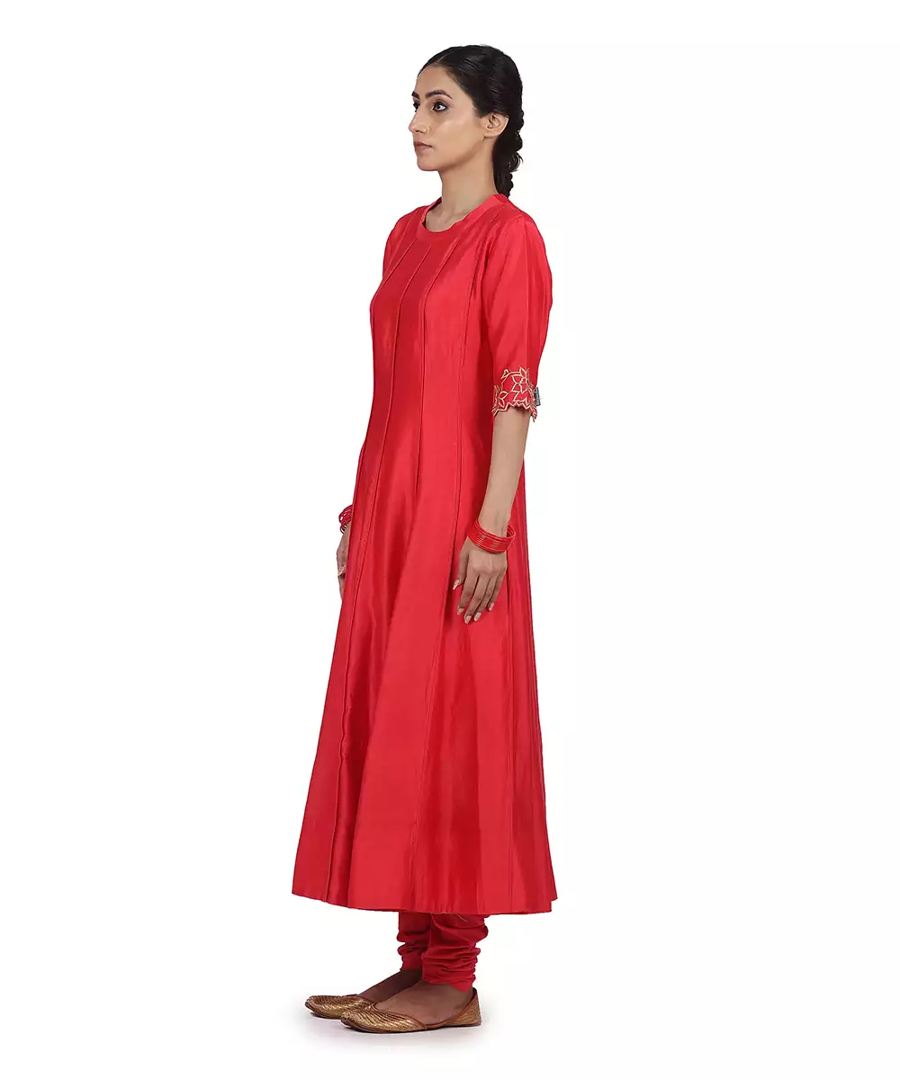 Double Piping Kalidar With Thick Tonal Border And Cut Out Back Paired With Stretch Churidar And Delicate Organza Dupatta With Floral Zari Work In Gold And Scalopped Edges .