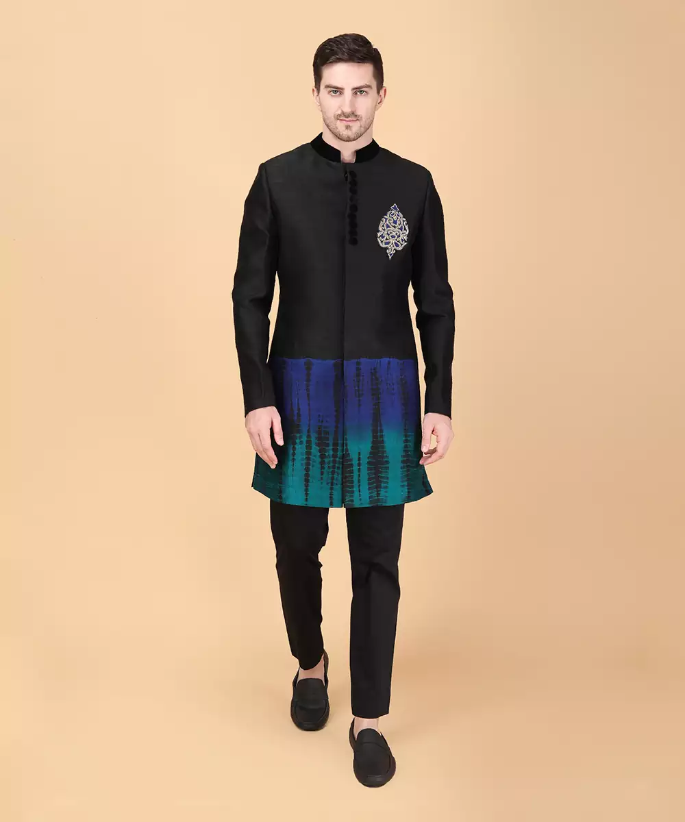 Featuring Tie & Dye Indowestern Bandhgala With Hand Embroidery Motif On Chest, It Is Paired With Pants.