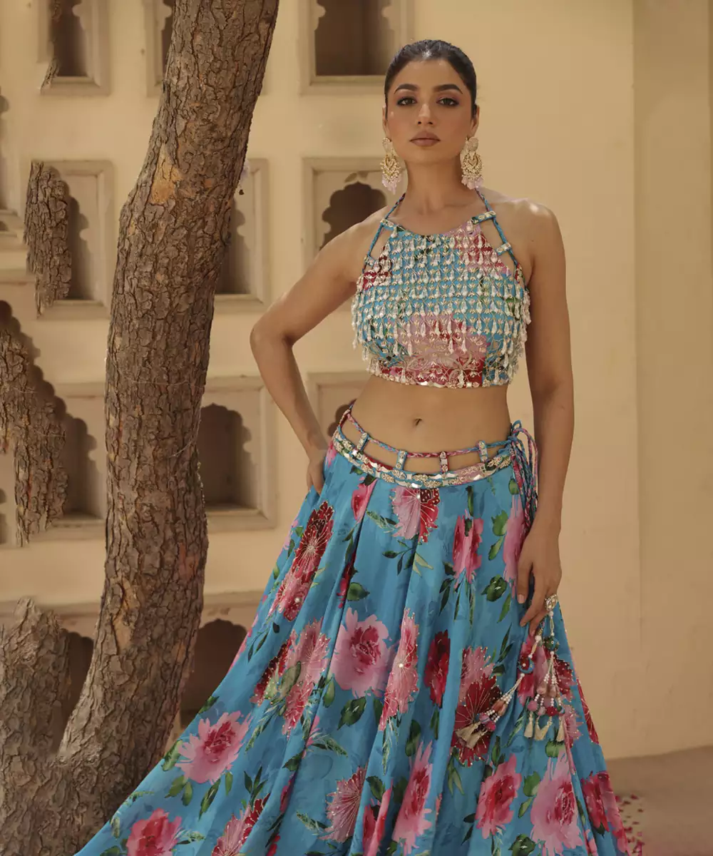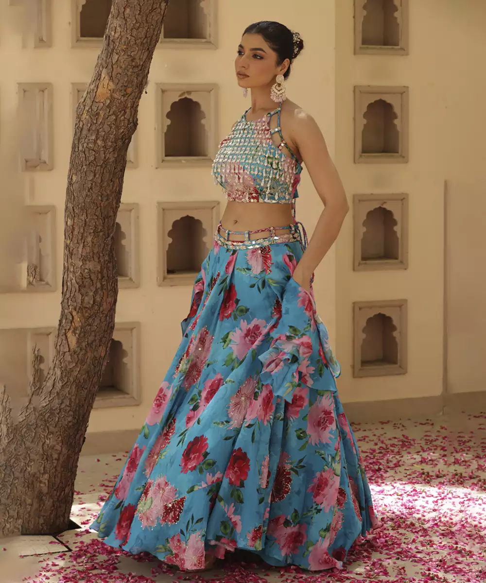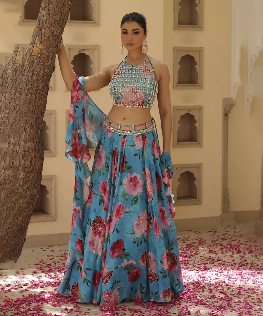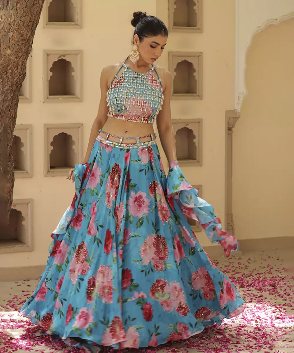 The Blue Floral Printed Chiffon Lehenga With Embroidered Blouse Is A Captivating Ensemble That Perfectly Combines Delicate Charm With Refined Elegance. Crafted From Soft, Flowy Chiffon, The Lehenga Showcases A Beautiful Floral Print In Varying Shades Of Blue, Creating A Fresh And Romantic Appeal Ideal For Daytime Festivities, Pre Wedding Events, Or Destination Celebrations.