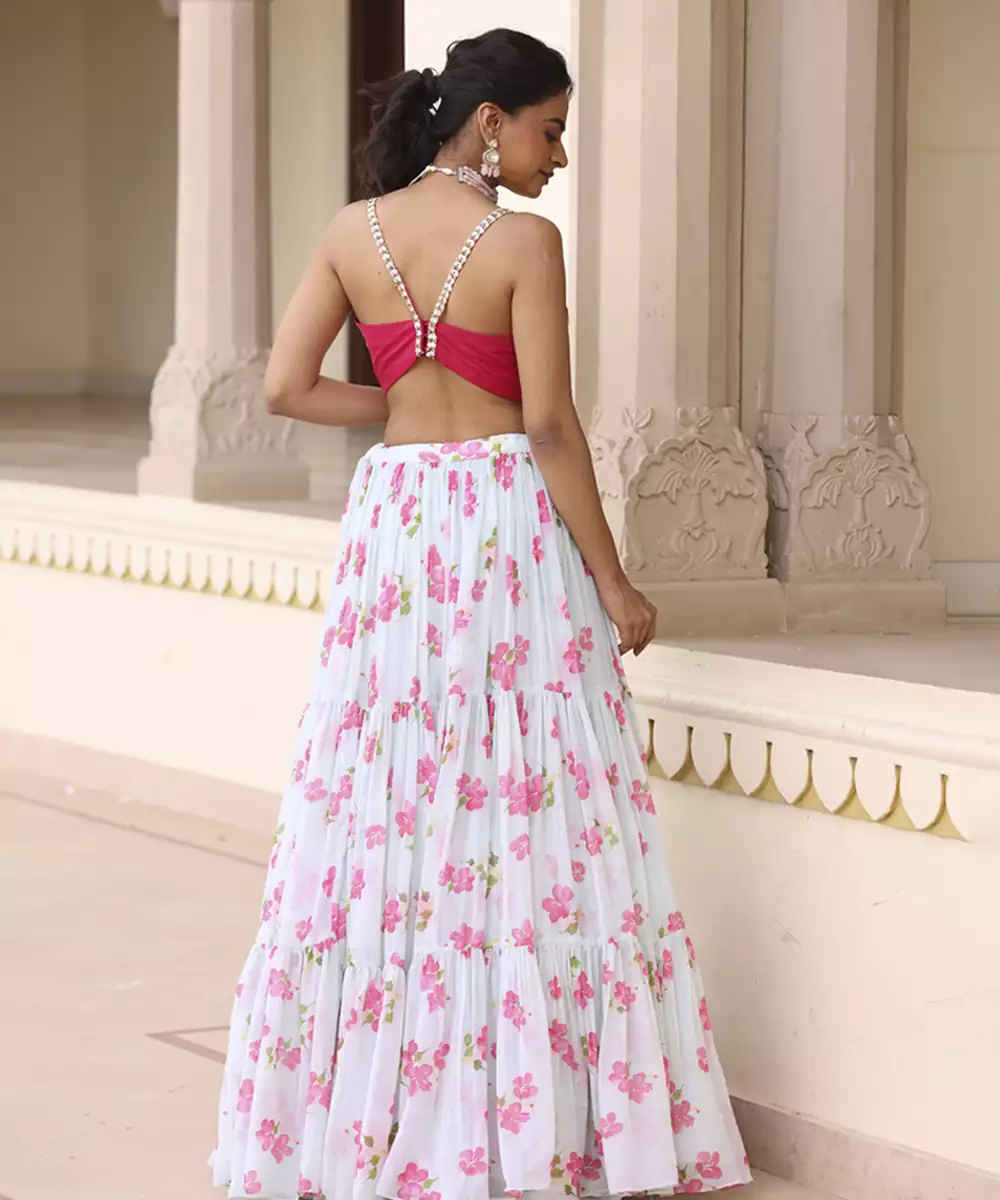 The Light Green Floral Printed Chiffon Lehenga With Embroidered Blouse Is A Graceful And Refreshing Ensemble That Blends Modern Aesthetics With Timeless Elegance.The Light Green Floral Printed Chiffon Lehenga With Embroidered Blouse Is A Graceful And Refreshing Ensemble That Blends Modern Aesthetics With Timeless Elegance.