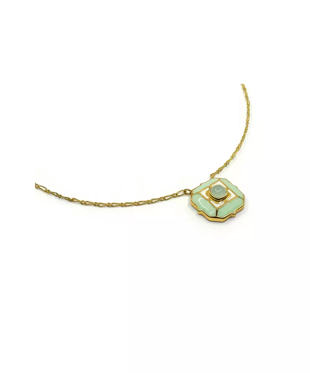 This Song Of Summer Neckchain Is Handcrafted 92.5% Sterling Silver Studded With Green Calcedony Gemstone Set Amidst Beautiful Pastel Enamels. It Has Thick Gold Plating. The Size Of Pendant Is 1.8 Cm X 1.2 Cm Attached To A 40 Cm Neckchain With Adjustable 5 Cm Links And A Ring Clasp Lock Mechanism.