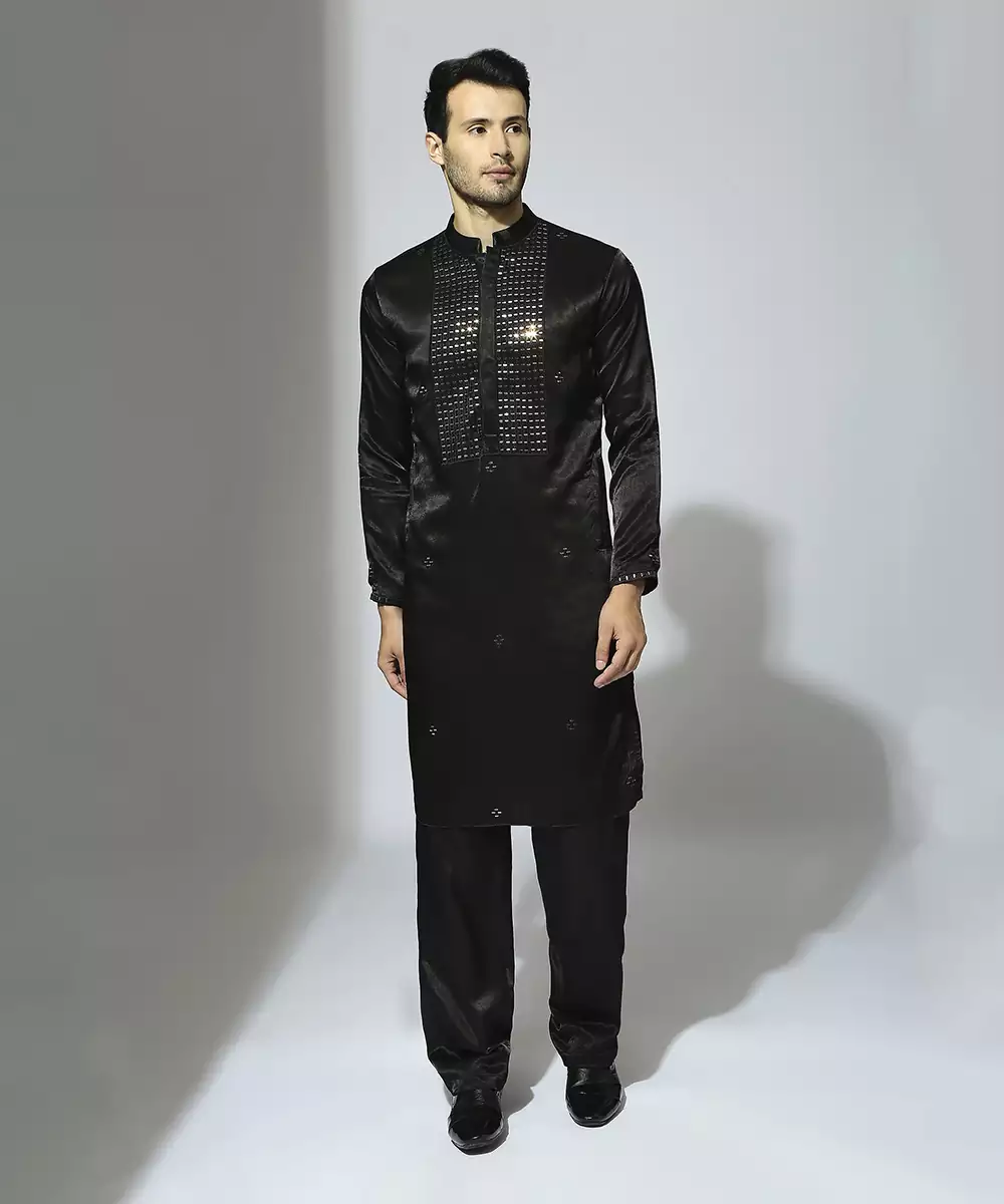 Sequin Hand Embroidered Kurta Set With Pants Colour: Black Fabric: Mashru Silk Components: 1 Kurta , 1 Pant Work: Sequin Work