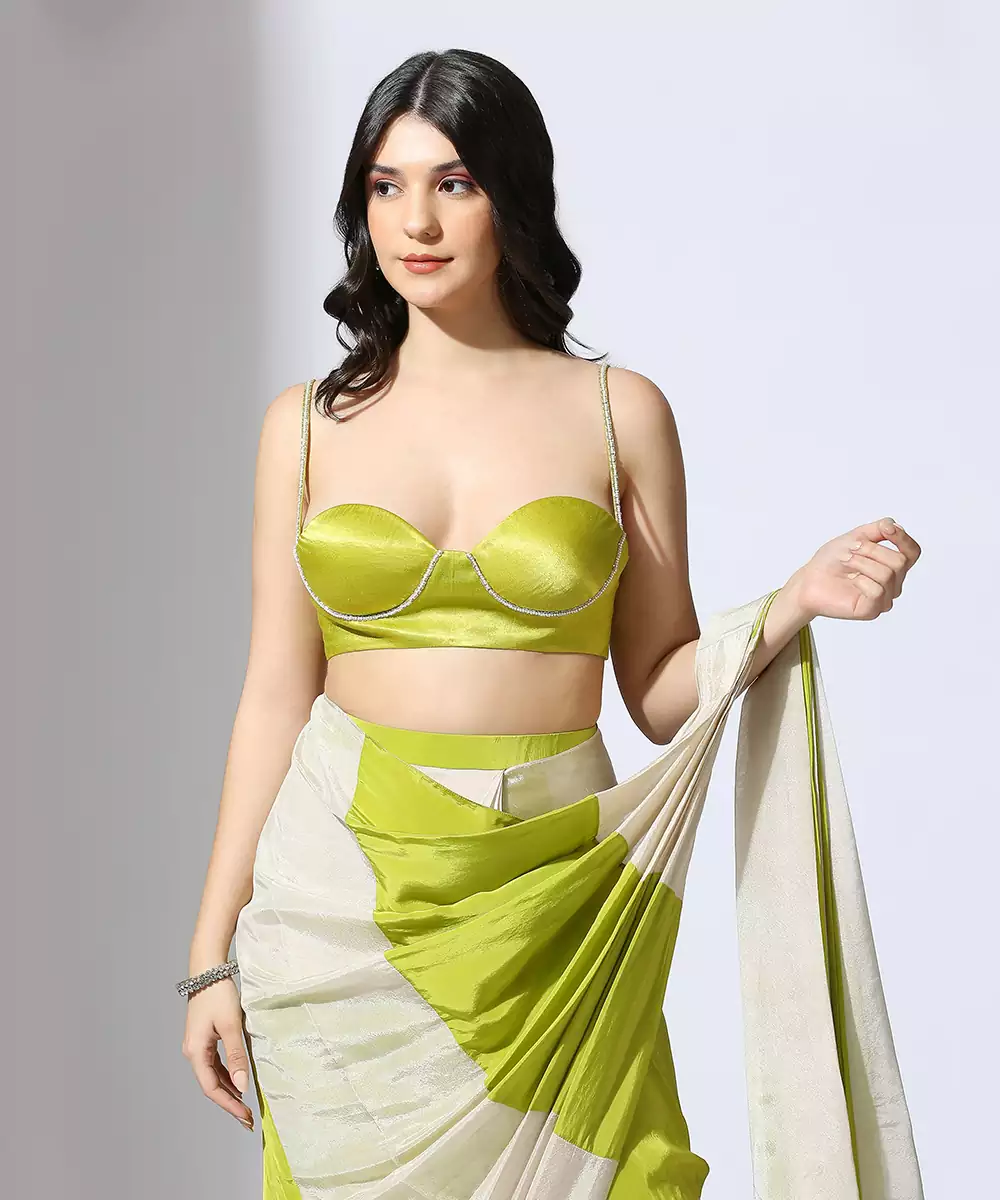 Saree Set Featuring Lime Green And Beige Striped Saree Paired With Embroidered Bustier Styled Blouse.
