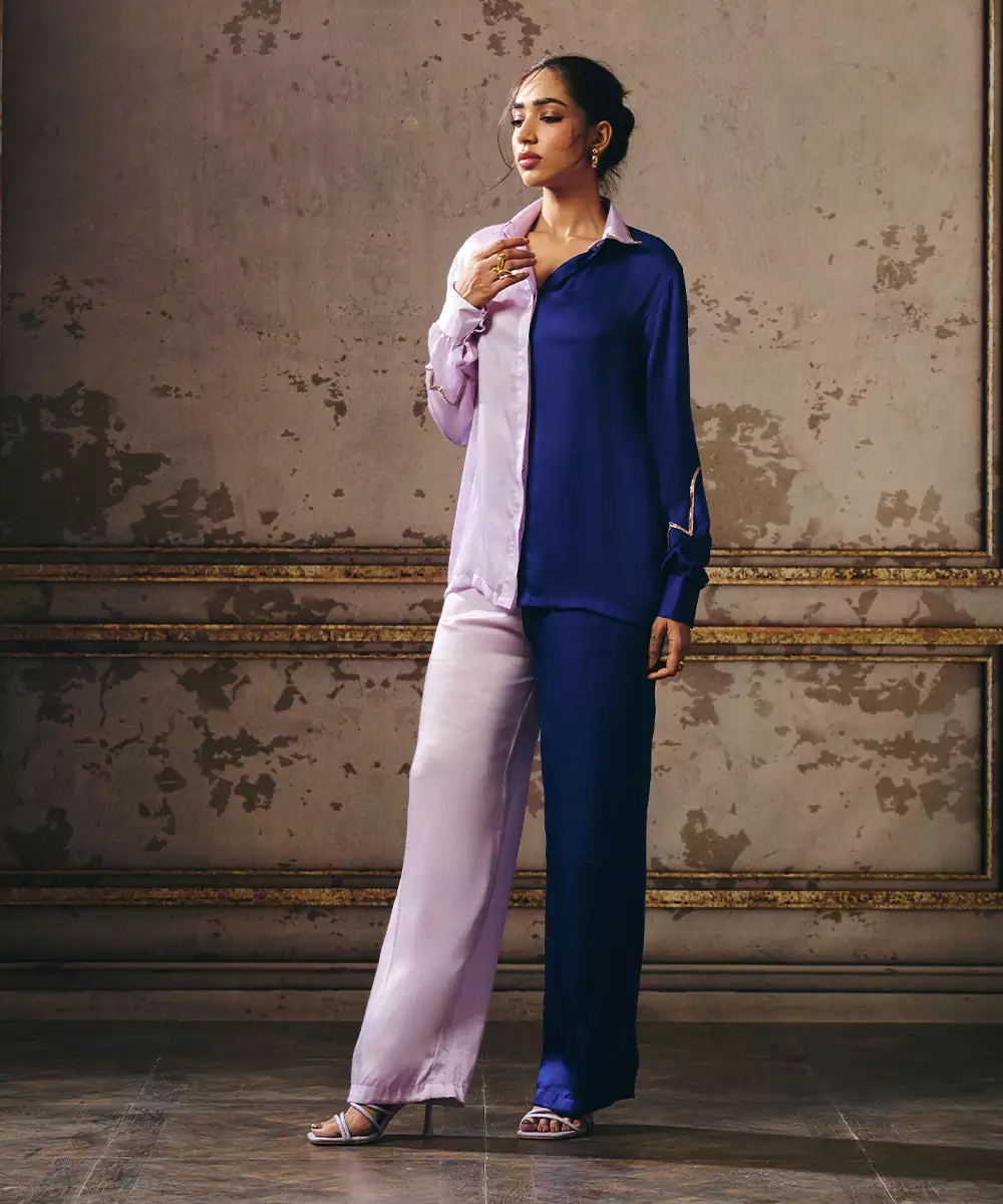 Lilac And Navy Blue Co Ord Set Colour: Lilac Fabric: Silk Blend Components : 1 Shirt / 1 Pant