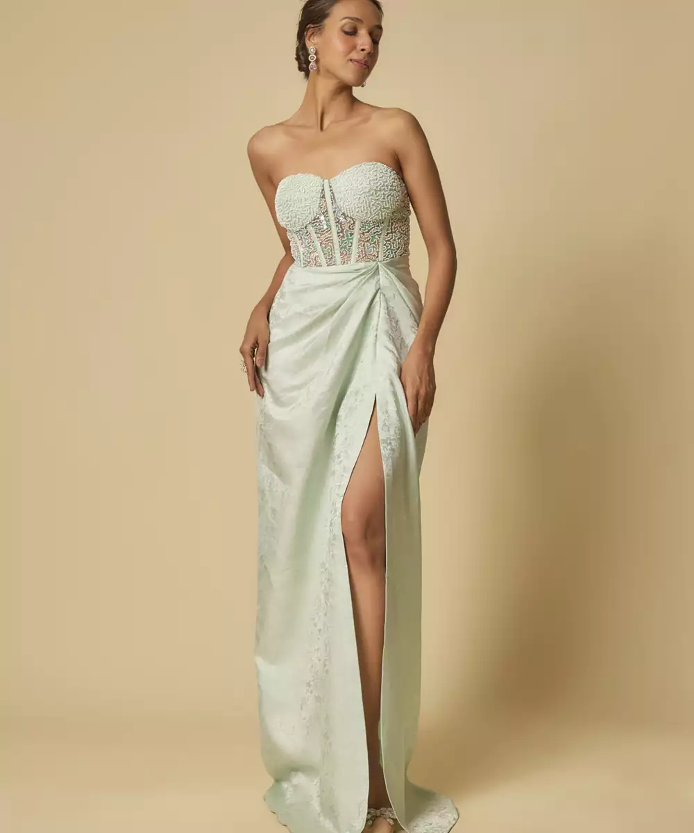 Featuring Mint Brocade Embroidered Corset Drape Gown Witn Embroidered Tulle Cape Colour: Sea Green Fabric: Jacquard Components : 1 Gown / 1 Cape