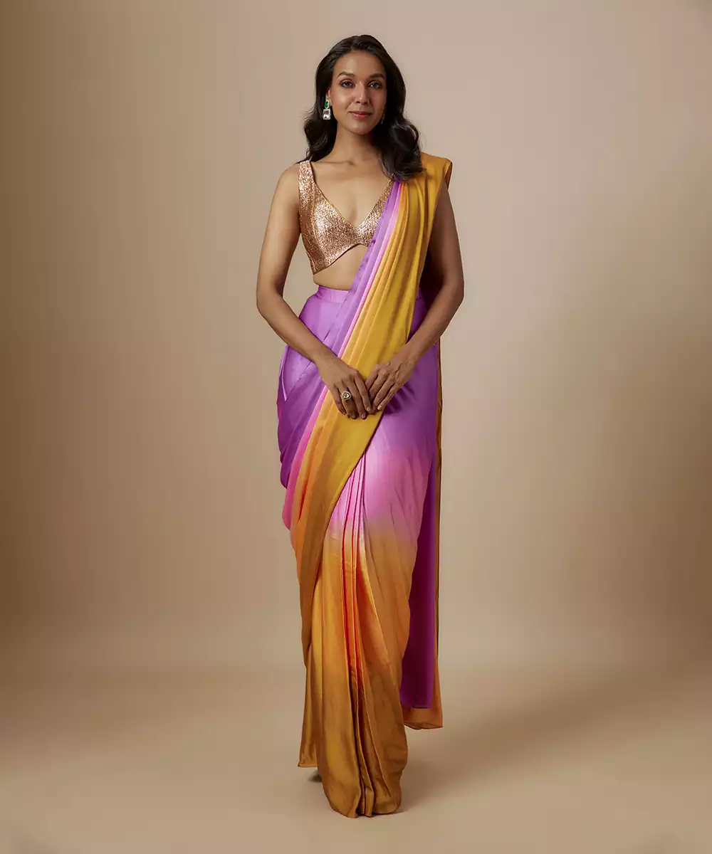 Featuring Mustard To Purple Ombre Saree With Badla Embroidered Blouse