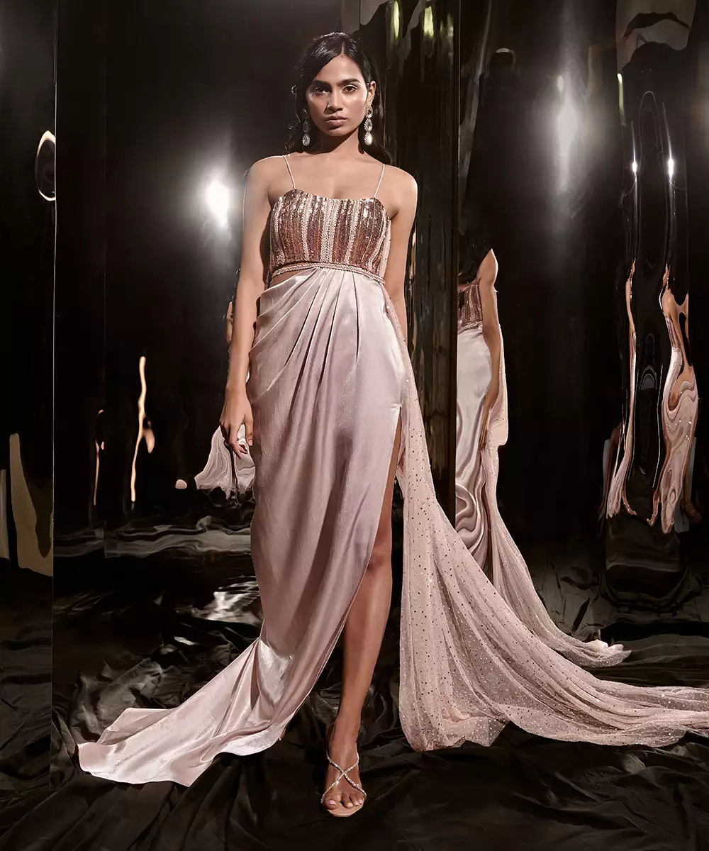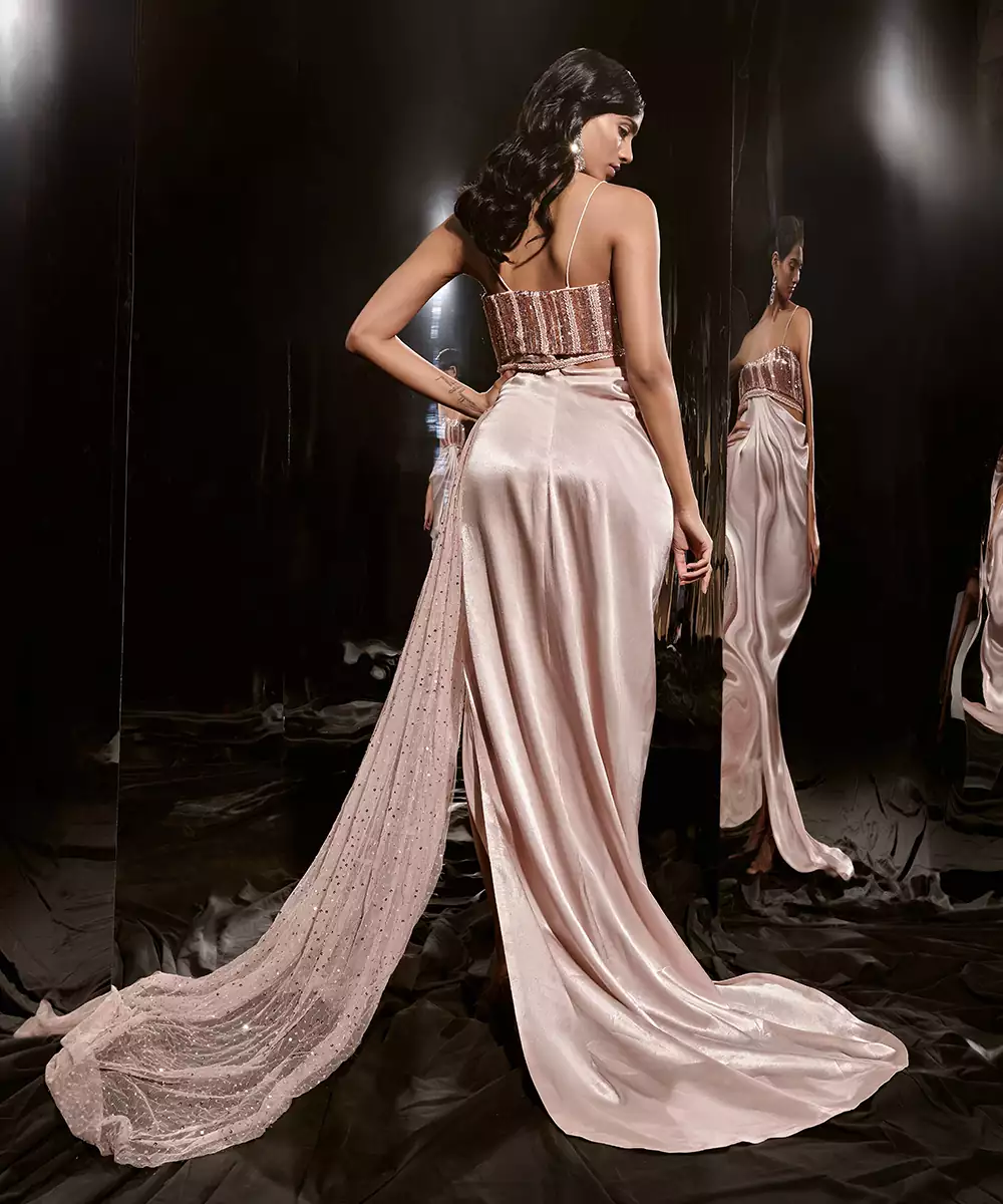 Featuring Pinkish Nude Embroidered Dress In Mashroo Silk With Net Drape.