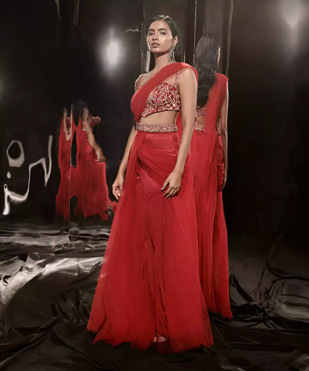 Featuring Red Sharara Pre Draped Saree In Net With Shantoon Base. It Is Paired With Embroidered Blouse In Mashroo Silk , Waist Belt And Sling Bag.