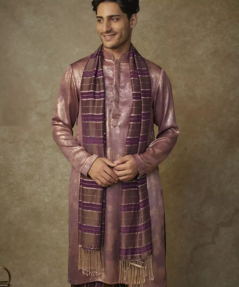 Featuring Wine Foil Kurta With Tissue Stipe Dhoti With Dupatta Colour: Purple Fabric: Viscose Components : 1 Kutra / 1 Dhoti / 1 Dupatta