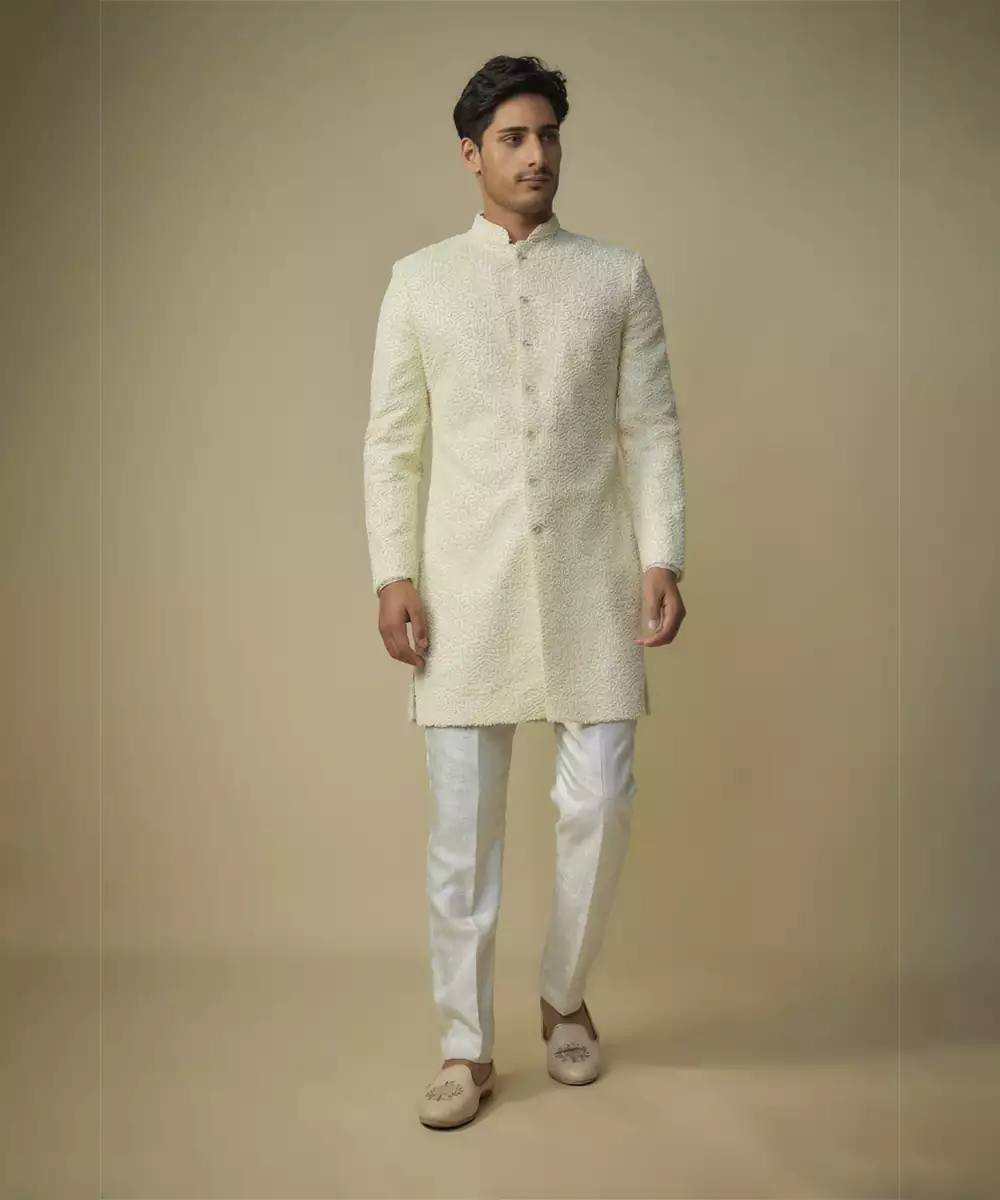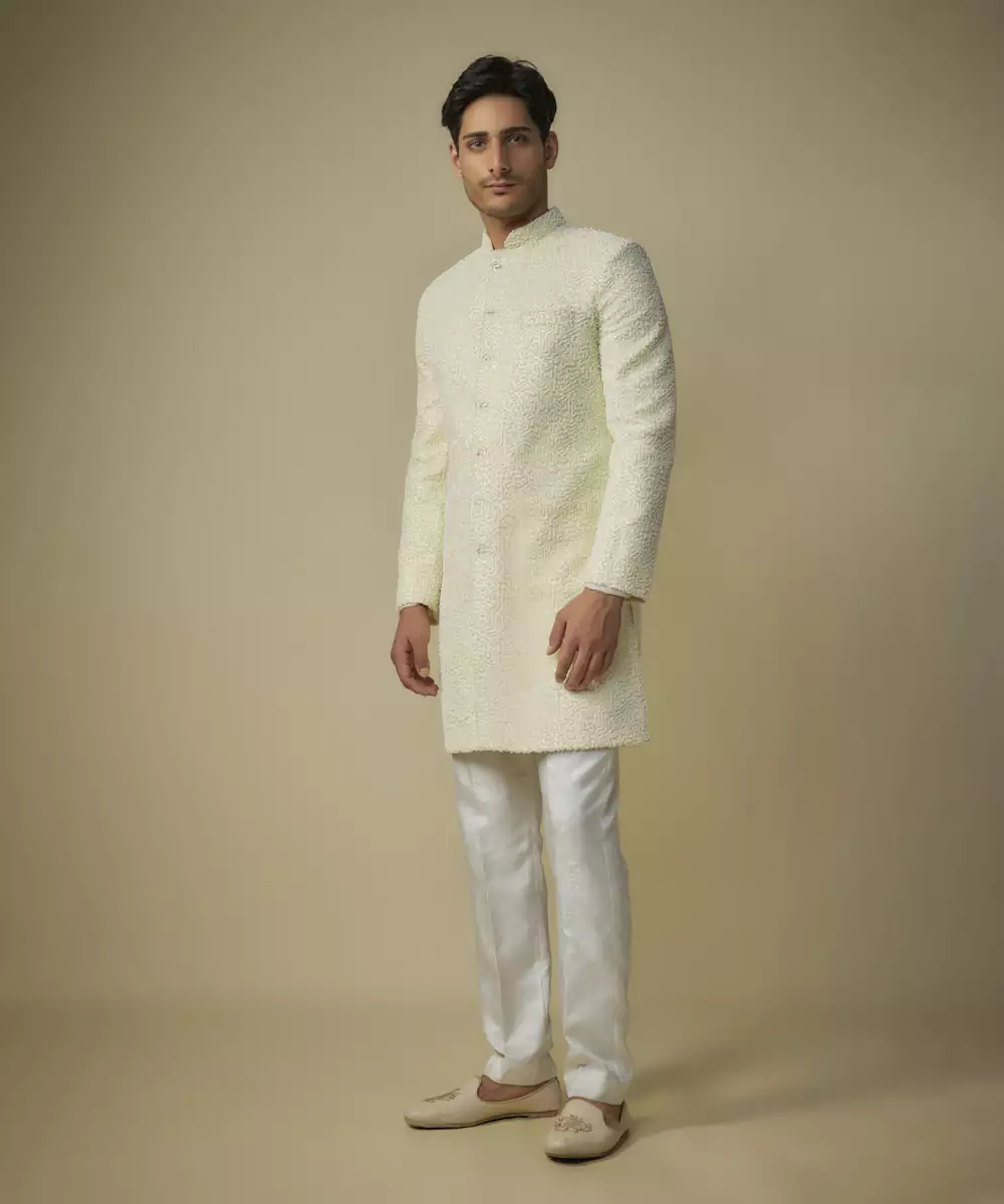 Featuring Yellow Embroiderd Sherwani With White Broquade Pant Colour: Yellow Fabric: Viscose Components : 1 Kurta / 1 Pant