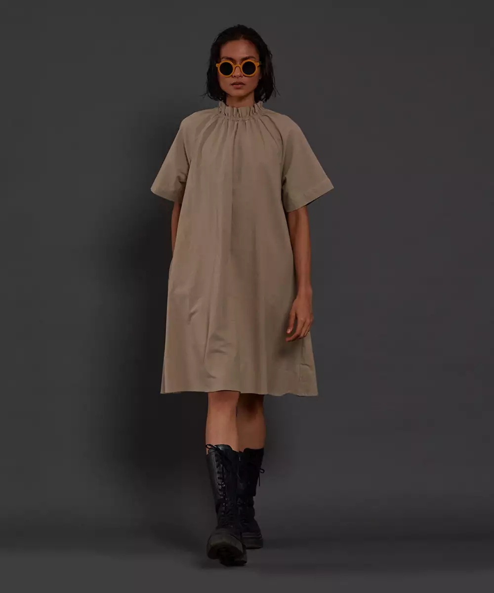 Midi Length Shift Dress With Elasticated Neckline And Raglan Sleeves. Comes With Side Pockets.