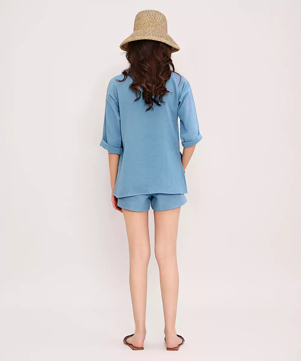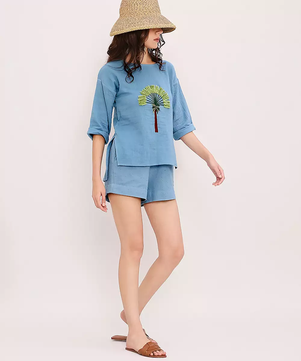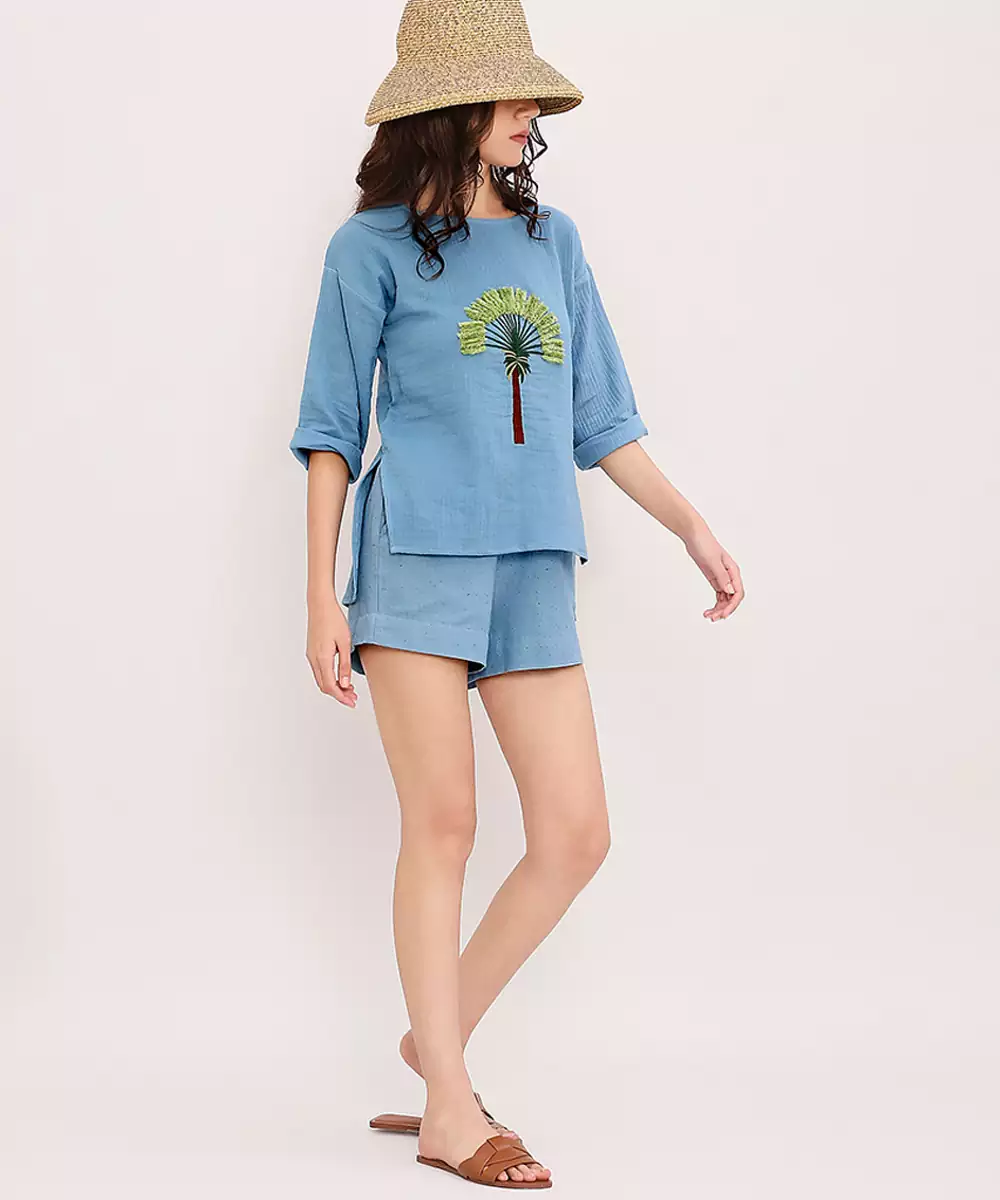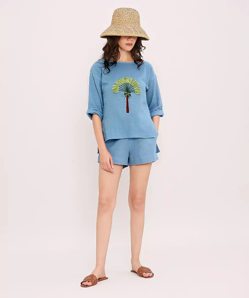 This Blue Embroidered Cotton Top Blends Comfort With Understated Elegance. Crafted From Soft, Breathable Cotton, It Features Delicate Embroidery That Adds A Refined Touch. Its Versatile Silhouette Makes It Perfect For Casual Outings, Workdays, Or Festive Gatherings, Offering Effortless Style, All Day Comfort, And A Timeless Appeal Suitable For Any Wardrobe.